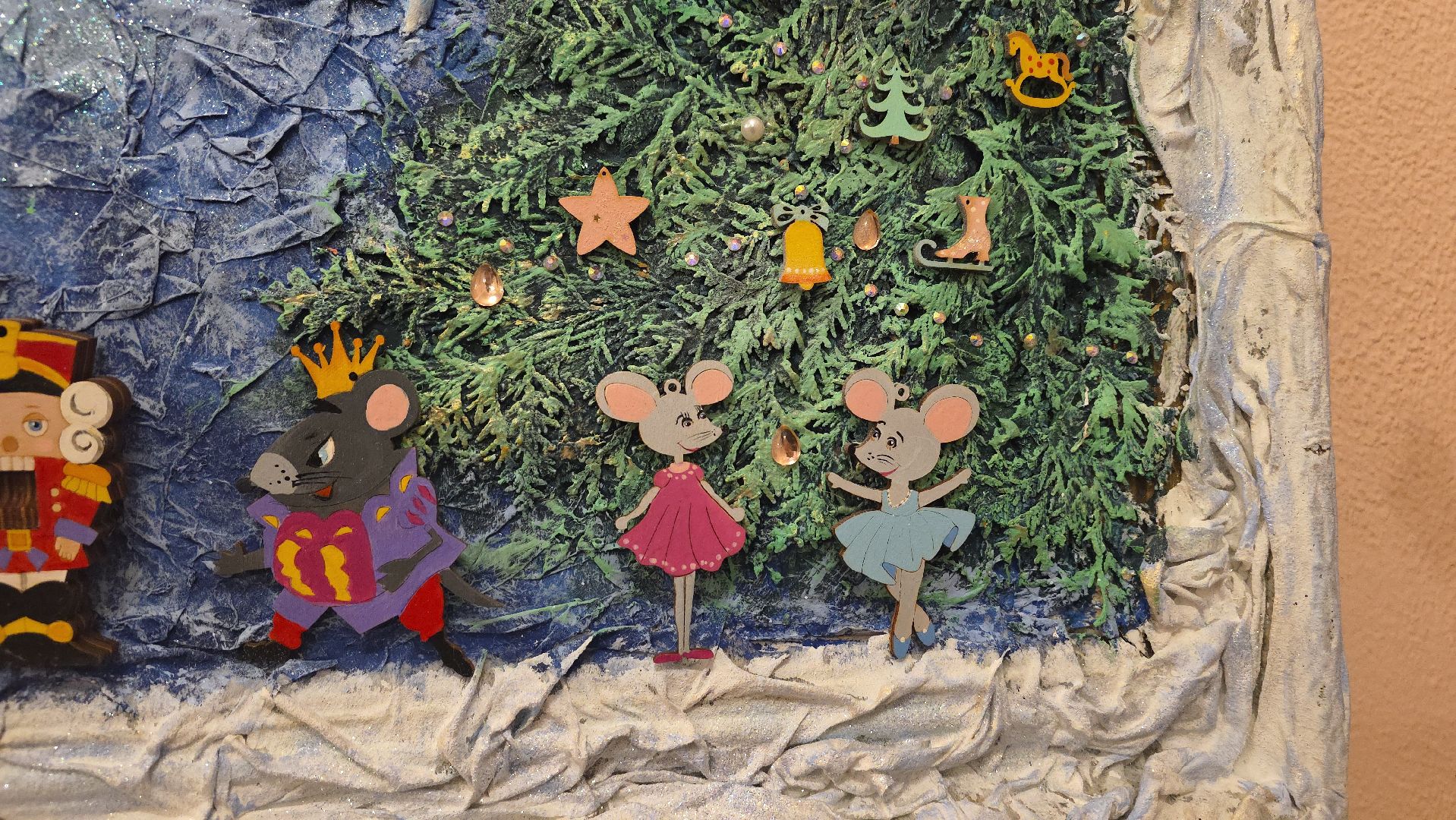 В Культурно-эстетическом центре Дзержинского городского округа Люберцы зажглись ёлочные гирлянды, а выставочные залы превратились в страну сказок. На стенах — «Снежная королева» юных мастеров: тонкие линии горячего батика, превратившие шёлк в ледяной сюжет. Рядом «Щелкунчик» — холодный батик, дополненный куклой Машей в сшитом вручную платье и крошечной шторкой, прикрывающей раму картины, словно кадр из спектакля. А чуть дальше — лунная ночь в технике пуантилизма, собранная из тысячи цветных точек, как пазл, который складывал автор картины.