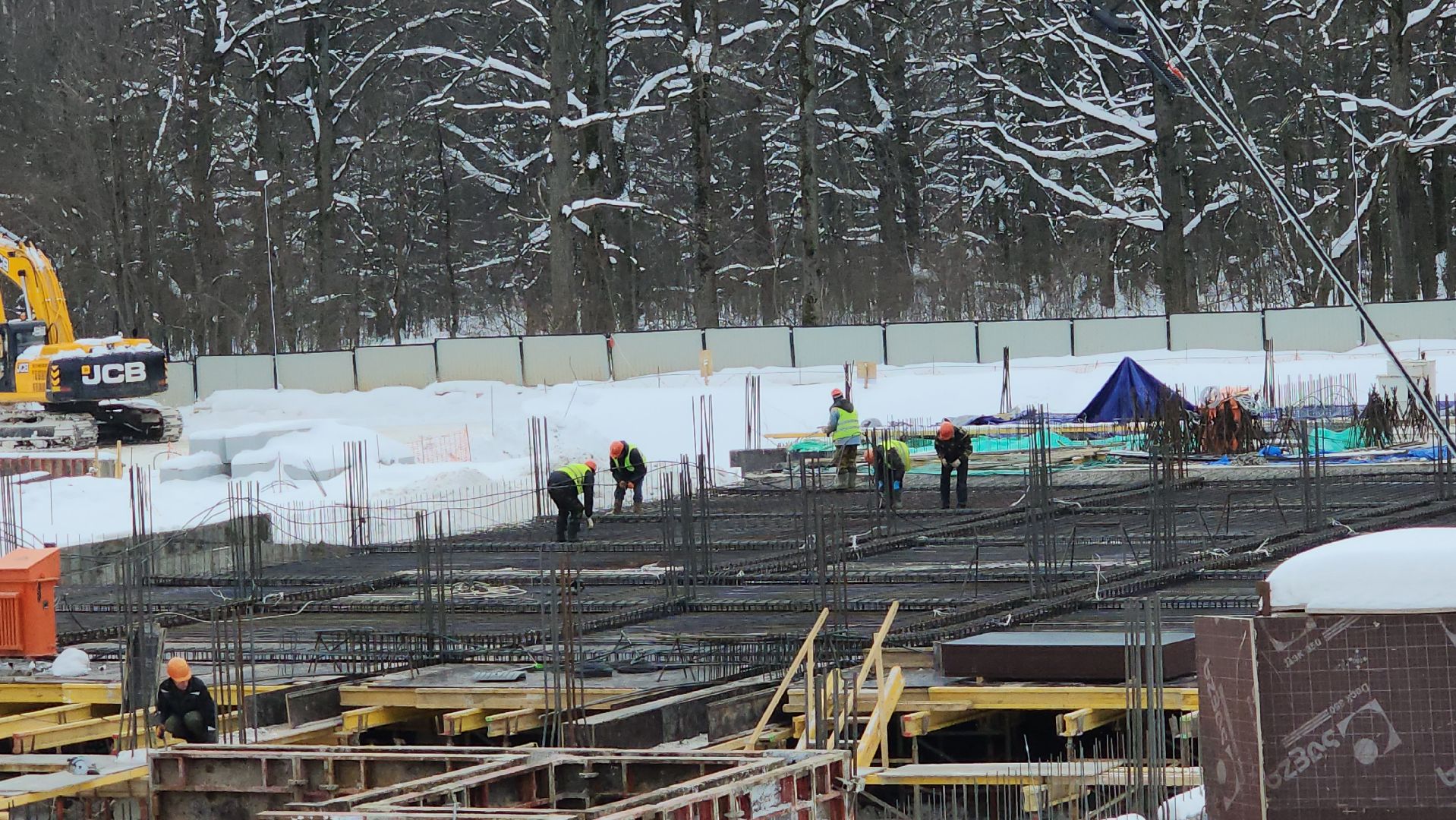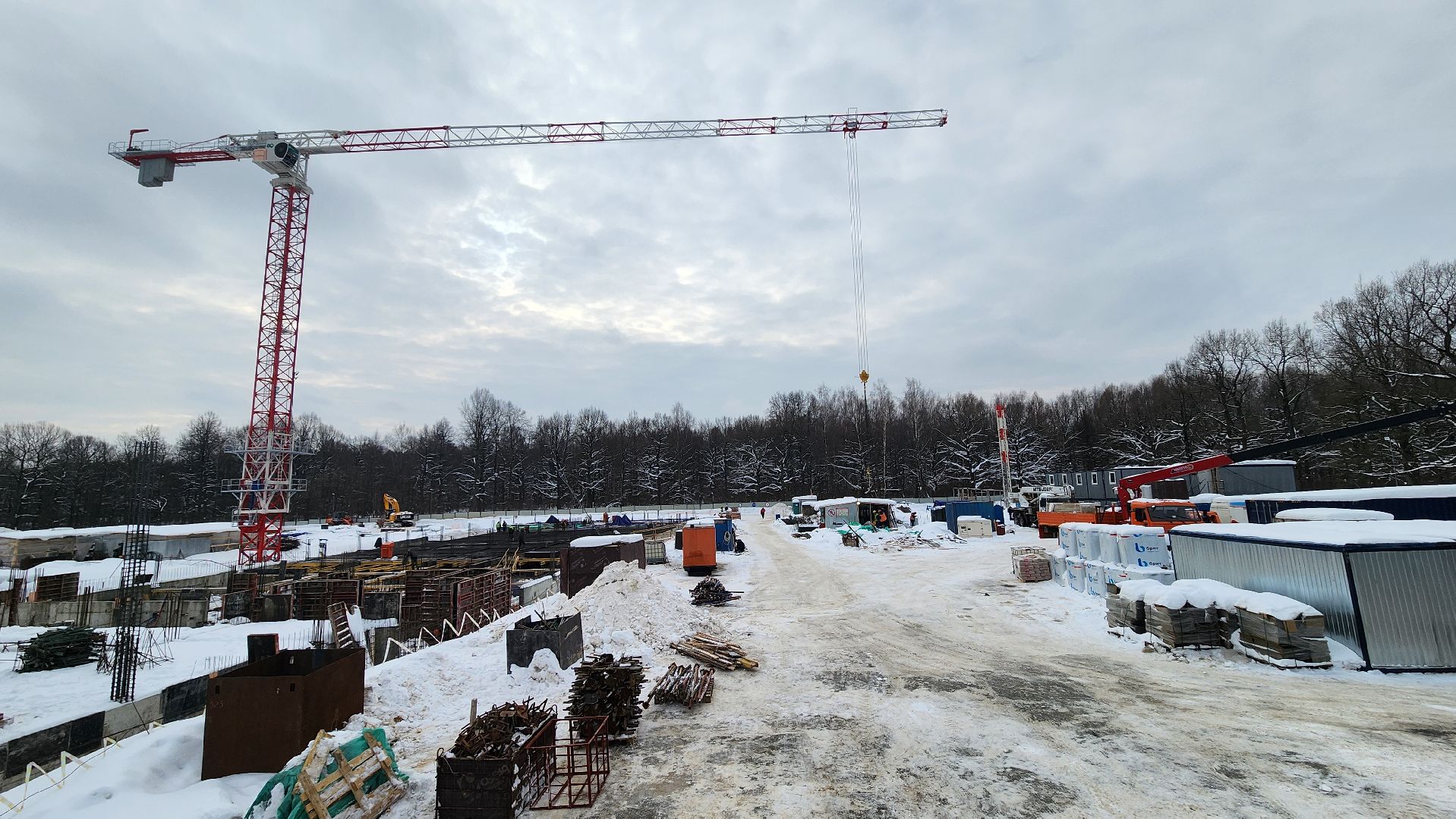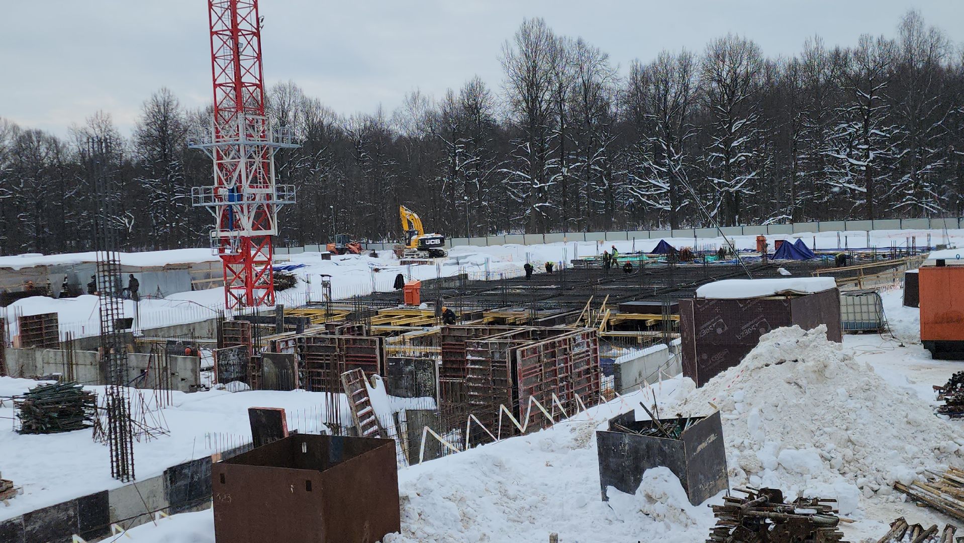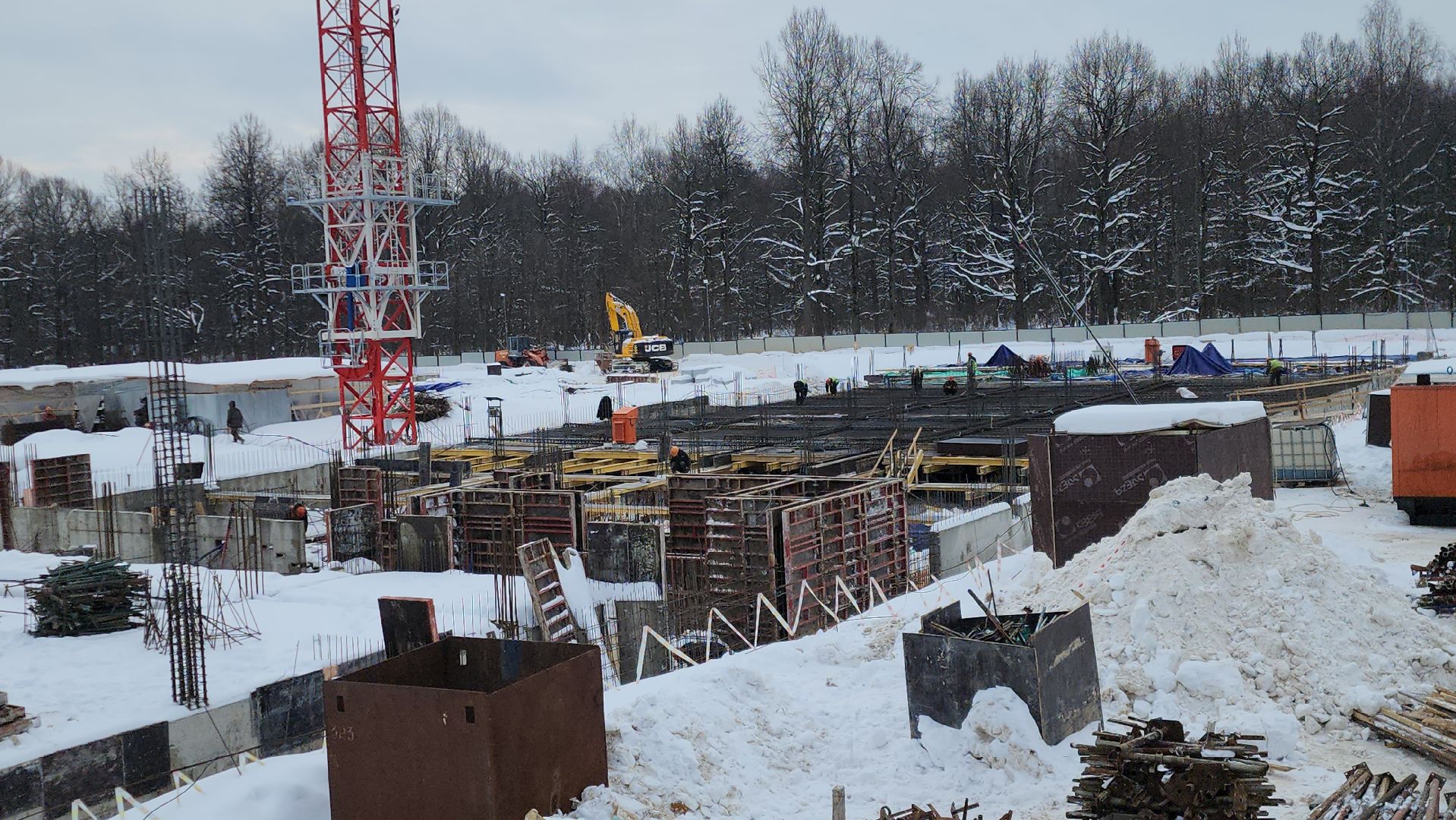 Всего на строительстве работают одновременно 120-130 человек, задействовали 6 единиц техники и 2 башенных крана.