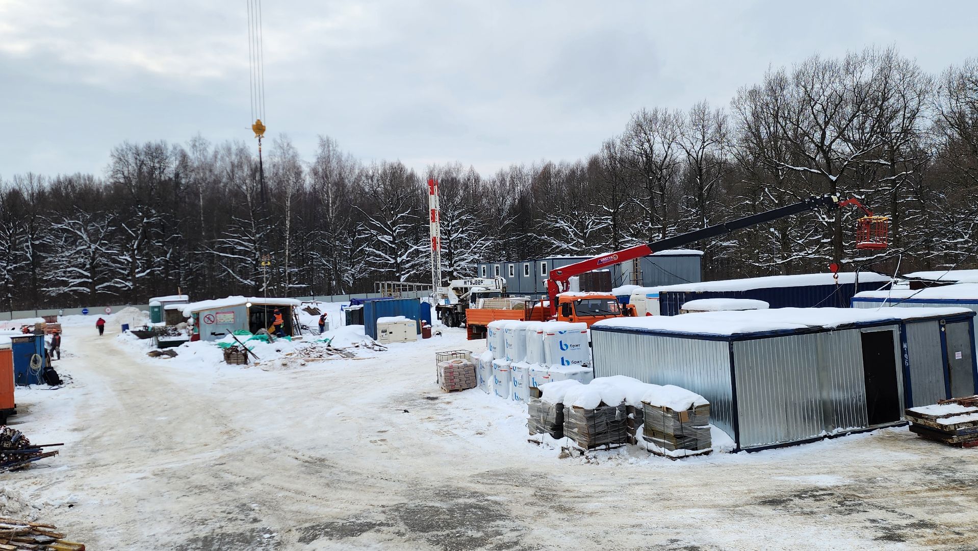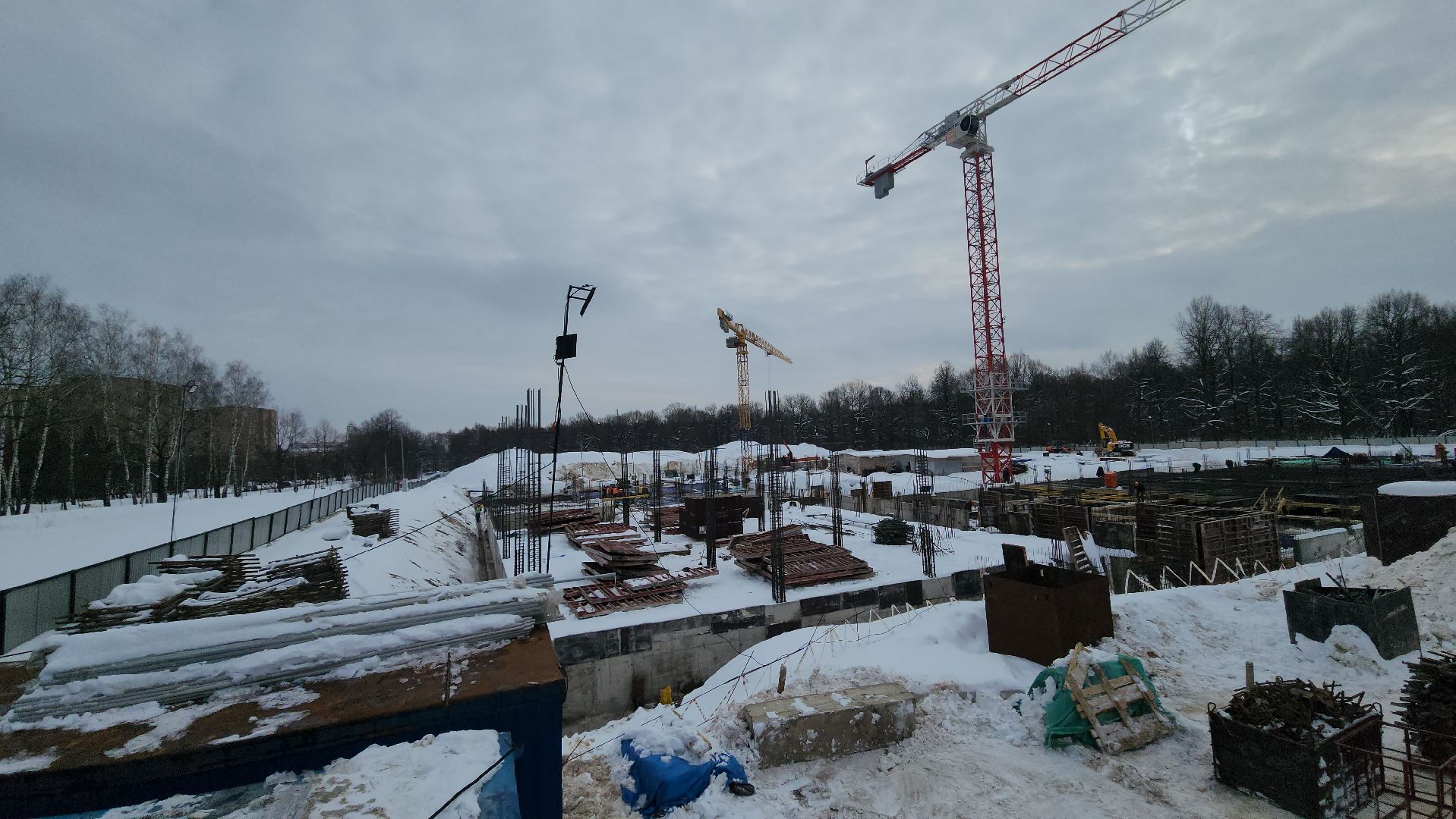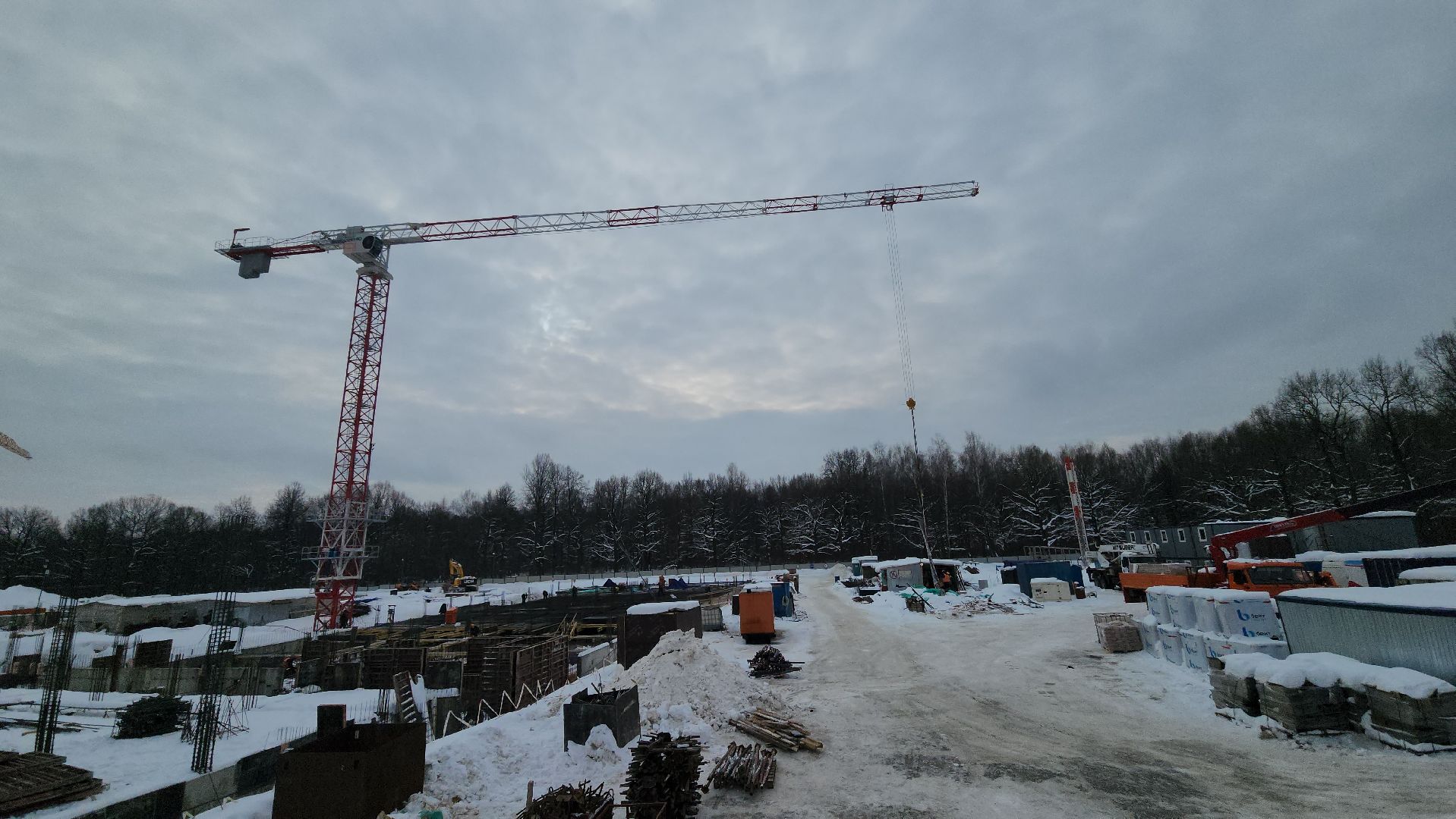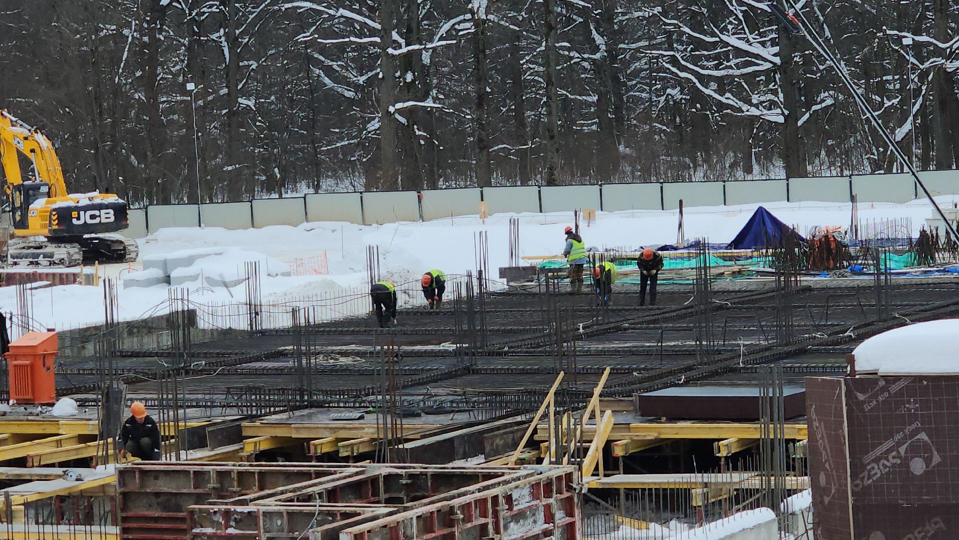 Всего на строительстве работают одновременно 120-130 человек, задействовали 6 единиц техники и 2 башенных крана.
