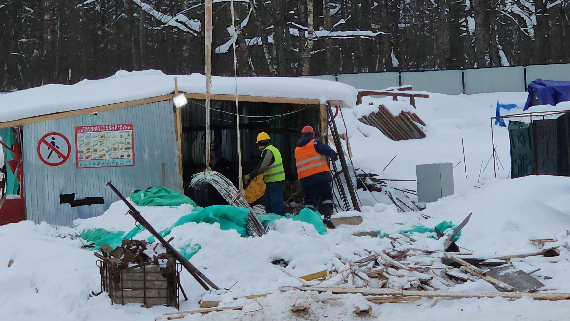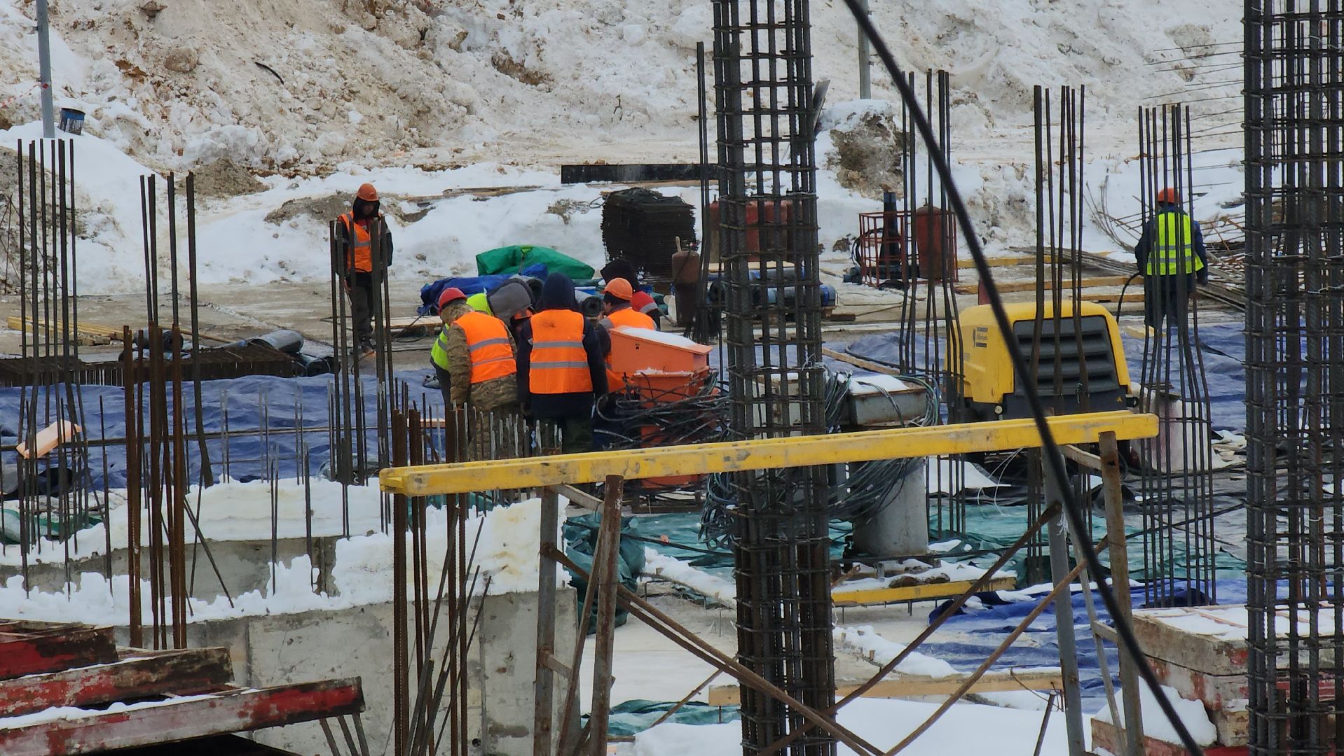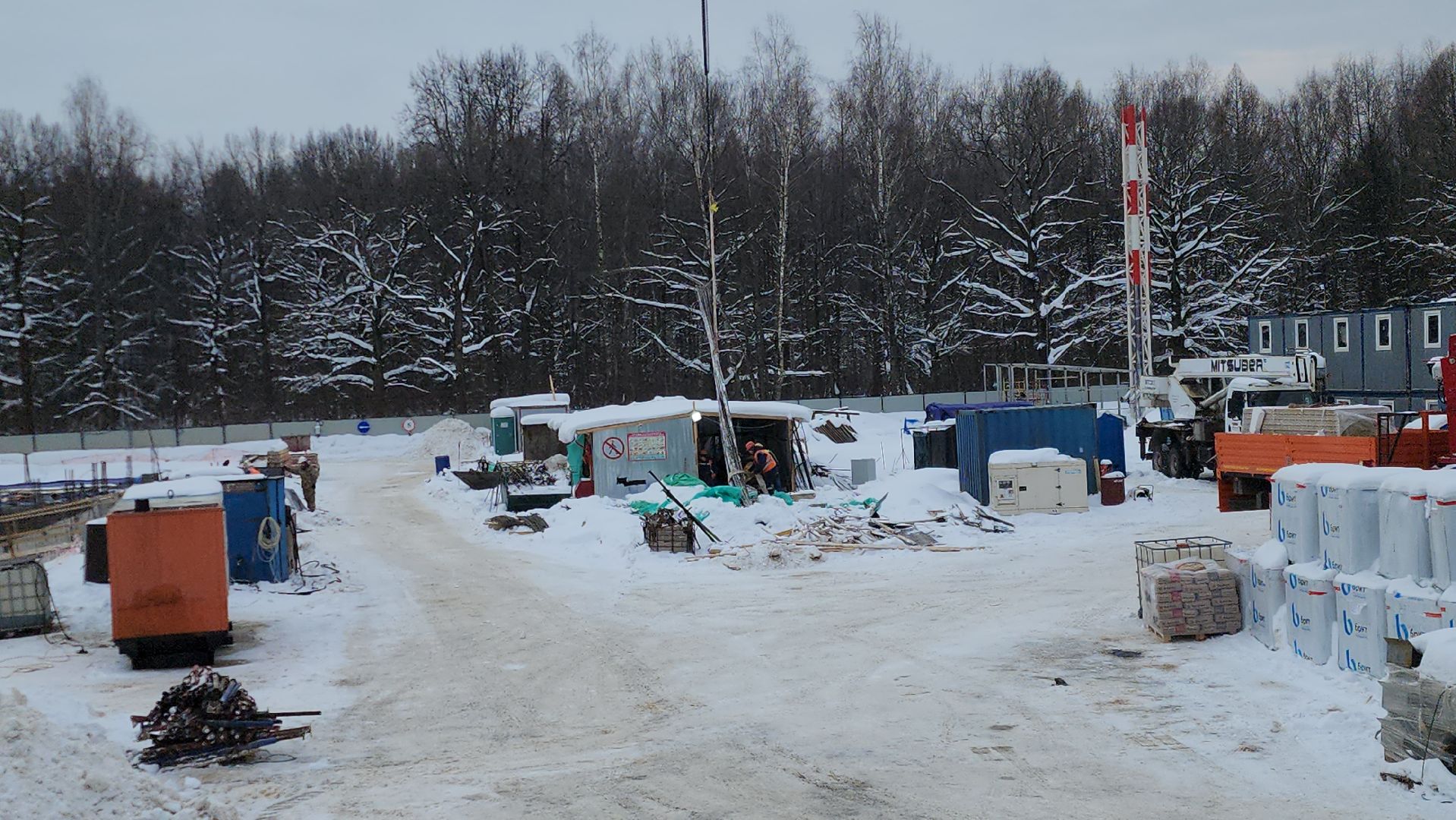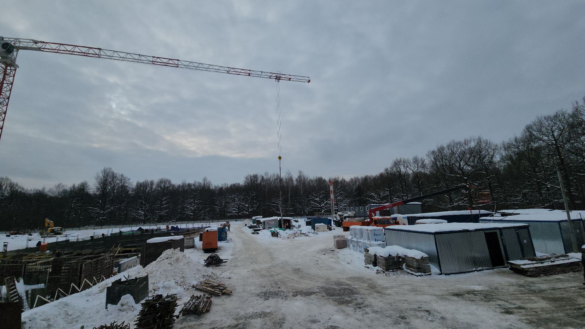 Всего на строительстве работают одновременно 120-130 человек, задействовали 6 единиц техники и 2 башенных крана.