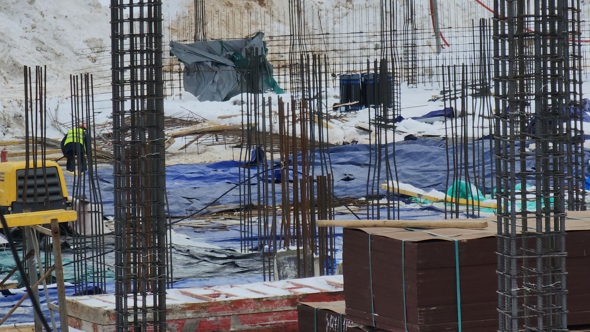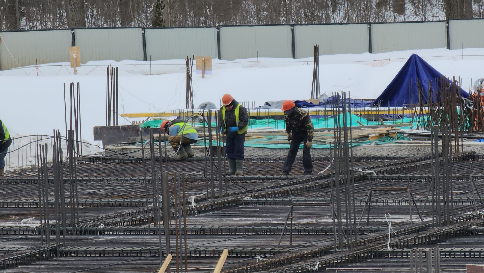 На второй секции делают армирование фундаментной плиты и ведут подготовку к бетонированию.