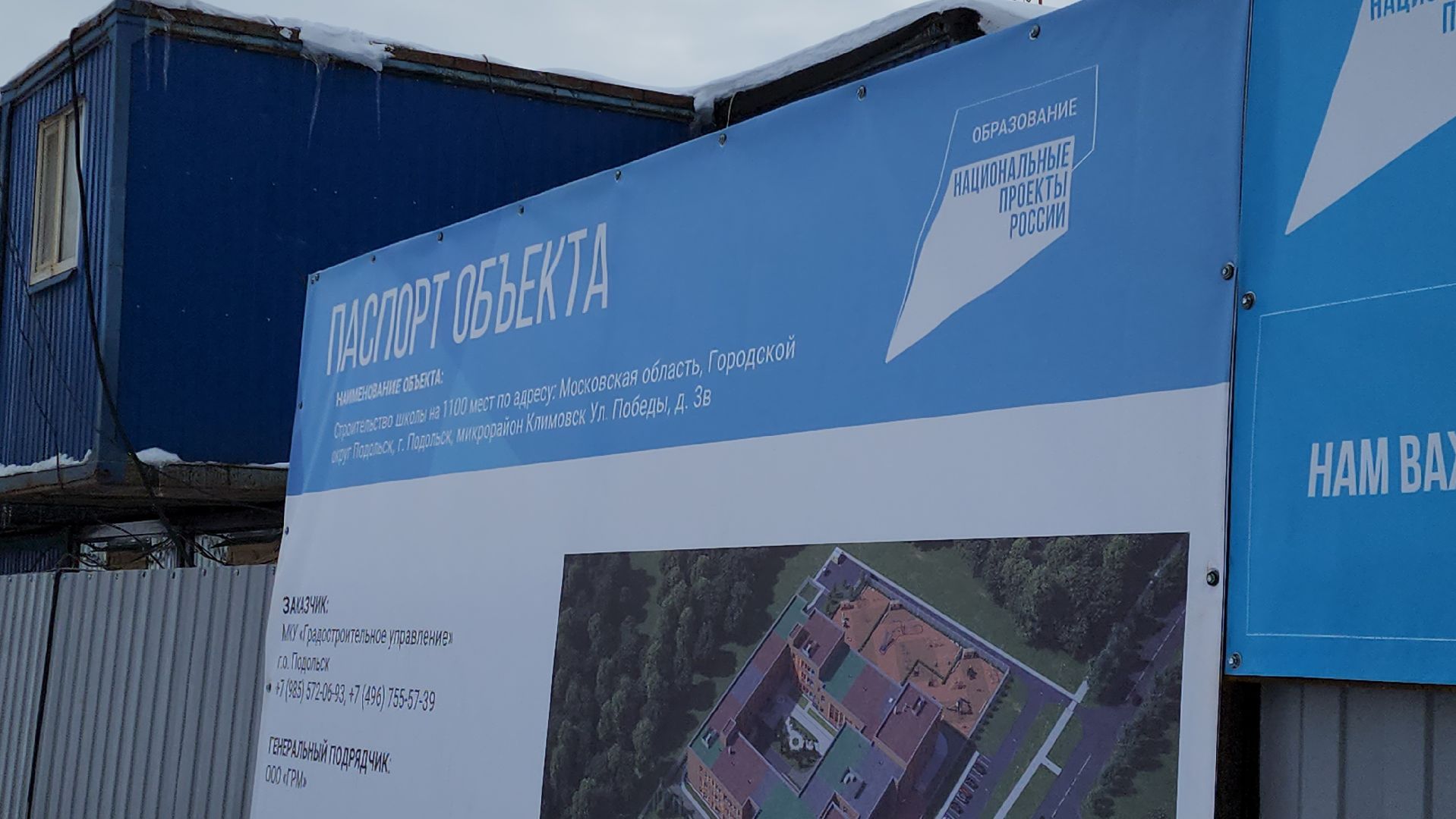 В Подольске строится школа на 1100 мест в микрорайоне Климовск на улице Победы, д. 3в. В настоящее время там идет подготовка к бетонированию лестничной клетки и армированию колонн первого этажа первой секции.