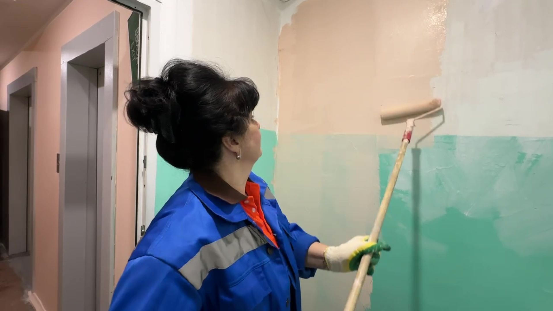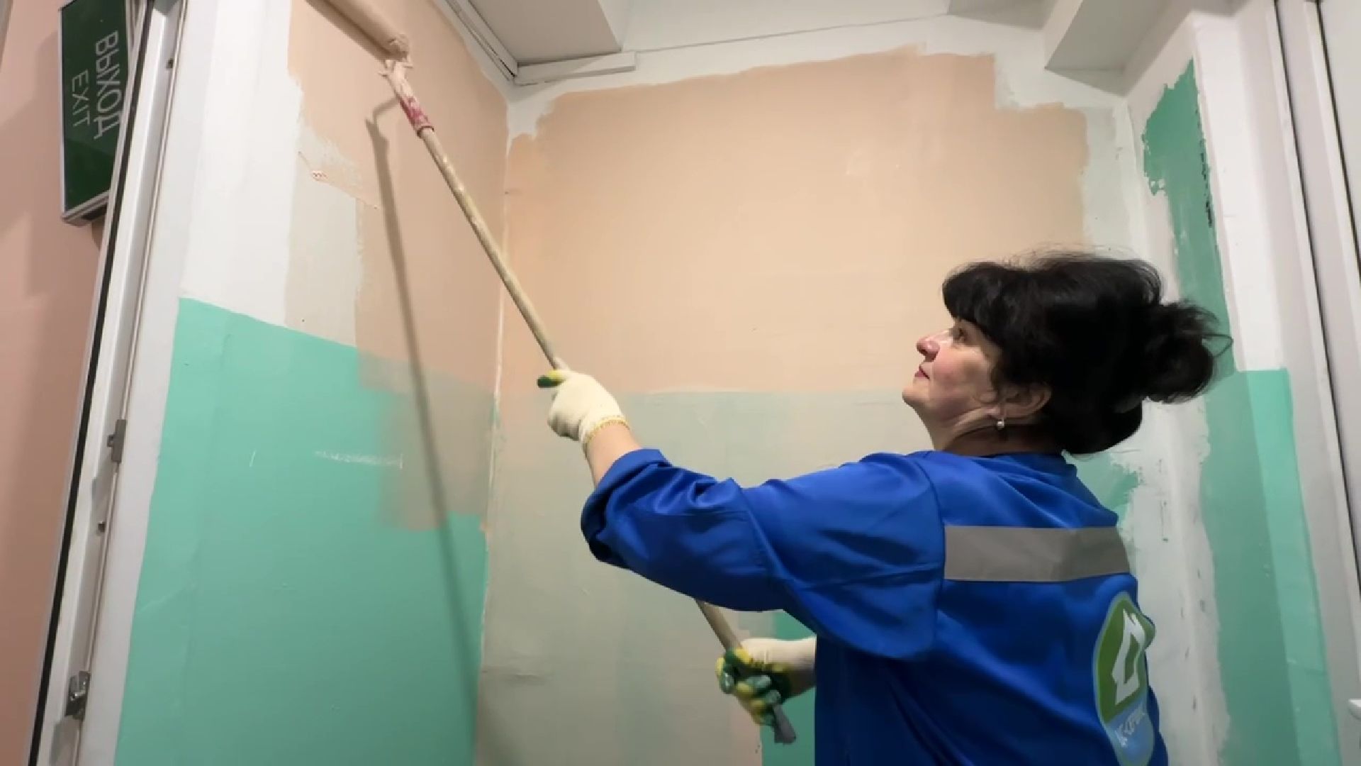 Красоту в подъезде создаёт маляр Любовь Перепечина. За почти 30 лет в профессии в своей работе не разочаровалась ни разу. Окинув взглядом фронт работ, сразу же понимает, сколько нужно будет слоёв краски, как быстро справится с задачей. Делает всё не просто красиво – выше всяких похвал.