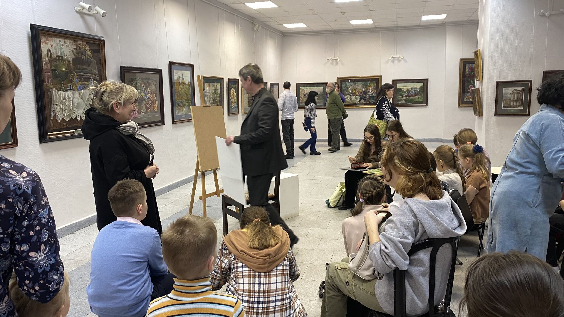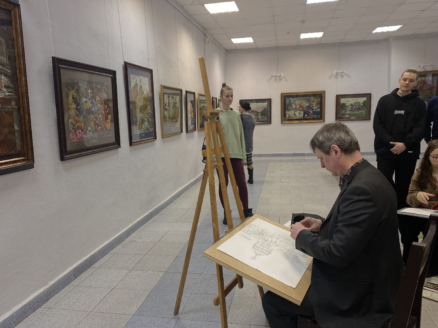 После открытия выставки Александр провёл мастер-класс для всех желающих. Вместе с художником участники занятия на листе бумаги акварелью рисовали храм на Невском проспекте, прислушиваясь к советам маэстро.