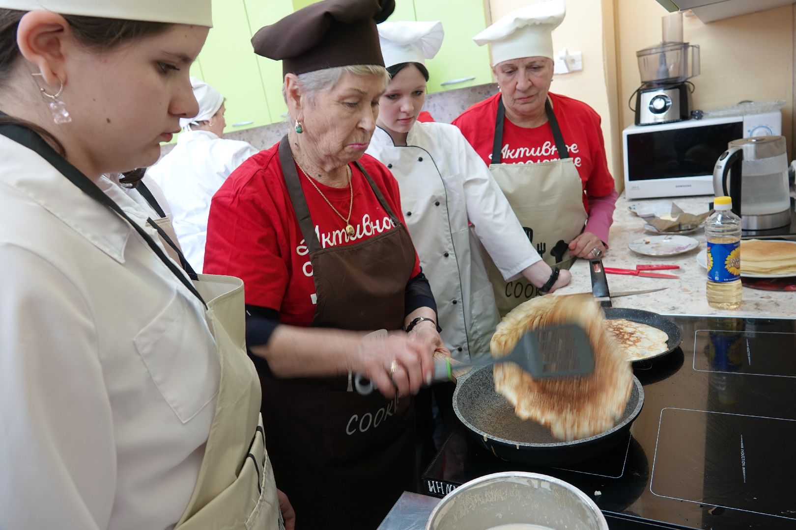 Кулинарный мастер-класс в школе №7 начался с рассказа о рецептуре самых вкусных блинов «Как у бабушки» от участницы проекта «Активное долголетие» Раисы Николаевны. Сама она любит кулинарию, а блины, тем более дрожжевые, – её «конек».