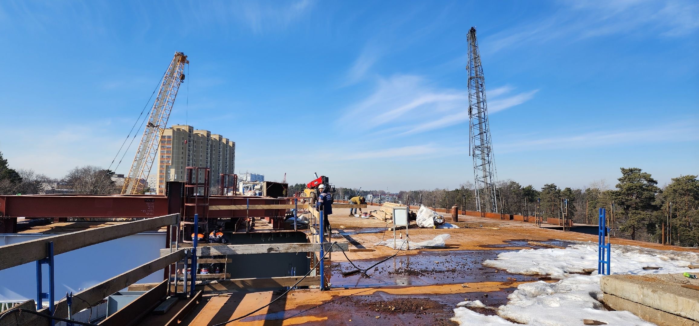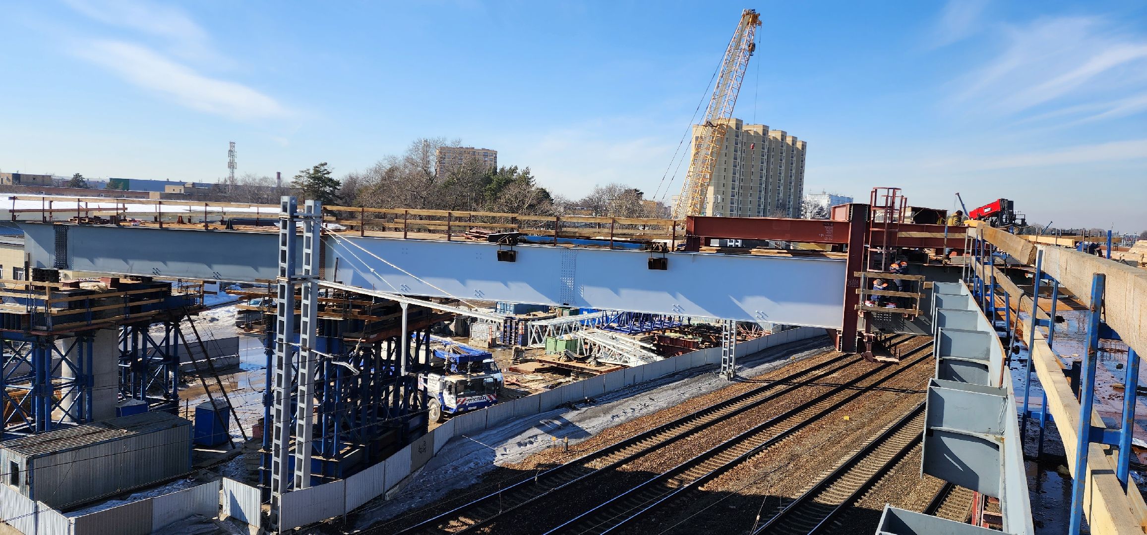 «Нашей организацией проведена очень большая и важная работа по монтажу ригеля шестой опоры над железной дорогой. Эти строительно-монтажные мероприятия выполнялись в ночное время, в «окно» между движением электропоездов по всем четырём путям. Нам удалось смонтировать тридцатиметровый ригель весом 163 тонны вместе с приёмной консолью. Сейчас мы занимаемся соединением этой конструкции с пролётным строением», — рассказал Николай Прасов, исполняющий обязанности директора филиала АО «ДиМ»-Мостоотряд-125.