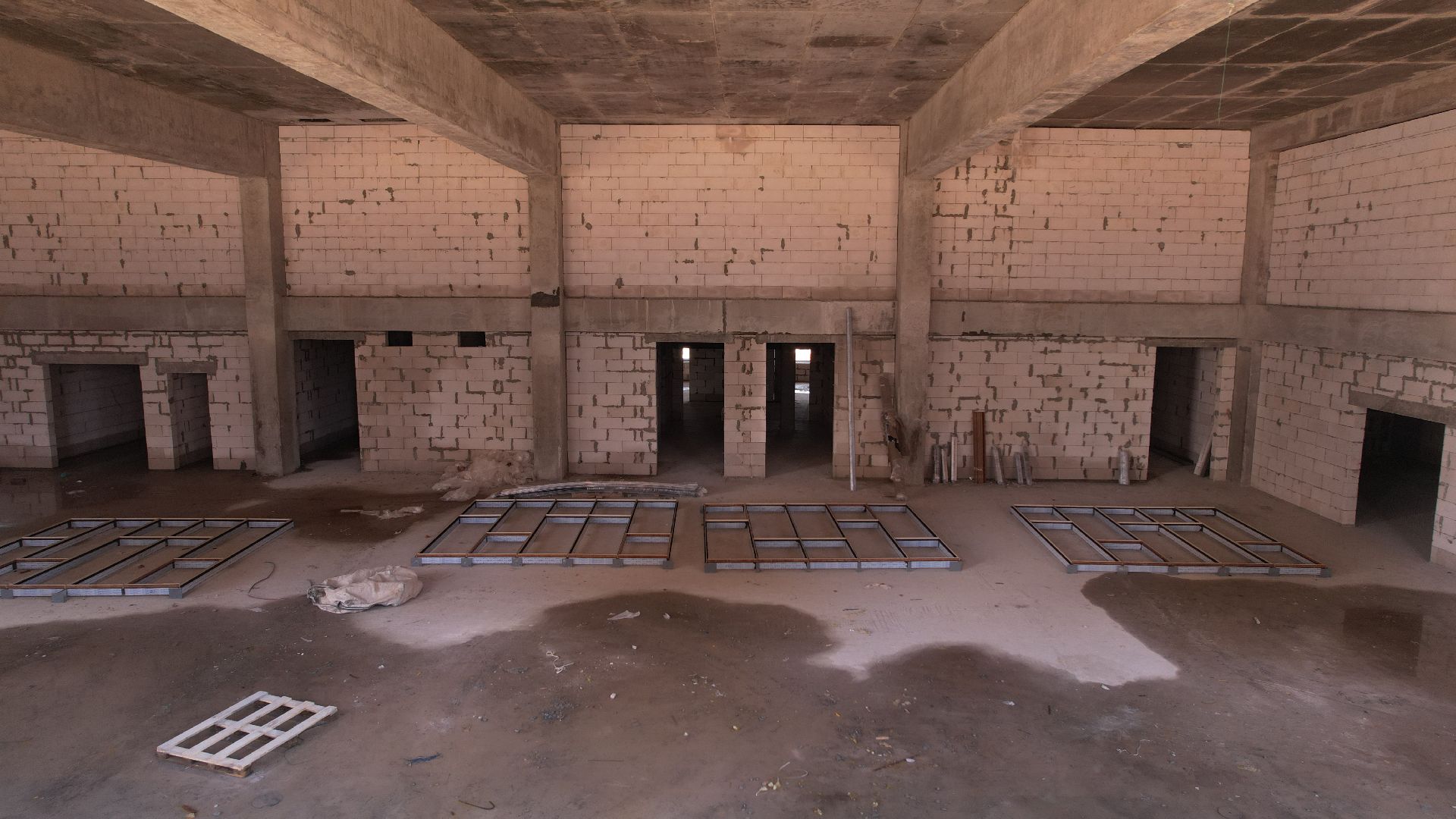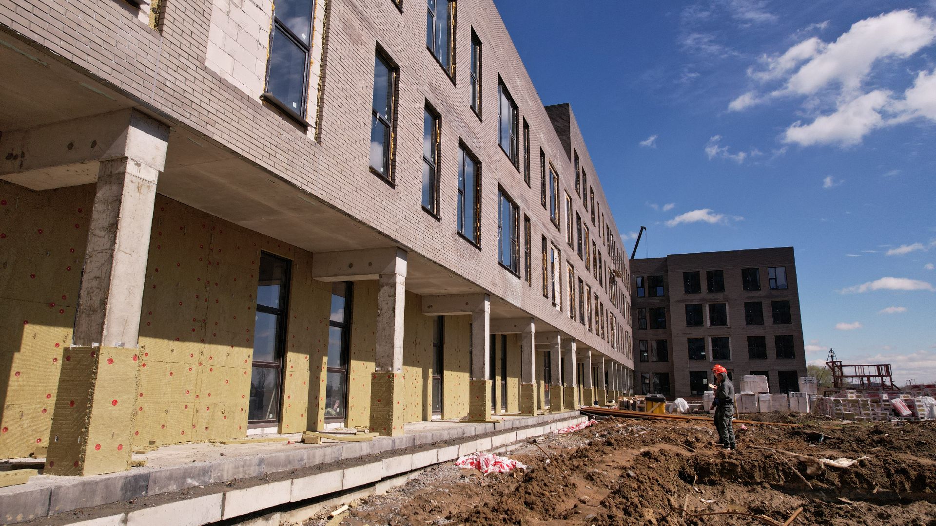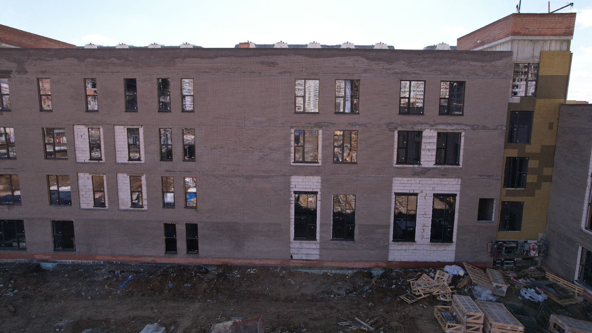 Здание школы построено, в нём установлены окна и перегородки, идут штукатурные работы