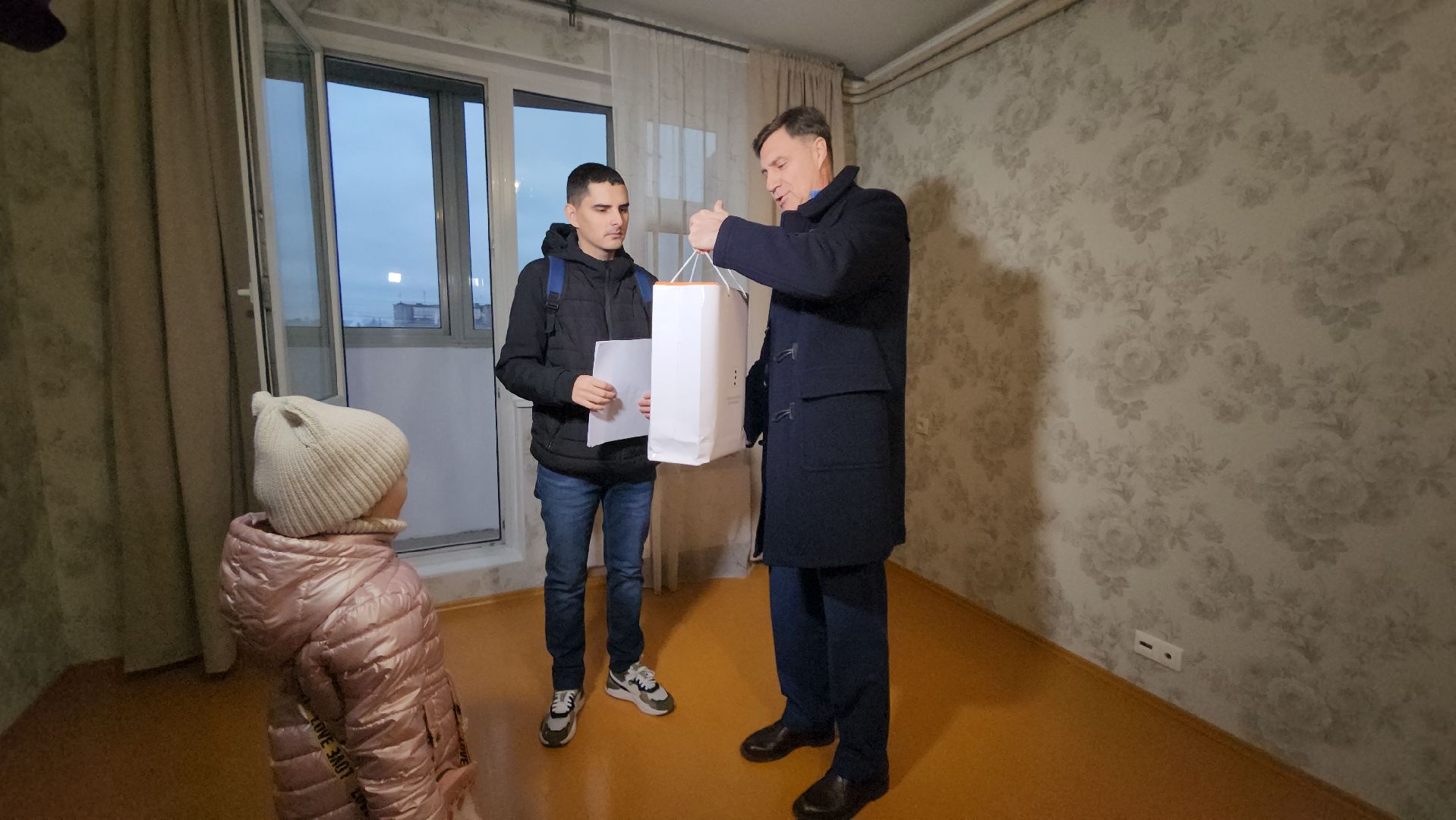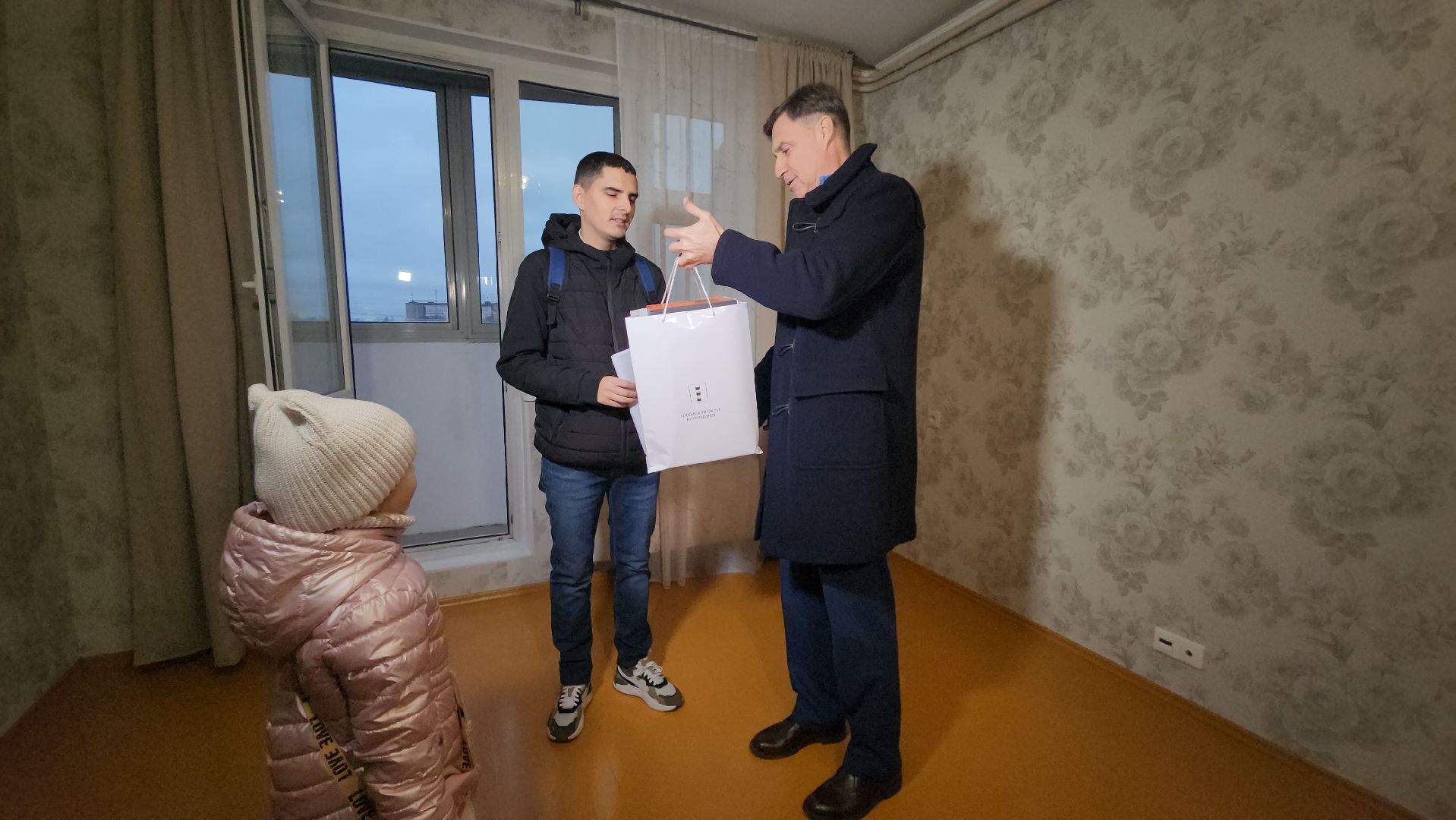 Михаил Соболев спросил у молодого человека про планы на жизнь. Артём окончил индустриальный колледж по специальности «Программист» и сейчас проходит практику на заводе. А чтобы в новом жилье царила творческая атмосфера, Михаил Соболев подарил новосёлу колонку.