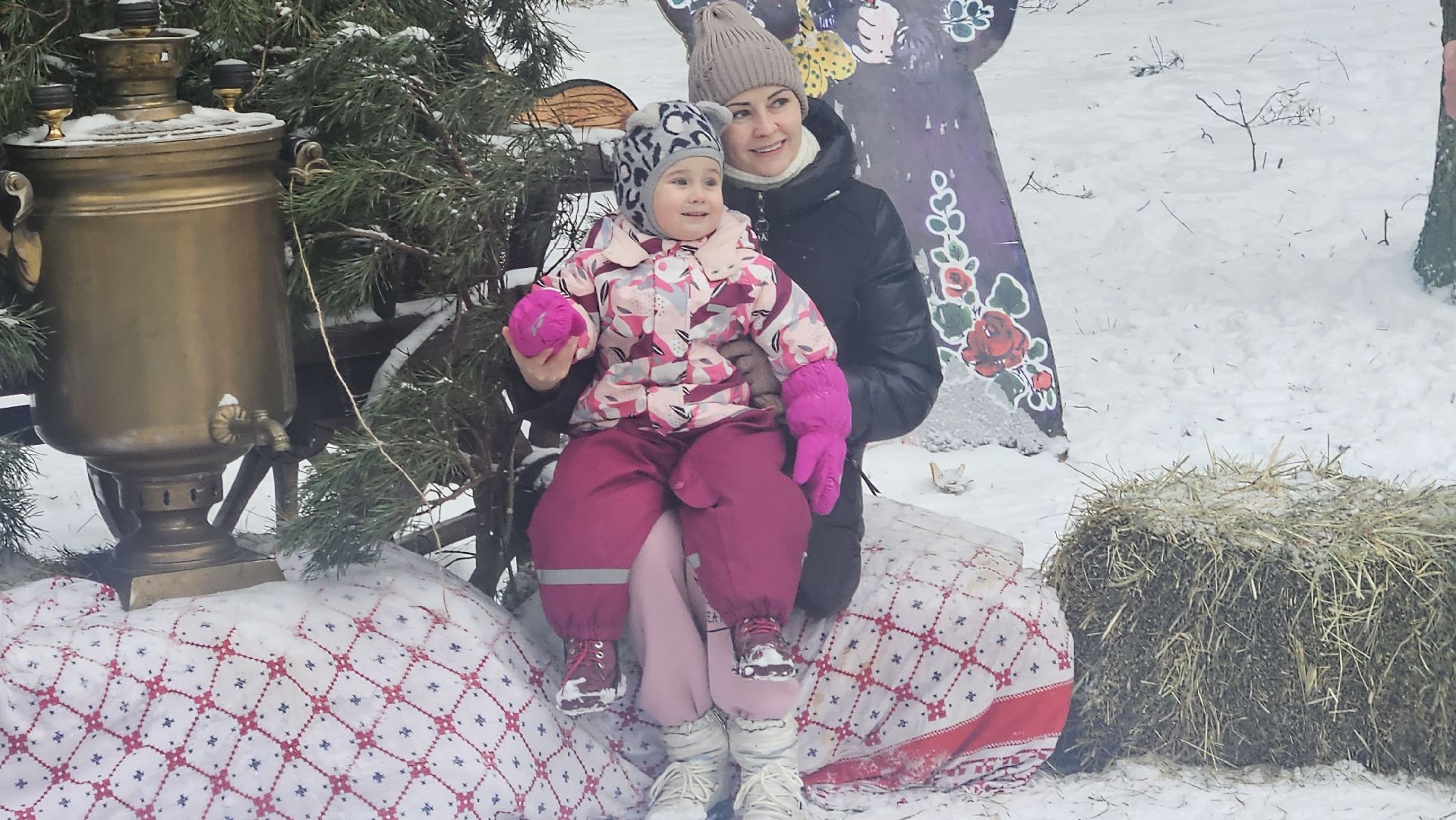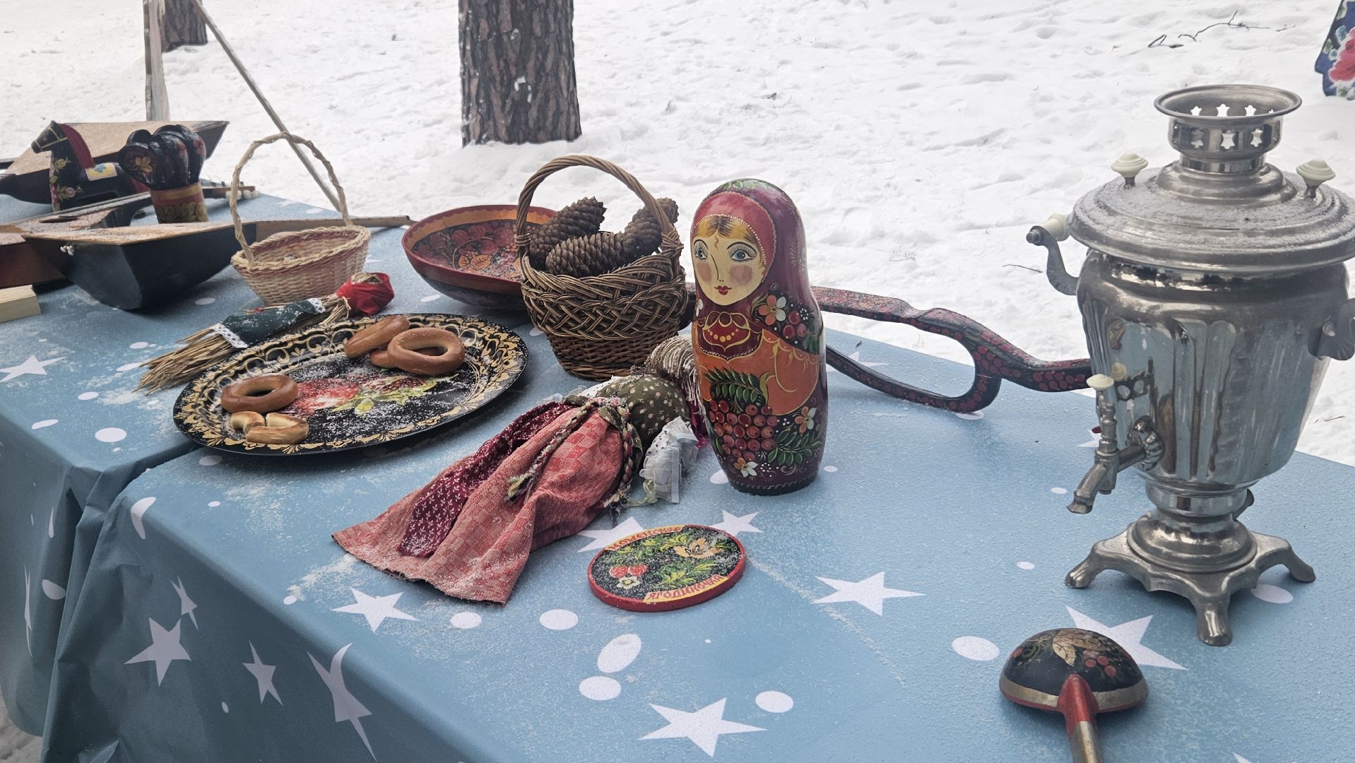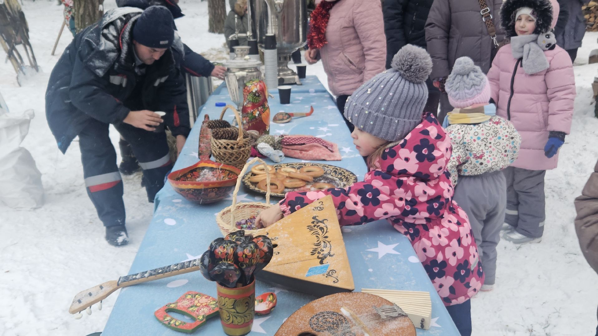 Программа была очень разнообразной, развлечений хватило и детям, и взрослым. Здесь пели песни, играли в ручеёк, ели баранки и запивали их горячим чаем из настоящего самовара. Согреться можно было не только им — здесь была устроена зона с лавочками и настоящим очагом с живым огнём. Также можно было увидеть выставку народных русских промыслов.