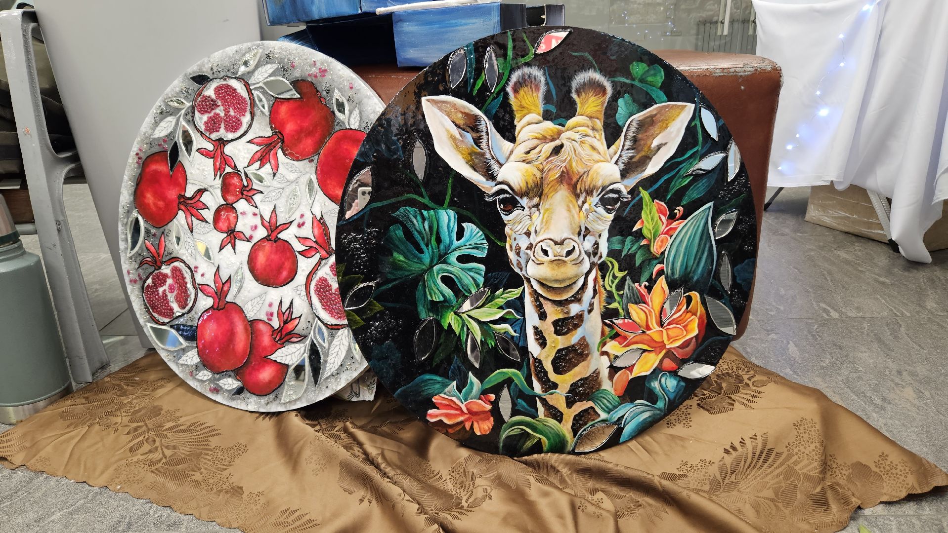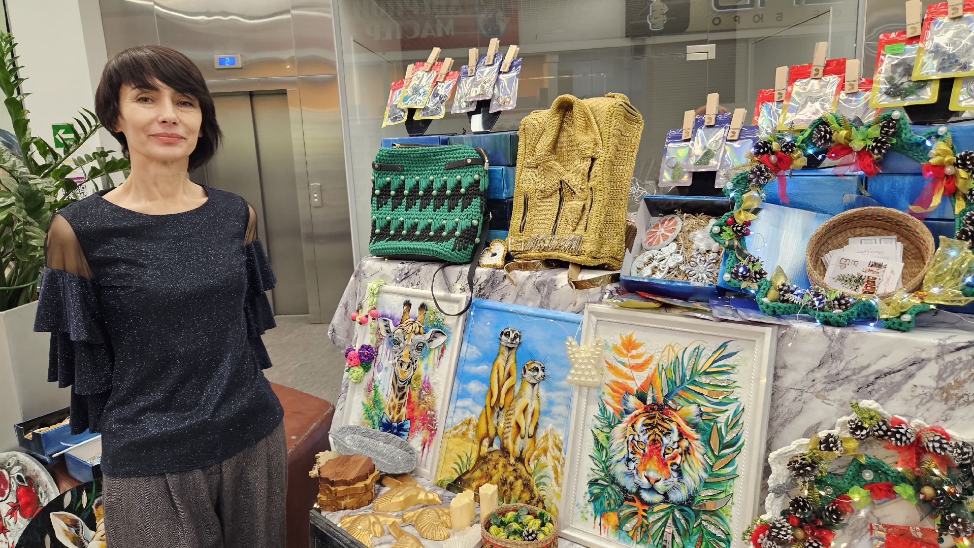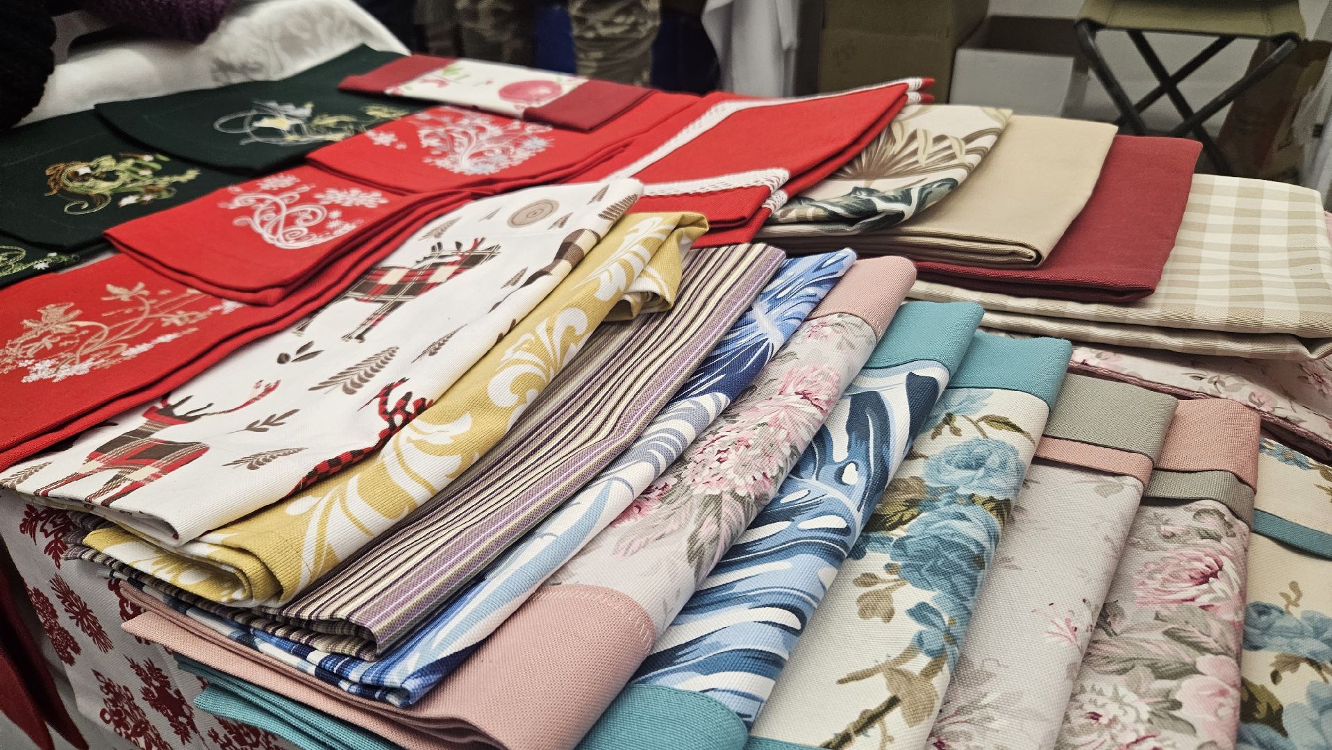 Наталья давно увлеклась шитьём и создаёт полотенца, скатерти, фартуки из водостойкой ткани. Сегодня она привезла изделия из своей новогодней коллекции.