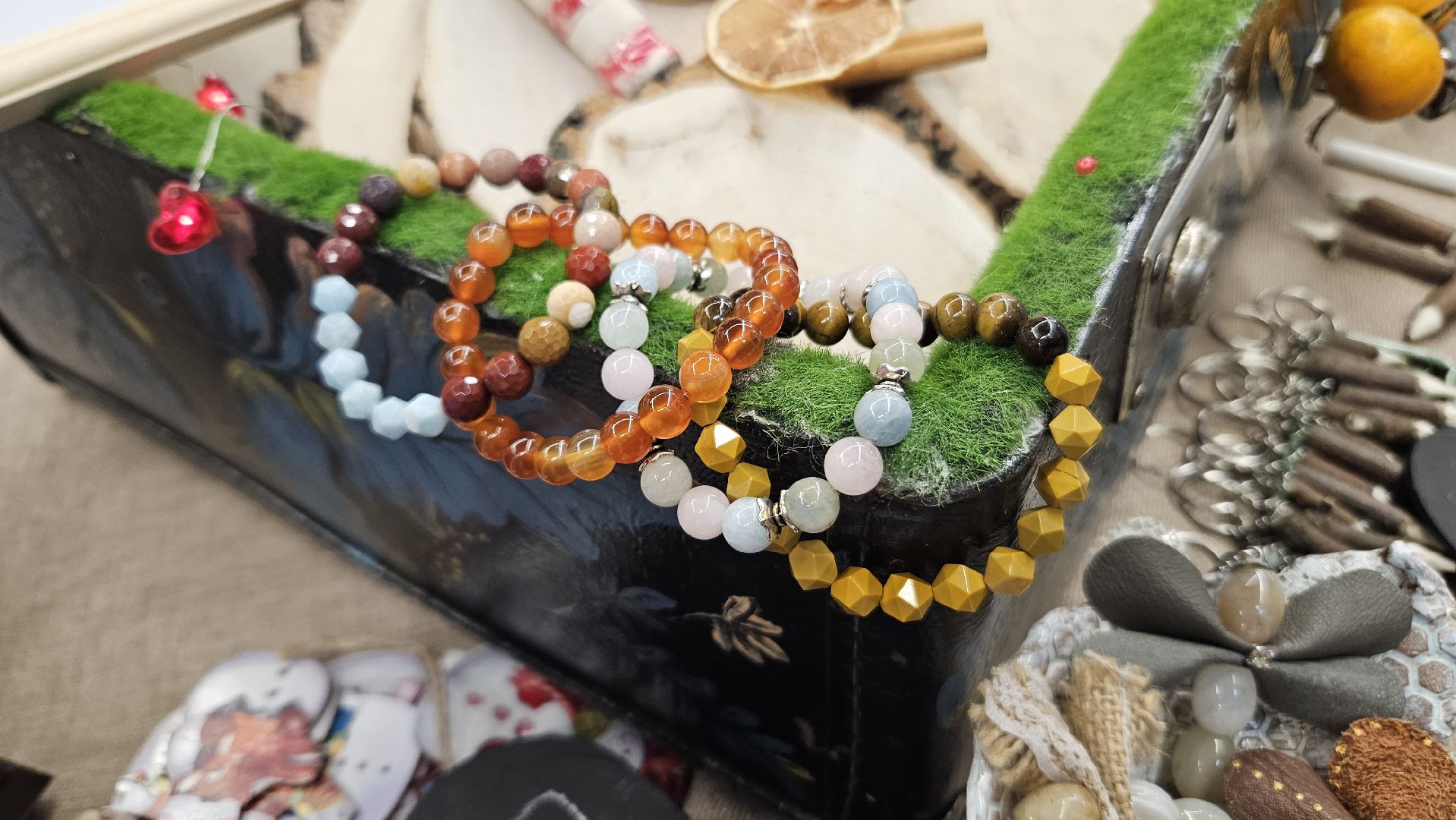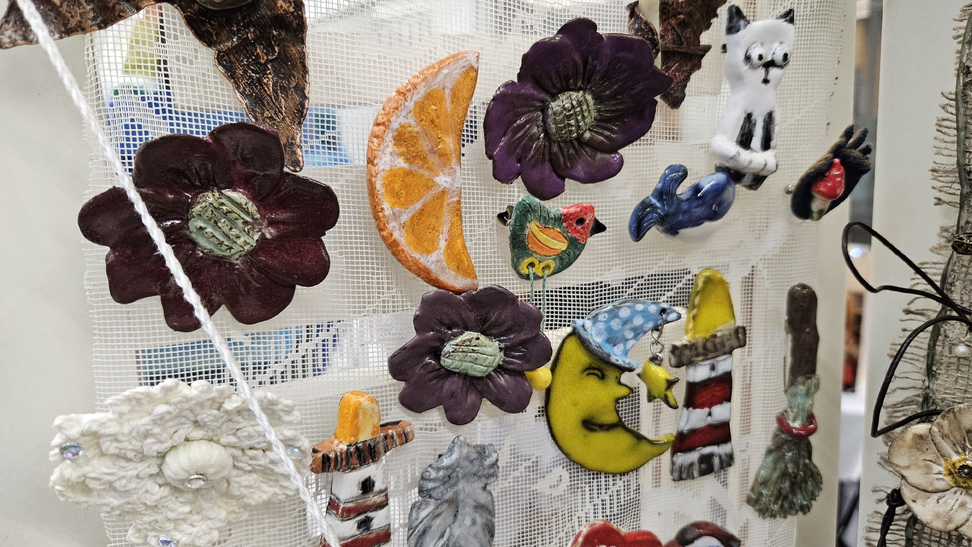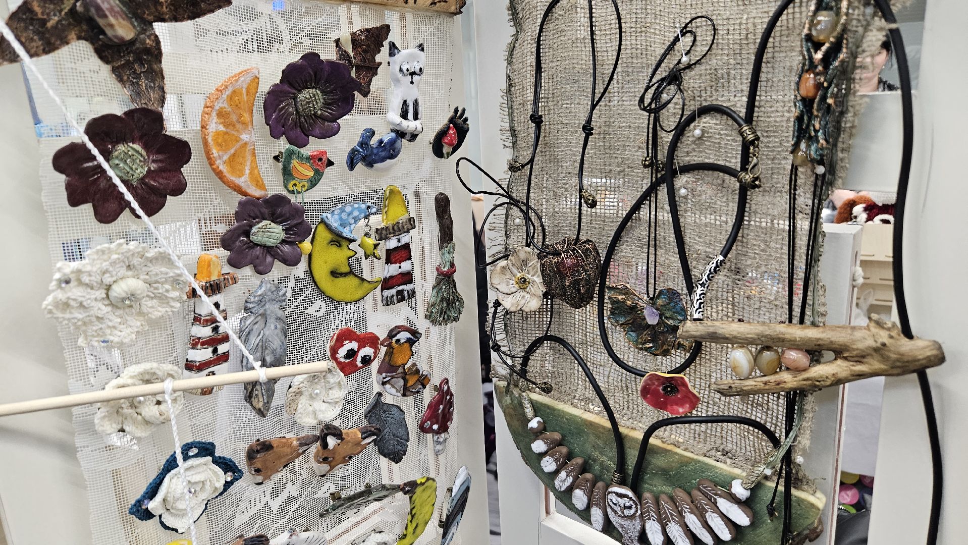 А Оксана и Яна из села Строкино Раменского городского округа создают своими руками аутентичные украшения из керамики, пряжи и дерева.
