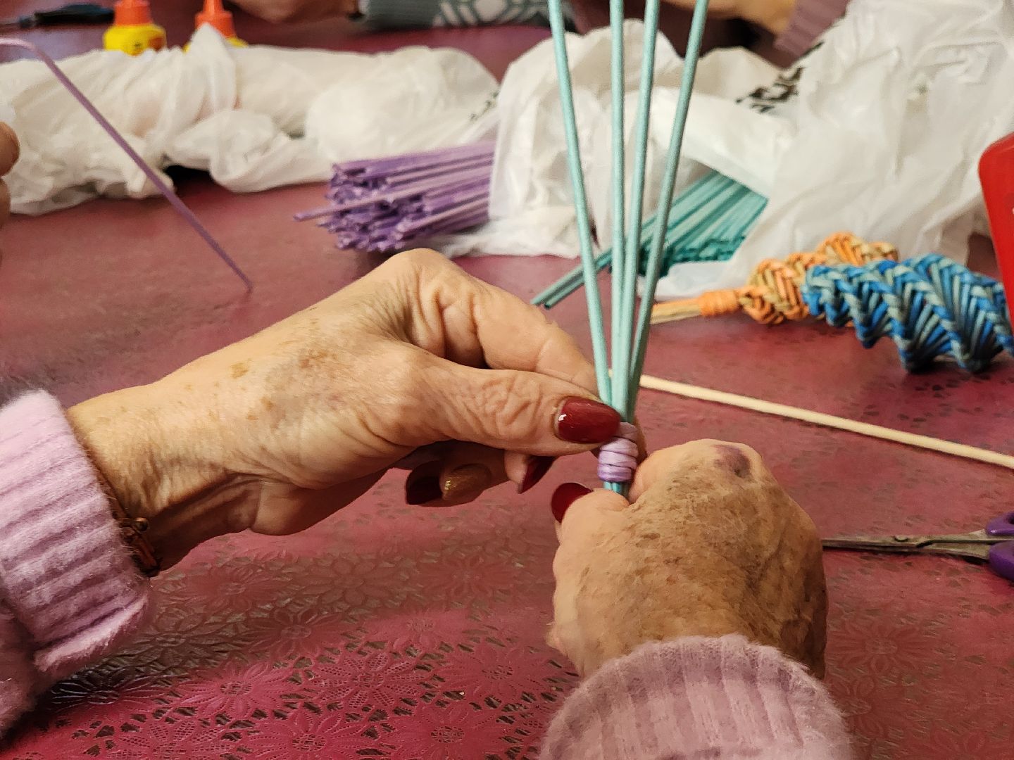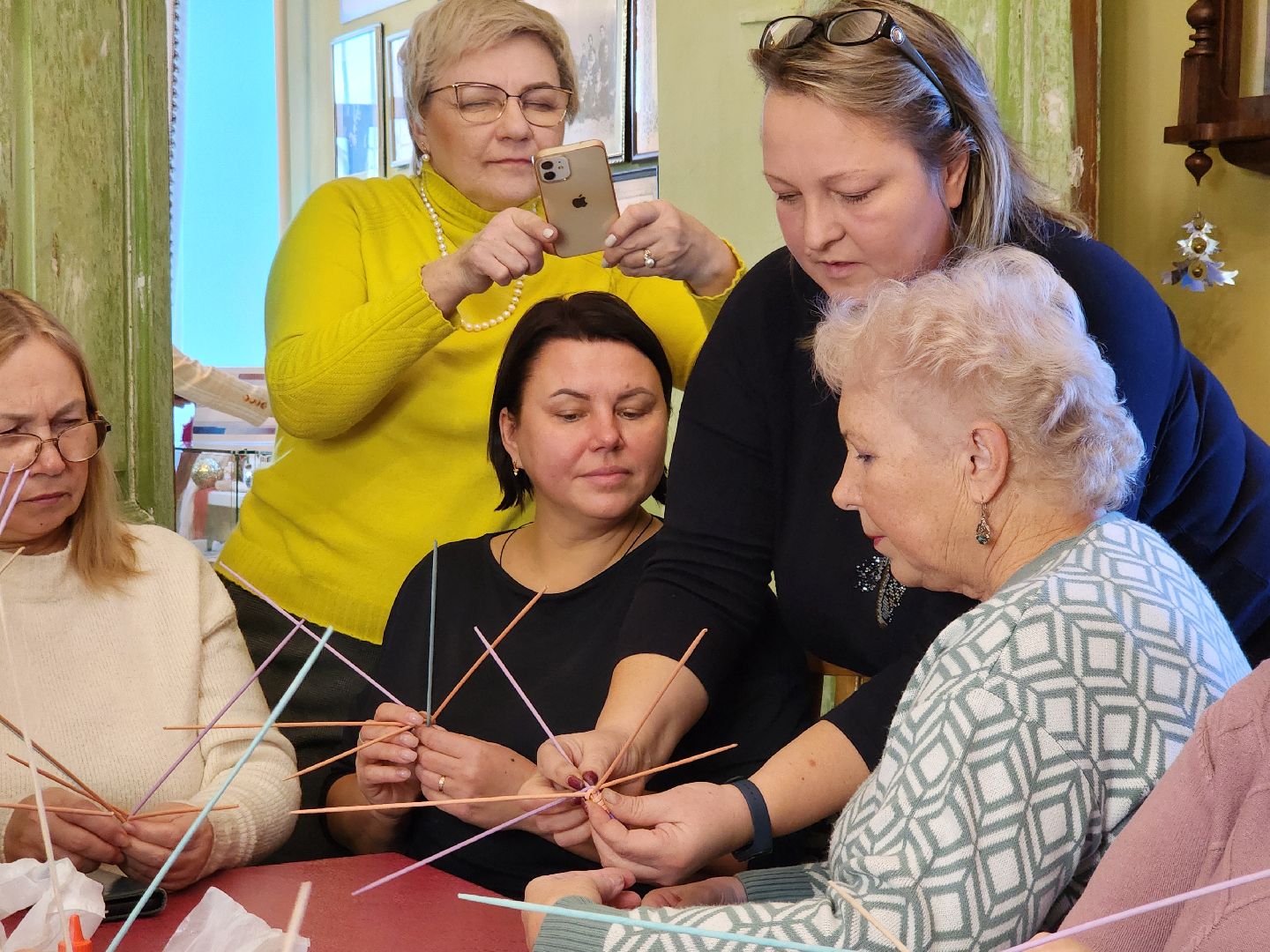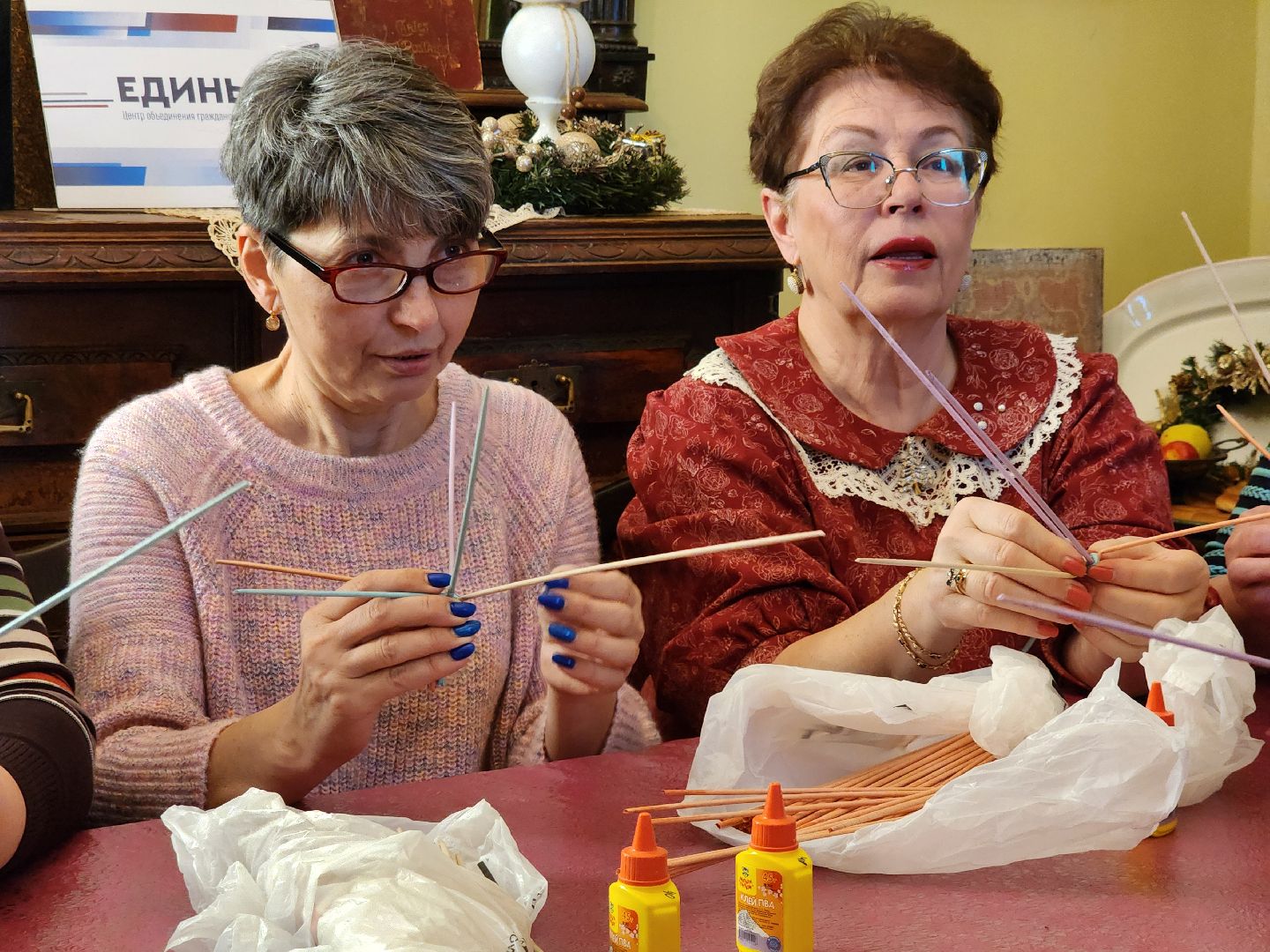 Игрушки создавались под руководством местной мастерицы Ольги Бессоновой, которая делилась своими знаниями о технике плетения и помогала в процессе работы. Она рассказала, как сделать лозу из ненужной бумаги, как покрасить ее и в итоге сделать украшение. Плетение из такой лозы даёт бумаге новую жизнь. Для этого понадобятся простые материалы: клей, бумага или старая газета, тонкая спица и краска.