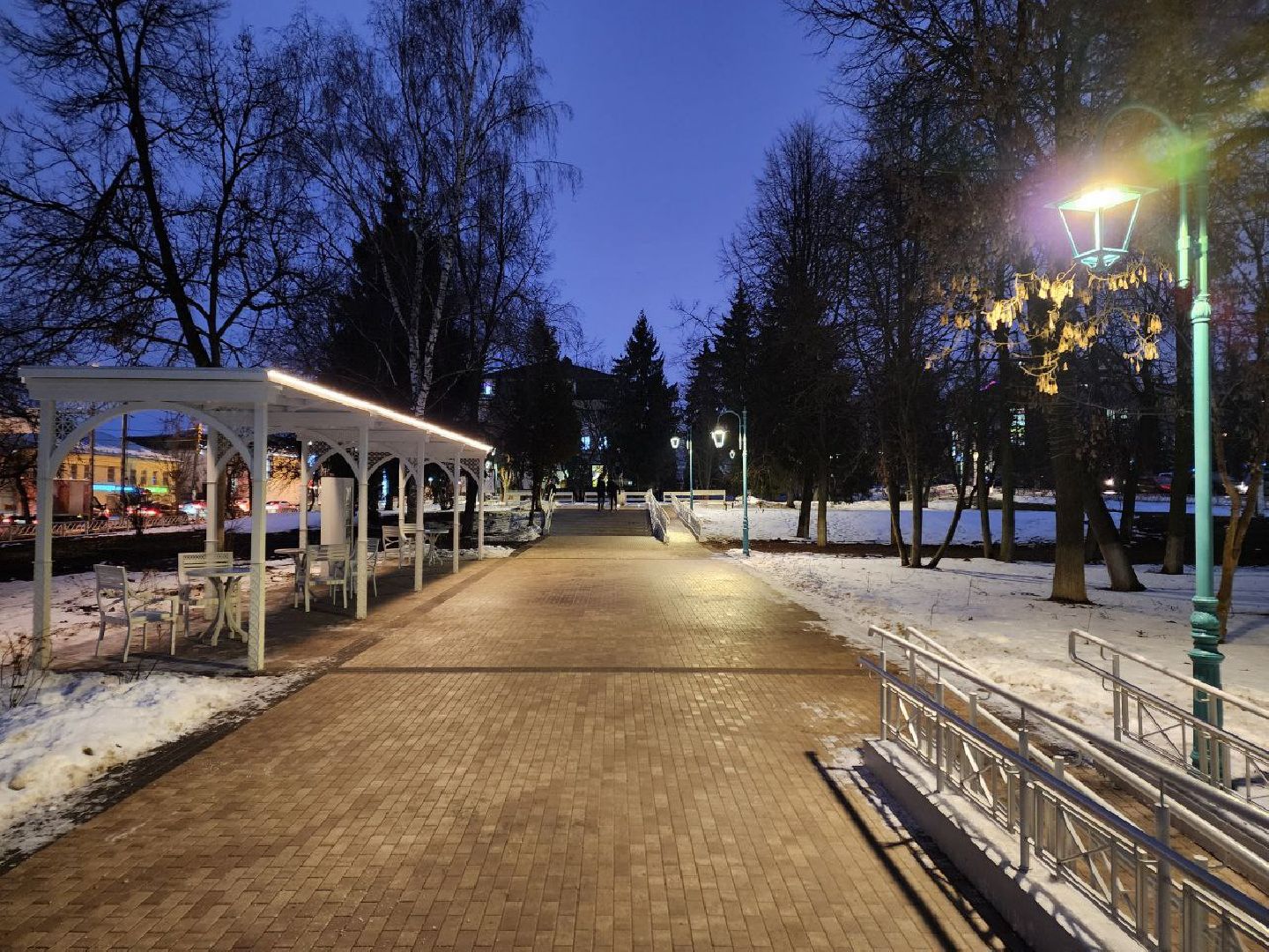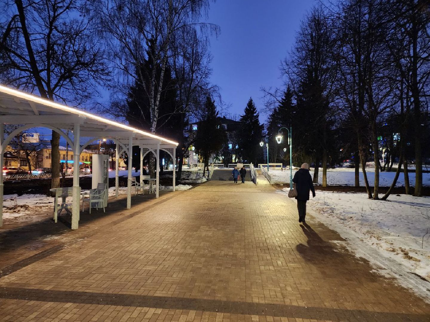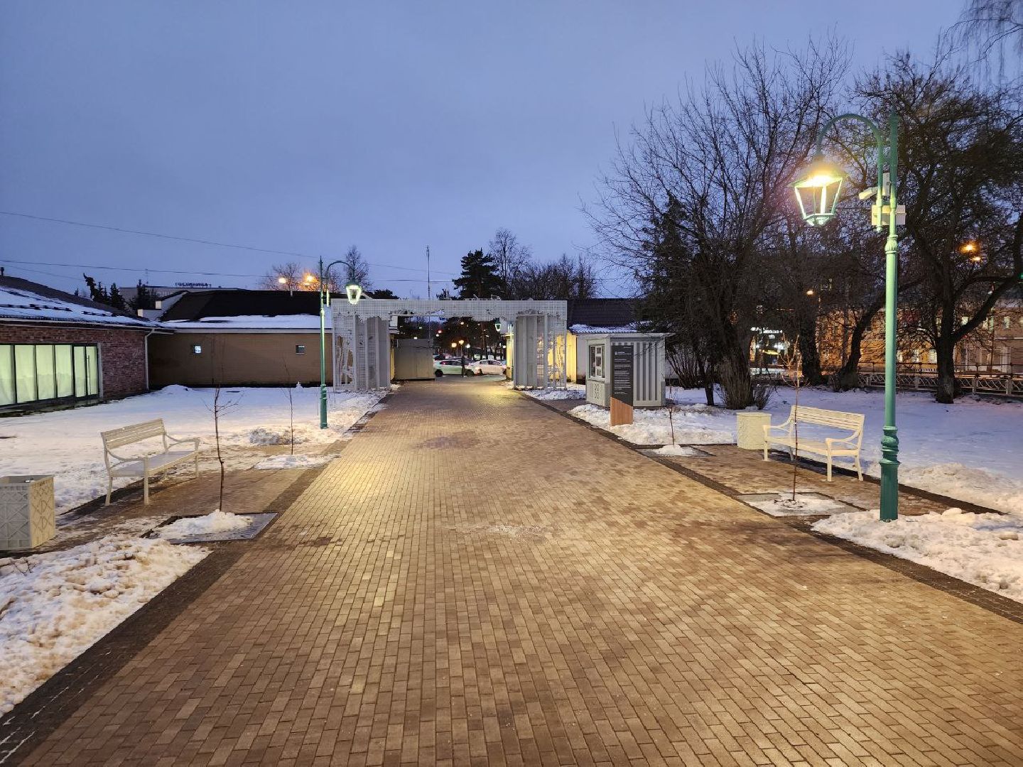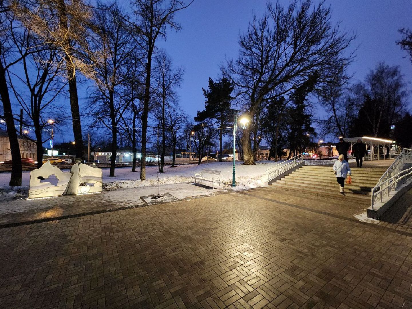 Наладили и наружное освещение. Установили вечернюю подсветку арт-объектов и малых архитектурных форм.