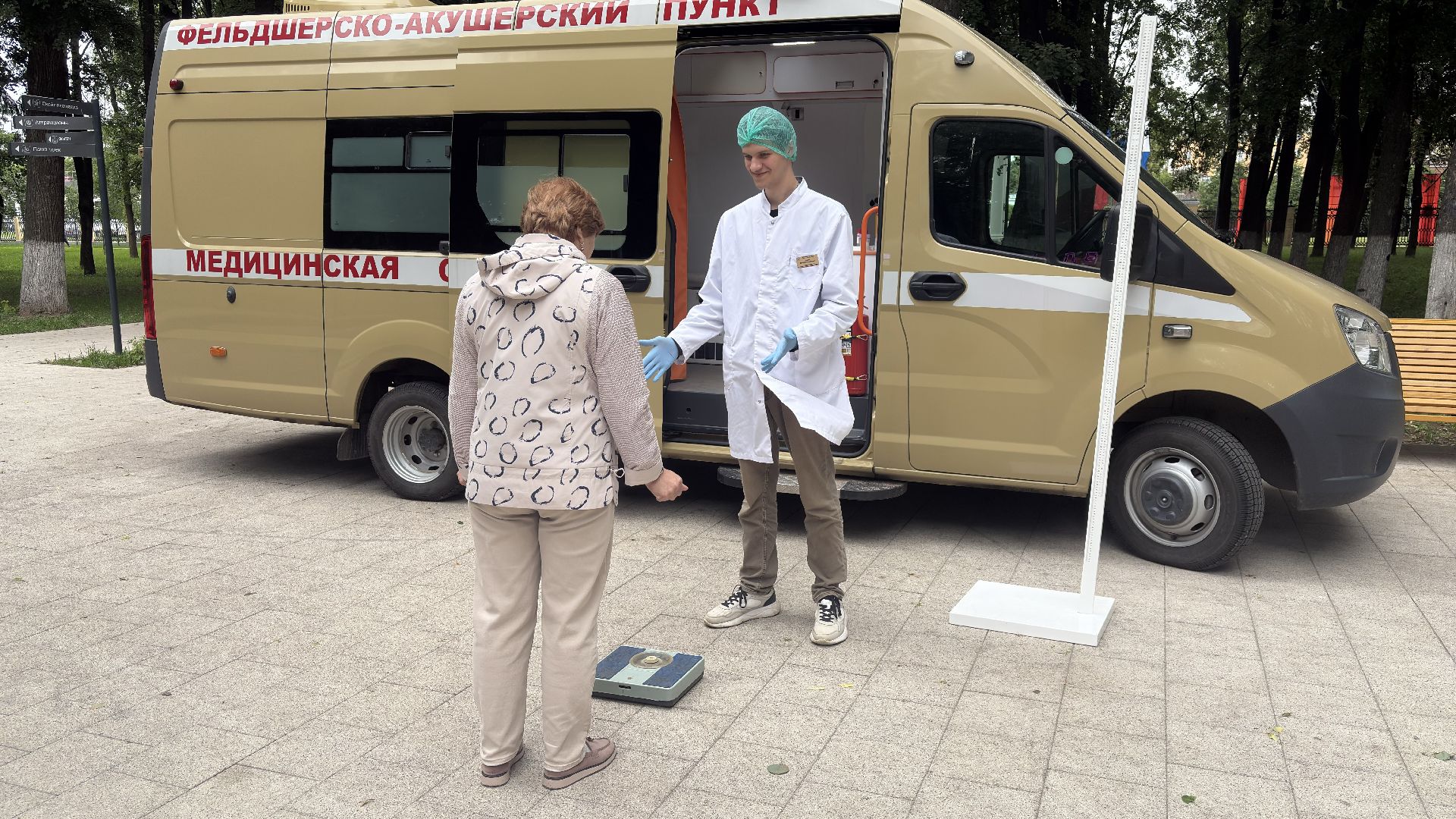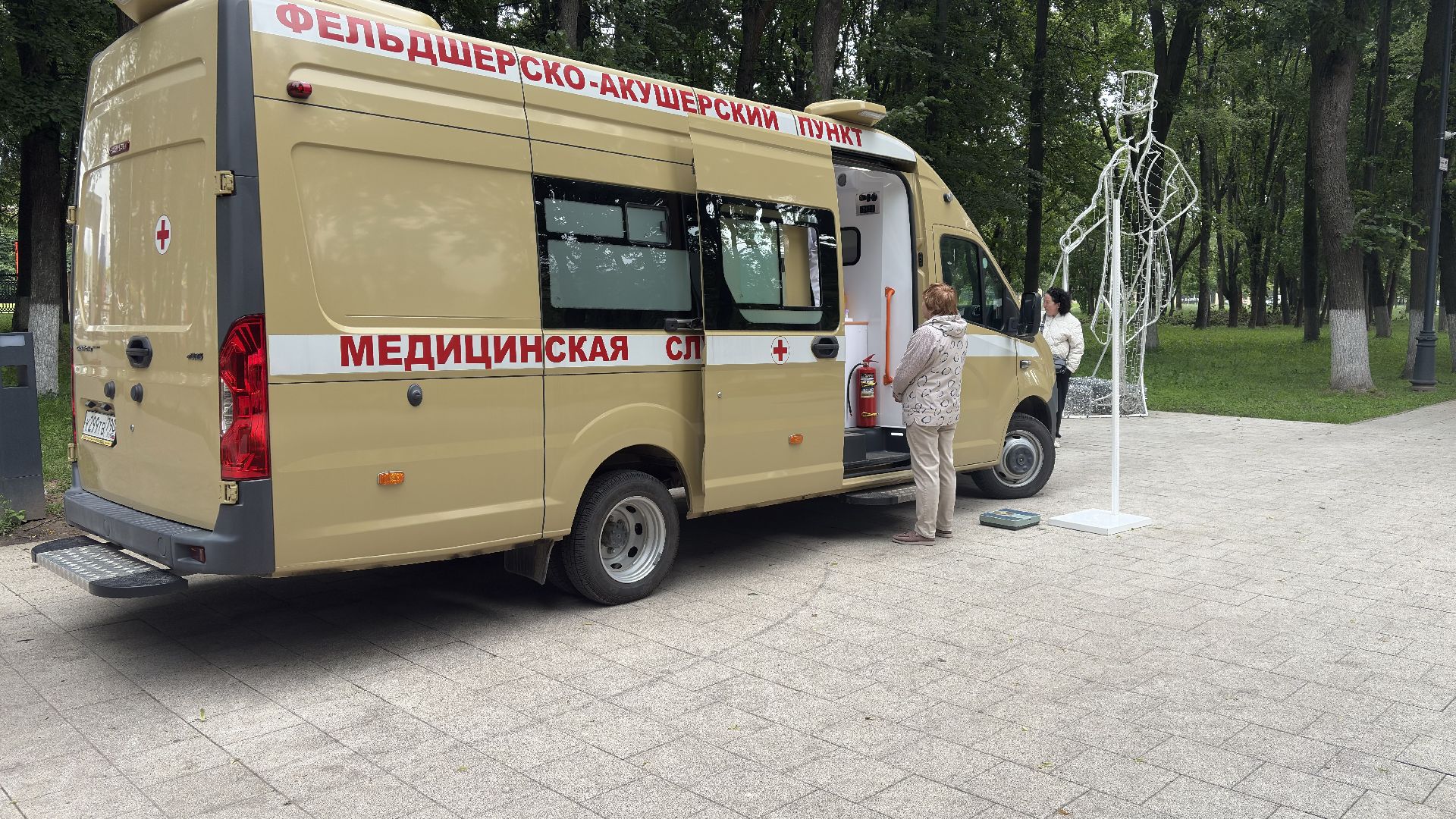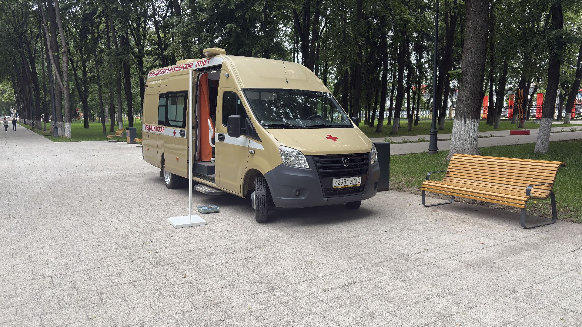 В Парке Мира стояла передвижная медицинская точка — автомобиль с узнаваемой медицинской символикой. Медики работали с 9:00 до 13:00. За это время они успели принять около десяти человек, так как на каждого уходит примерно полчаса. Работали спокойно и внимательно, без спешки. Чтобы попасть внутрь, нужно просто прийти и дождаться своей очереди, никакой предварительной записи не требуется.
