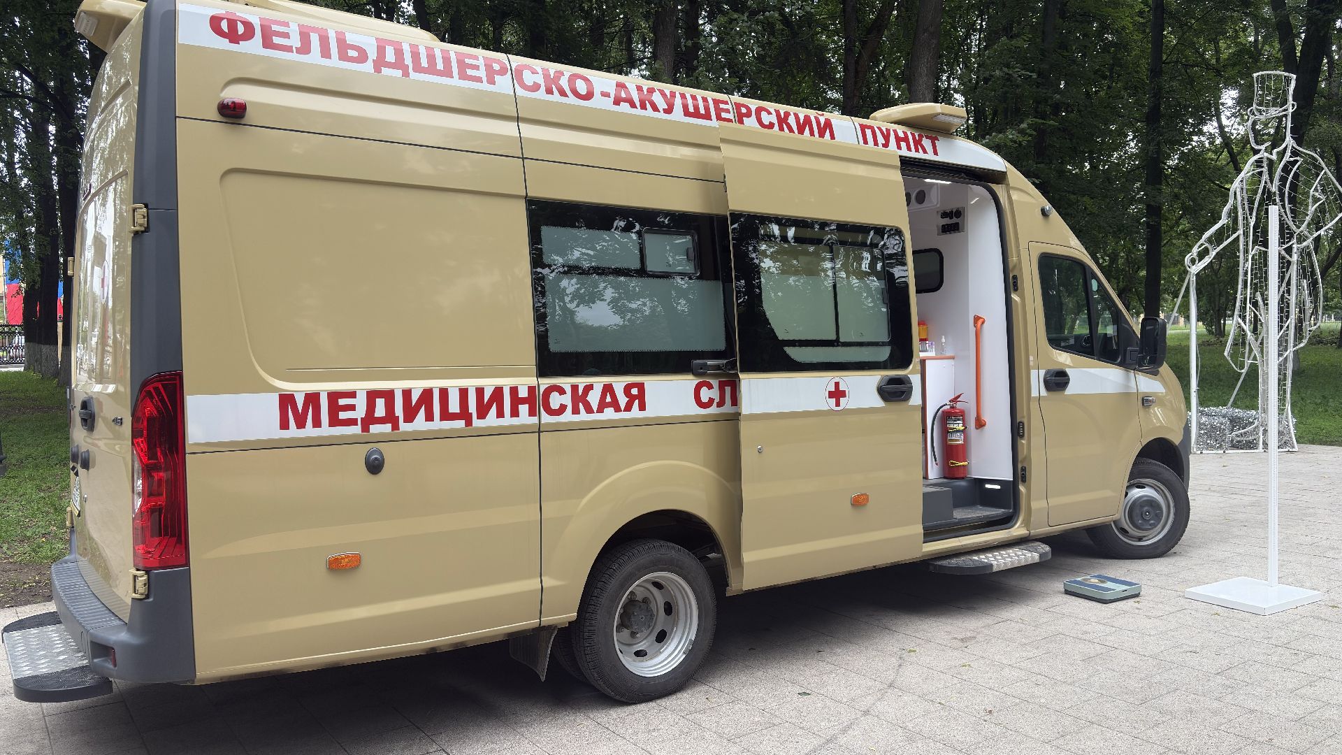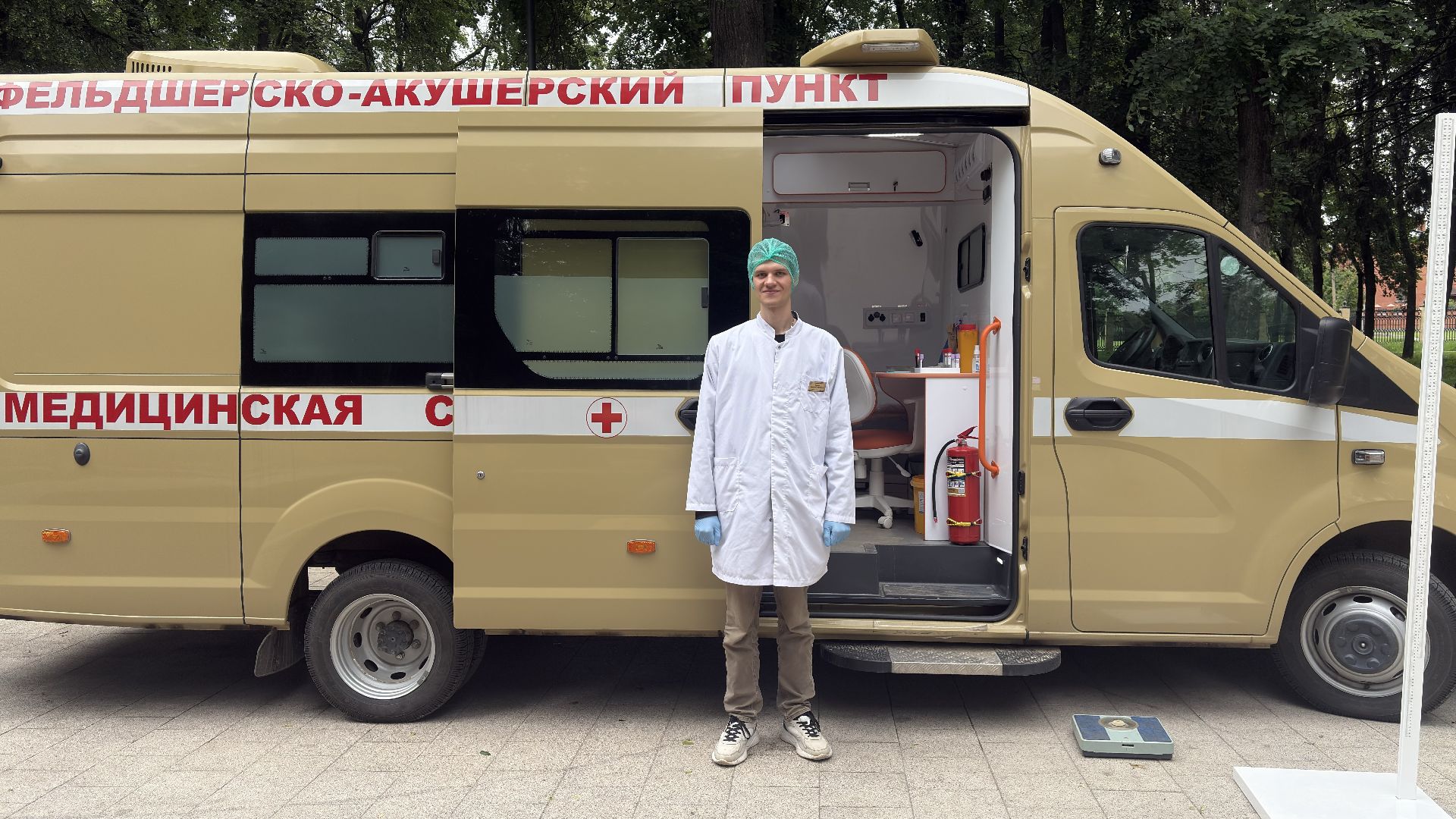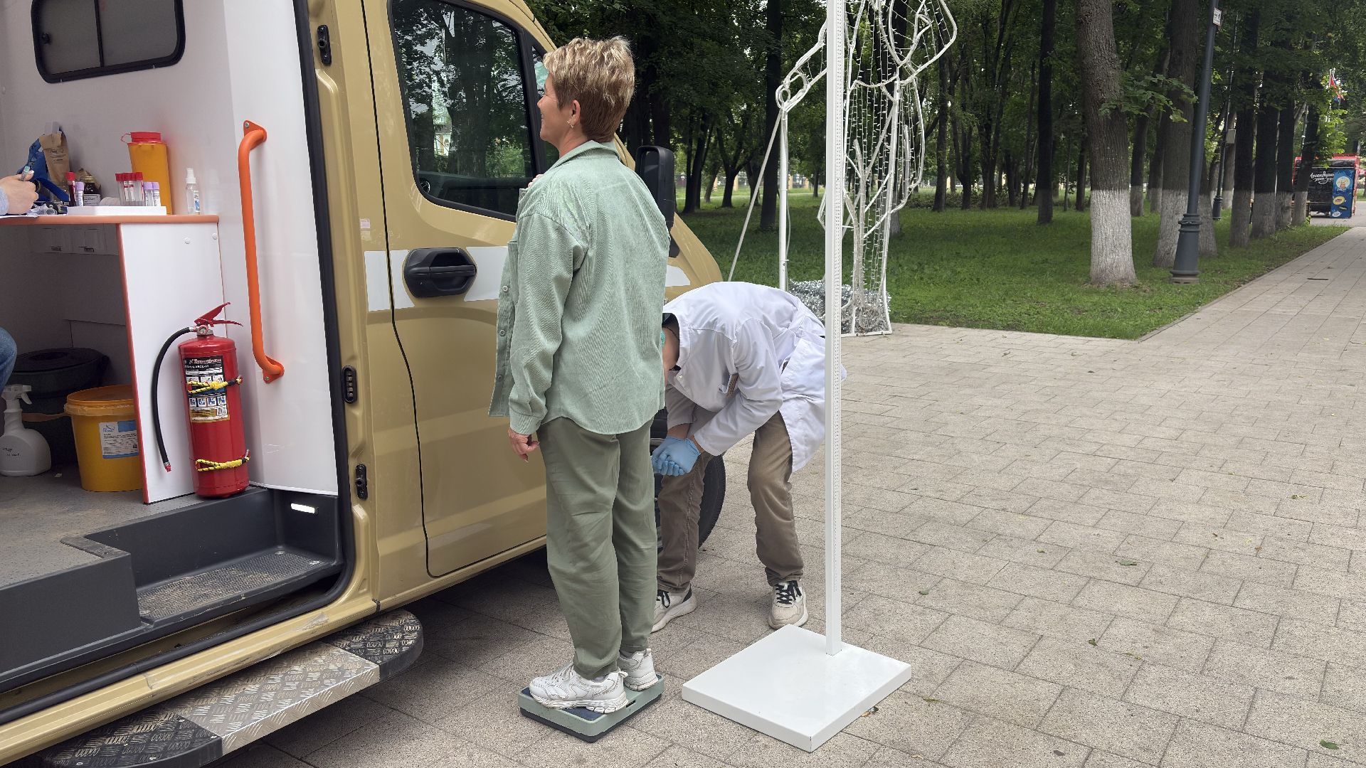 В Парке Мира стояла передвижная медицинская точка — автомобиль с узнаваемой медицинской символикой. Медики работали с 9:00 до 13:00. За это время они успели принять около десяти человек, так как на каждого уходит примерно полчаса. Работали спокойно и внимательно, без спешки. Чтобы попасть внутрь, нужно просто прийти и дождаться своей очереди, никакой предварительной записи не требуется.