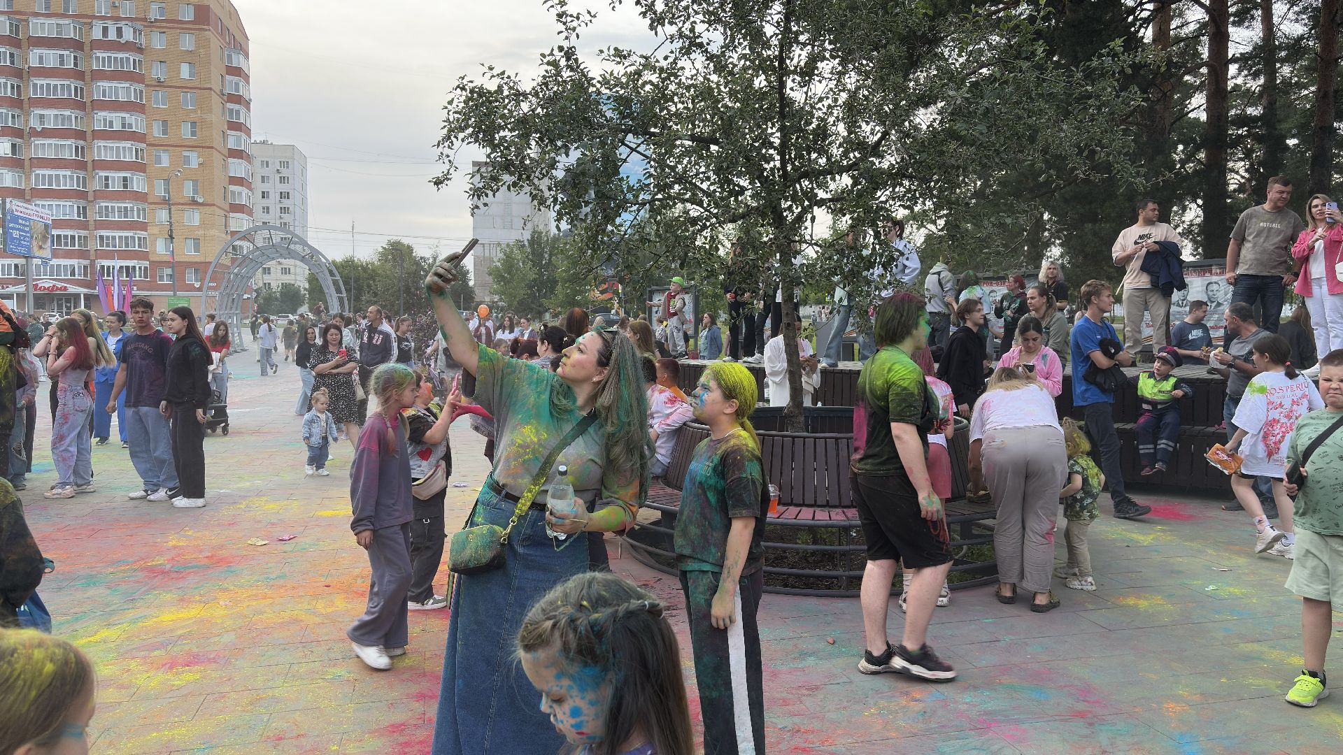 С каждой минутой участников становилось всё больше: краски летели в воздух, ложились на лица, одежду и волосы, превращая толпу в пёструю, движущуюся мозаику. Те, кто пришёл просто посмотреть, в итоге тоже оказывались в гуще событий и уже через пару залпов становились частью этой яркой картины.