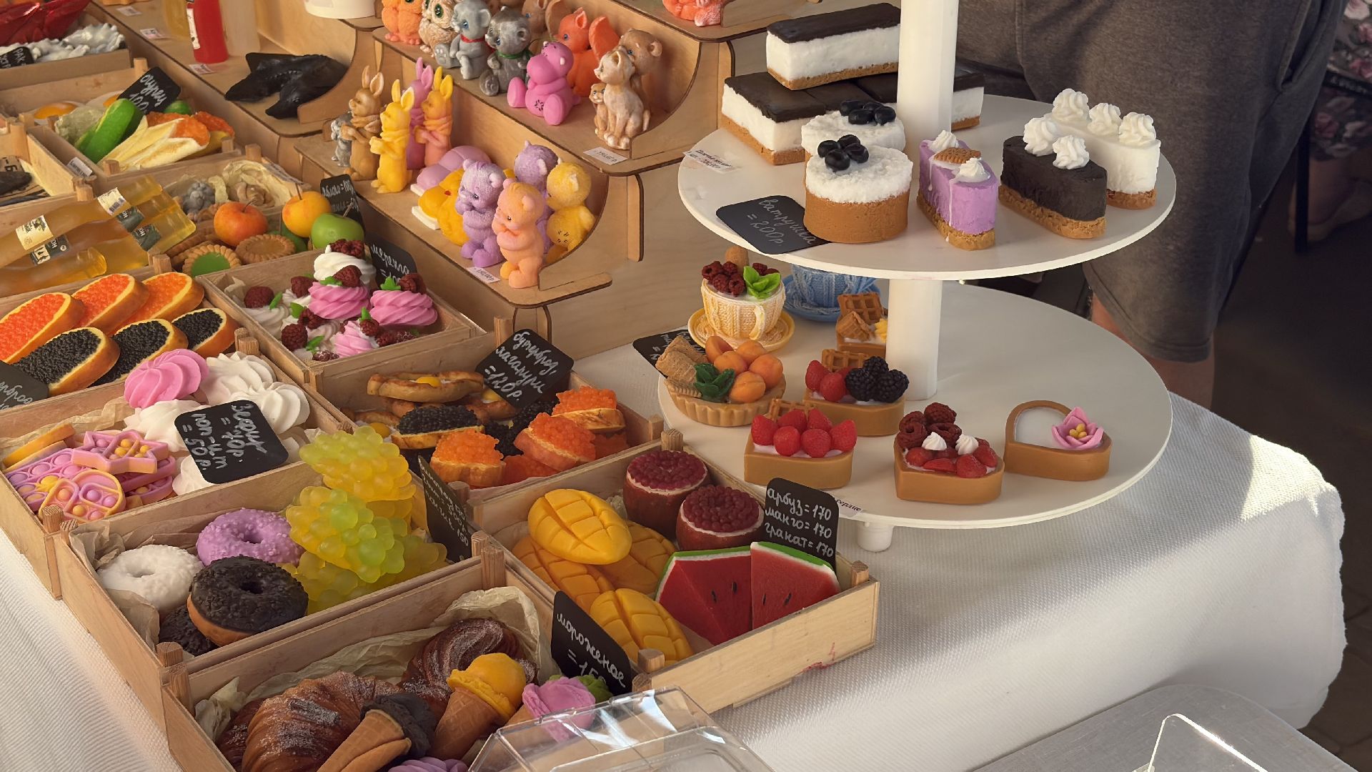 Дети с утра до вечера катались на паровозике, прыгали на батутах, красили старое пианино вместе с художниками и лепили свои маленькие шедевры в мастерских. Здесь же создавались светодиодные открытки, деревянные значки, ключницы и расписные шопперы.