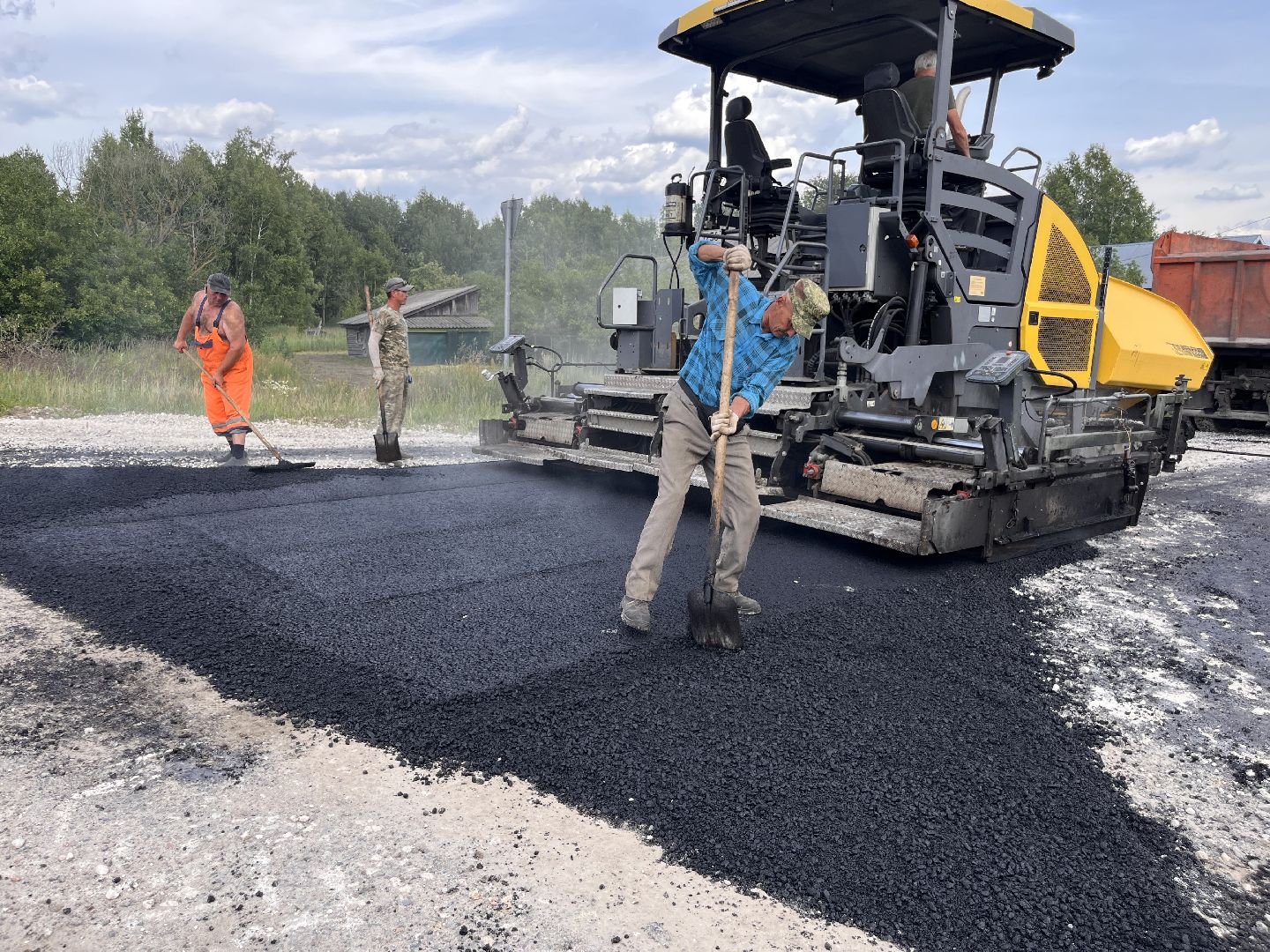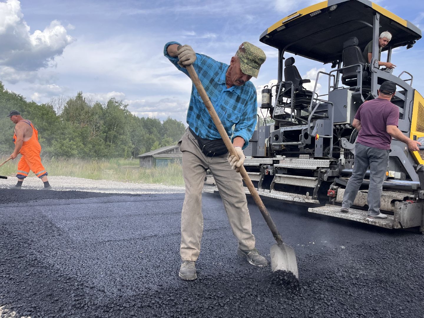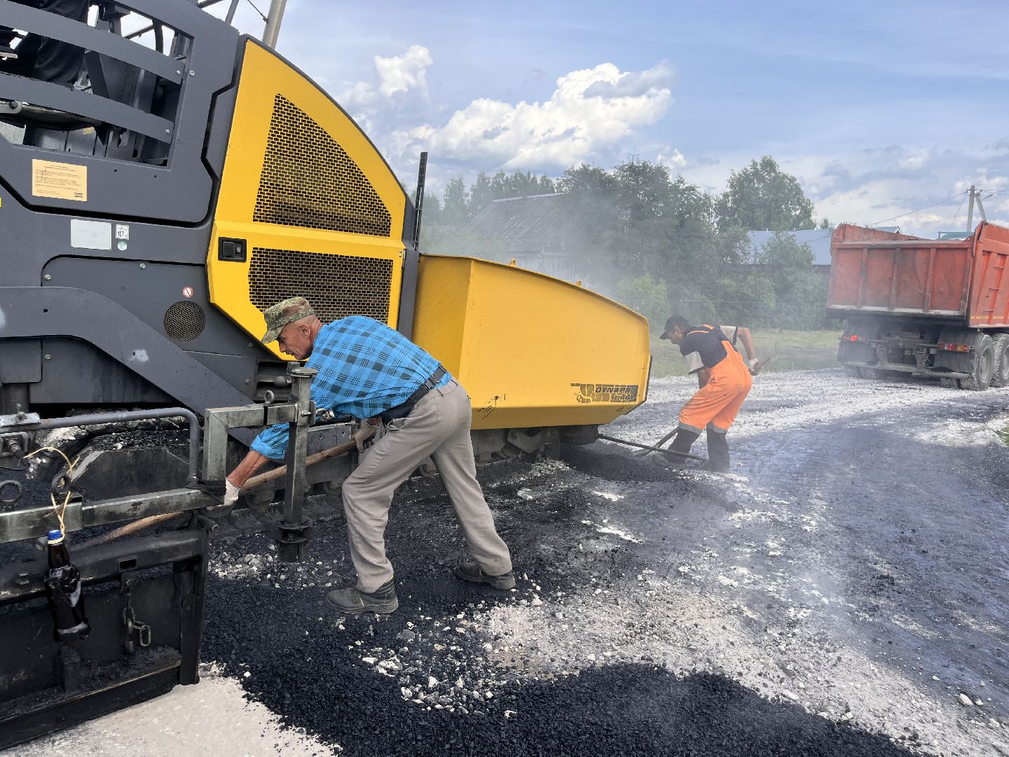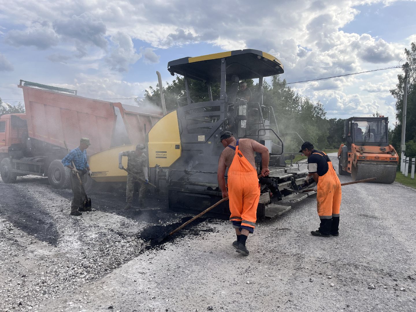 Укладка асфальта ведётся стремительно. В работе задействованы бригада из четырёх человек, шесть самосвалов, два катка и асфальтоукладчик.