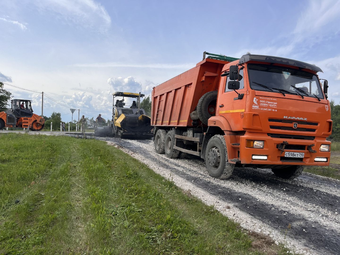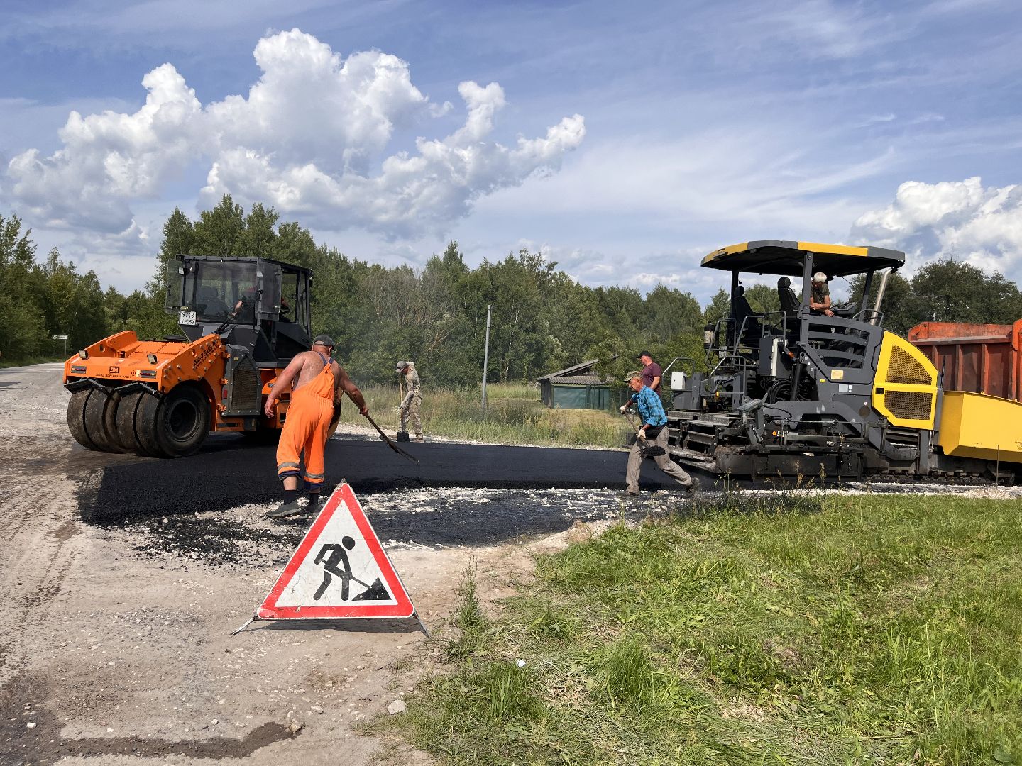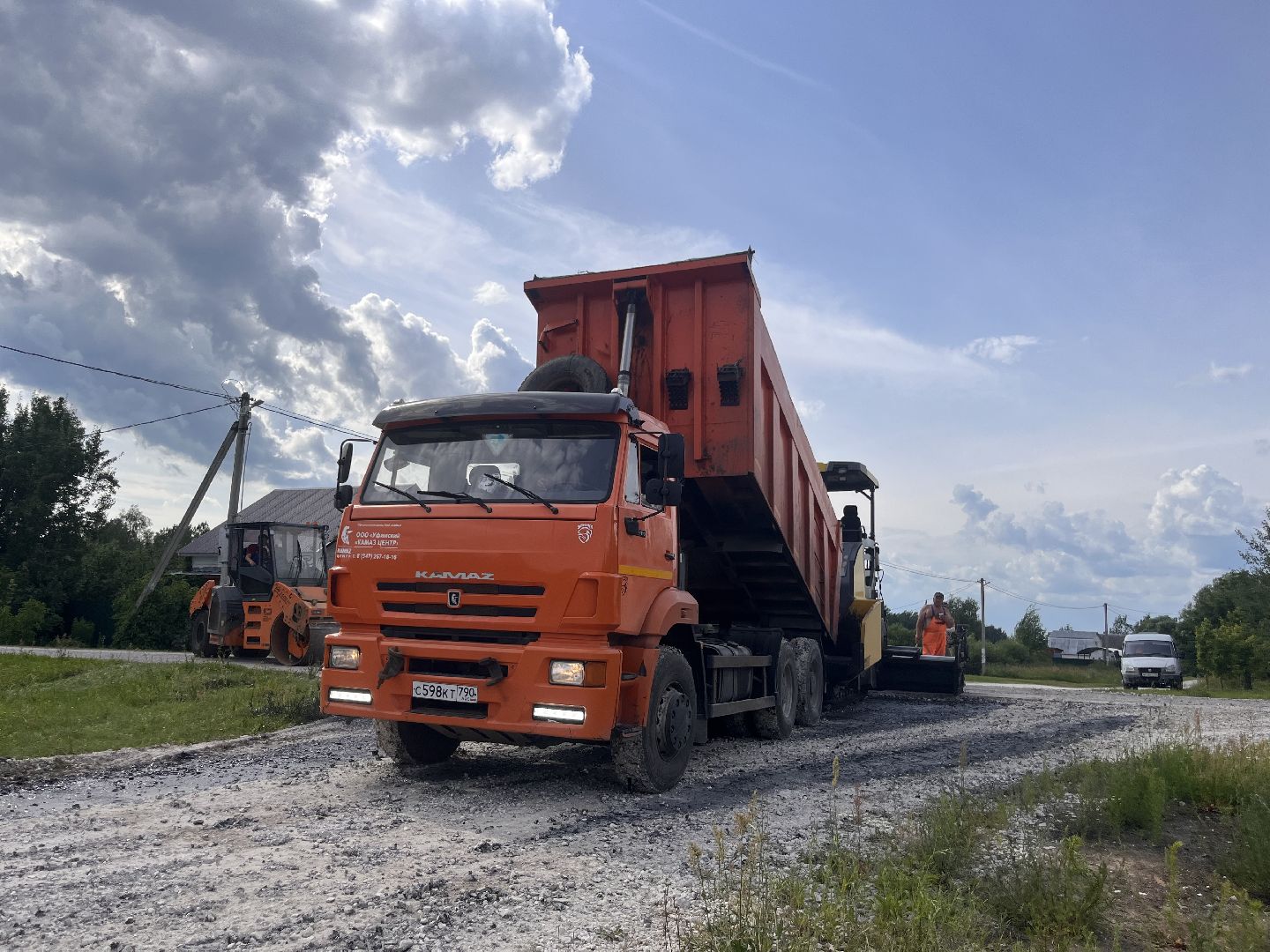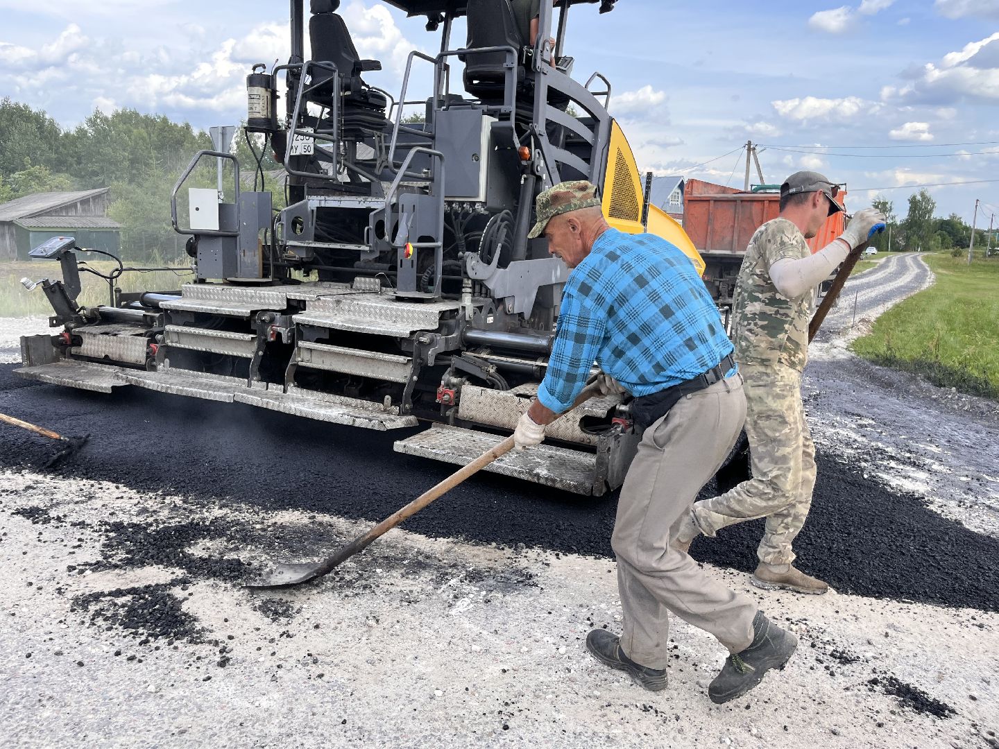 Укладка асфальта ведётся стремительно. В работе задействованы бригада из четырёх человек, шесть самосвалов, два катка и асфальтоукладчик.