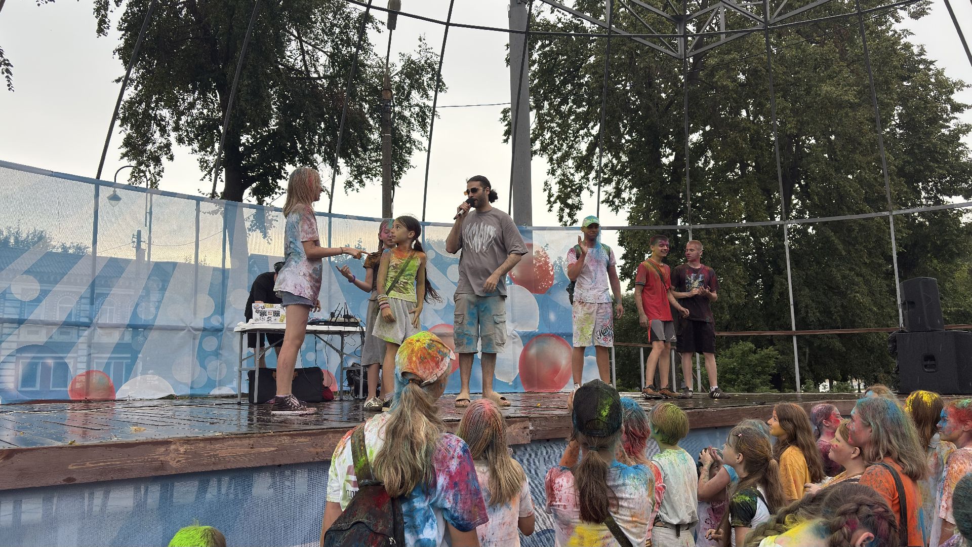 Фестиваль стартовал с музыки и конкурсов. Кто-то уже начал раскрашивать друзей прямо у сцены, кто-то снимал всё на телефон. А потом случилось главное: массовый залп красок.