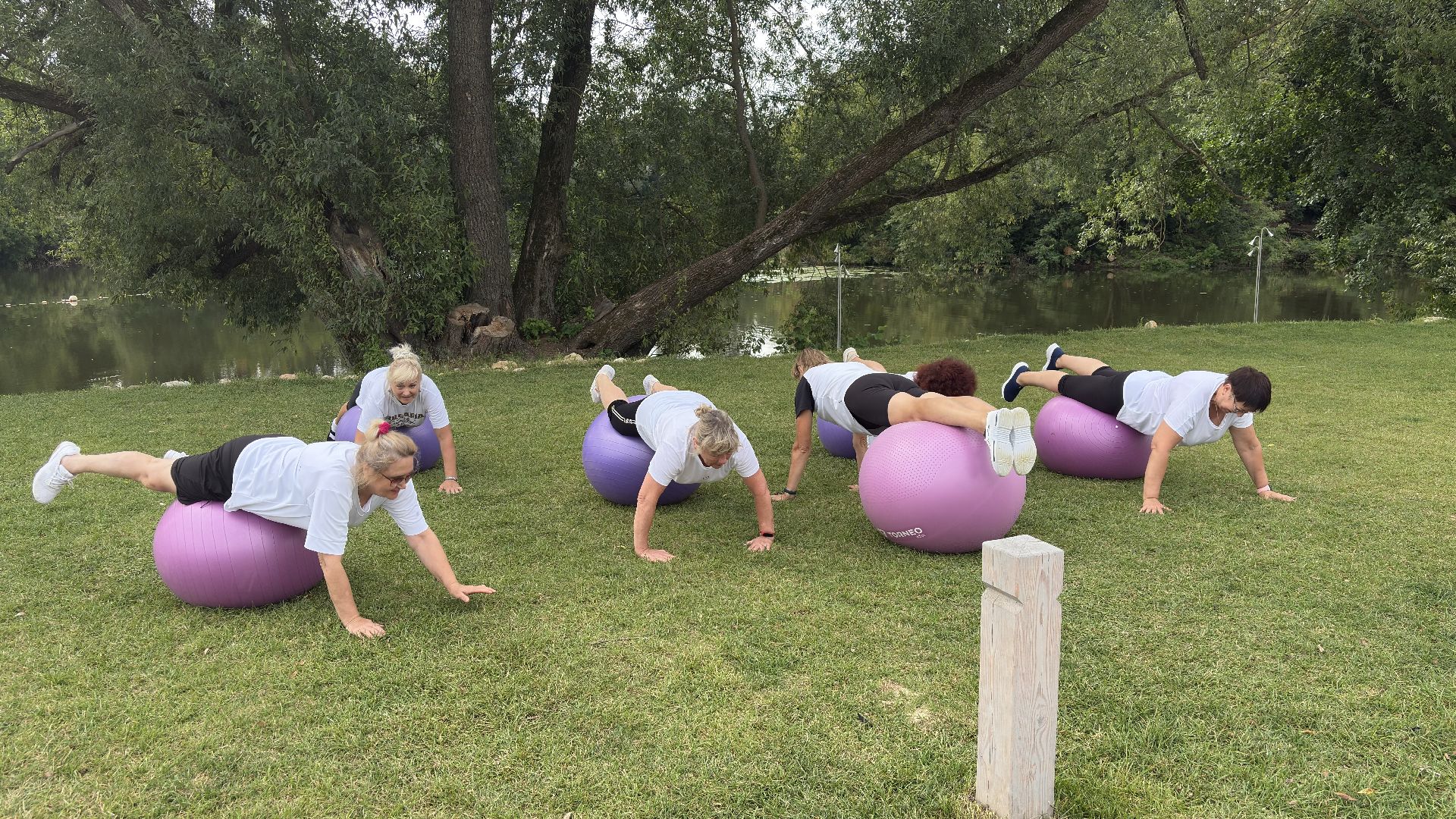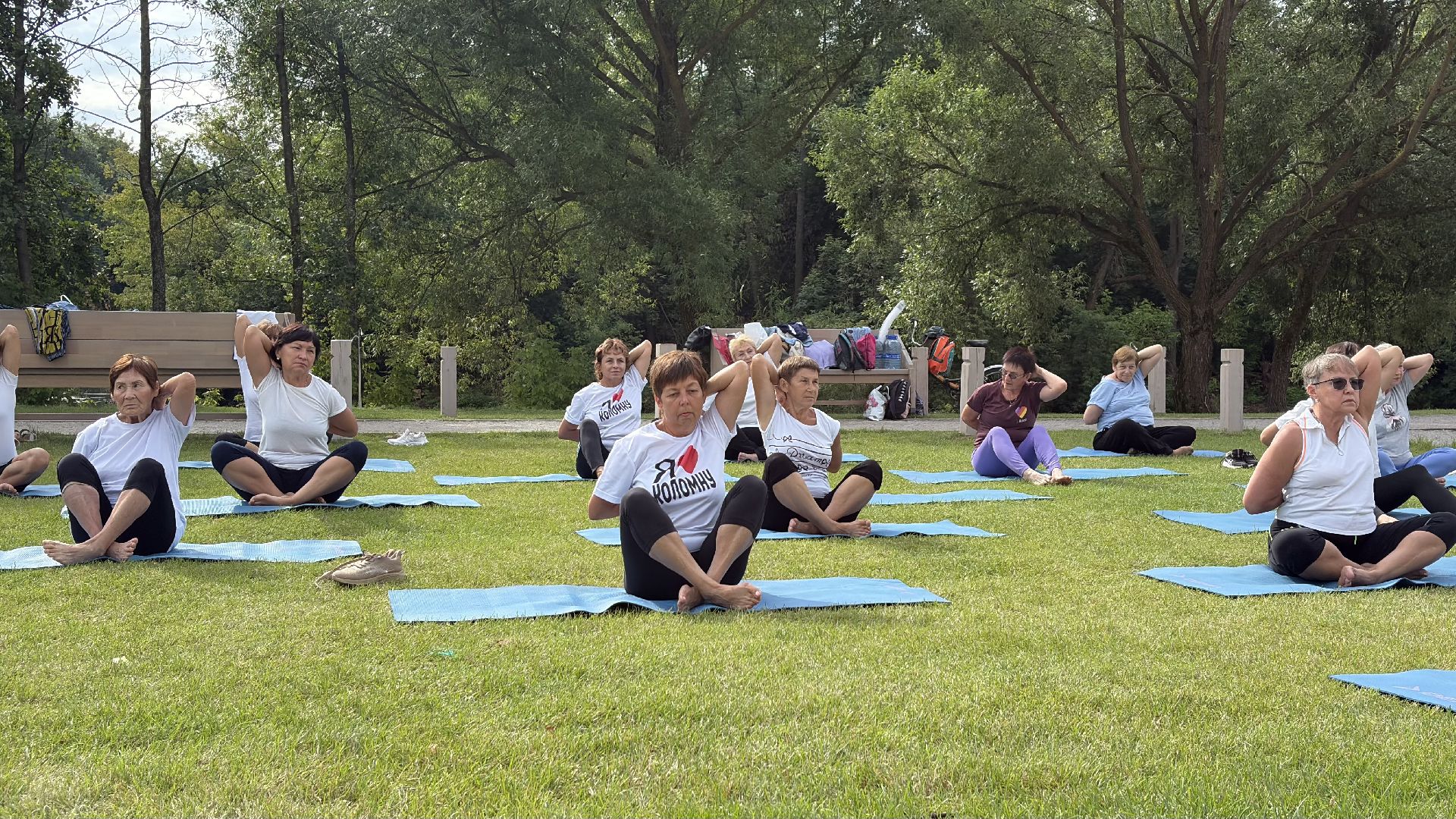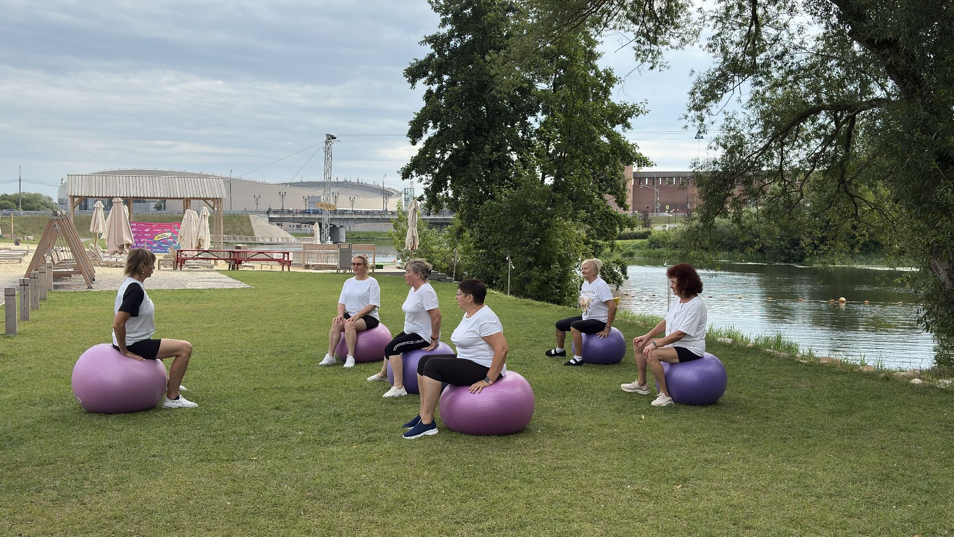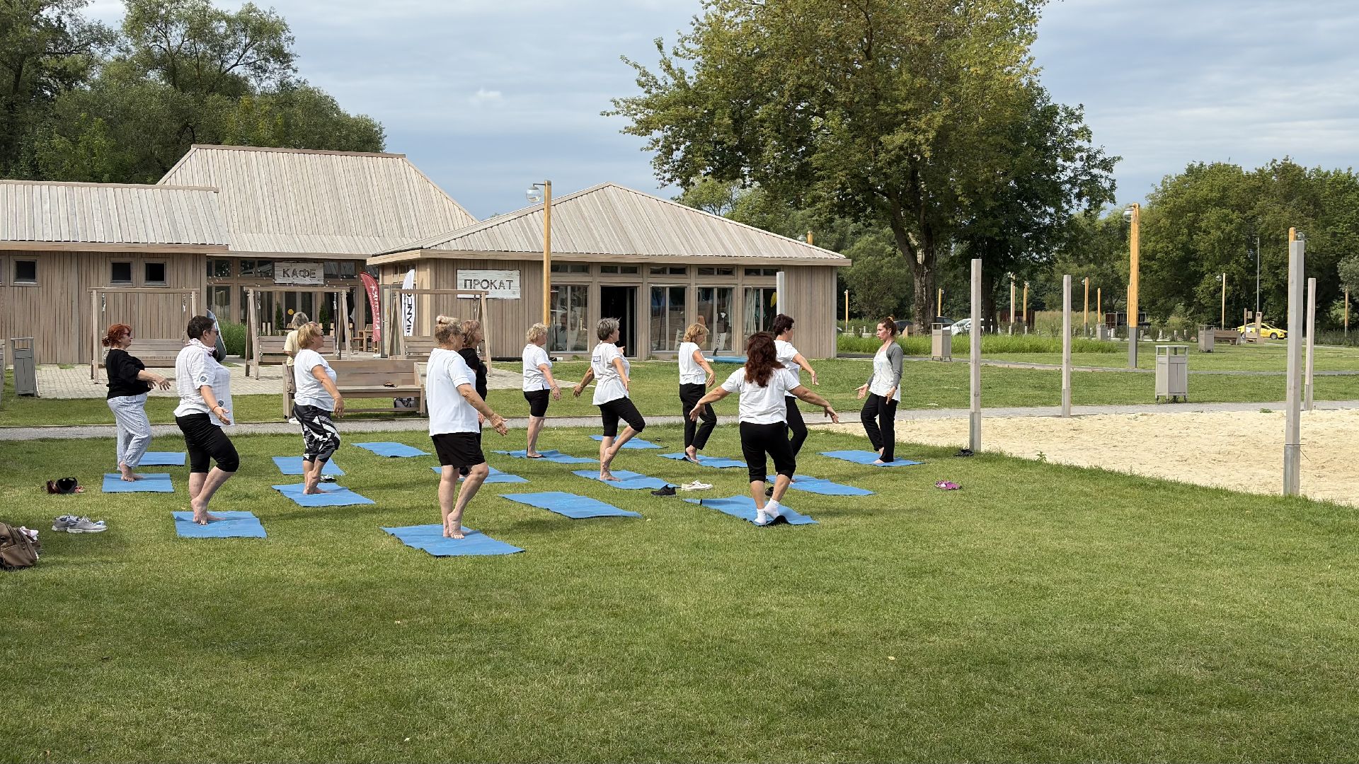 Особое внимание в программе было уделено йога-терапии, направленной на мягкую проработку тела и внутреннюю гармонизацию. Затем прошёл комплекс упражнений для шеи. Важная часть тренировки, направленная на снятие зажимов, восстановление кровообращения и профилактику головных болей. Следом участников ждали занятия на фитболах, которые позволили включить в работу крупные группы мышц, задействовать баланс и дыхание, а также укрепить сердечно-сосудистую систему.
