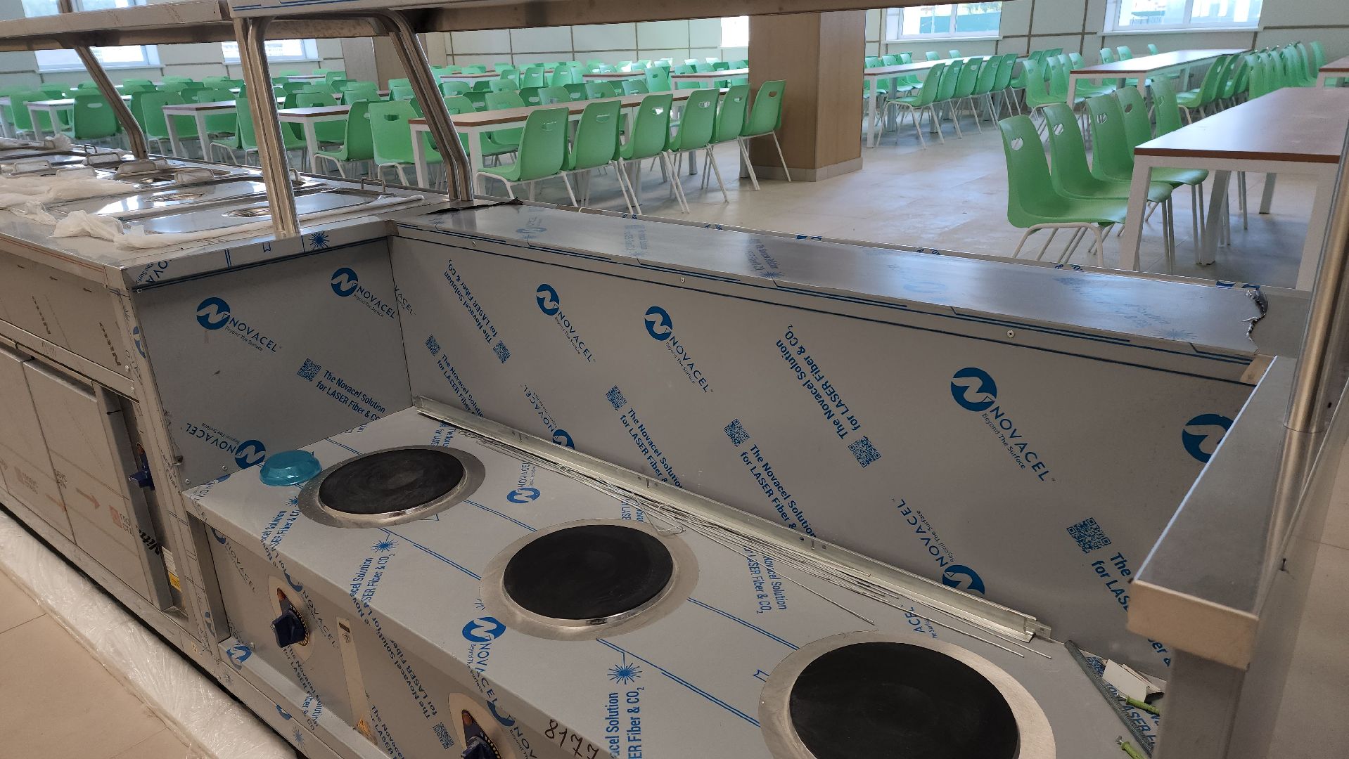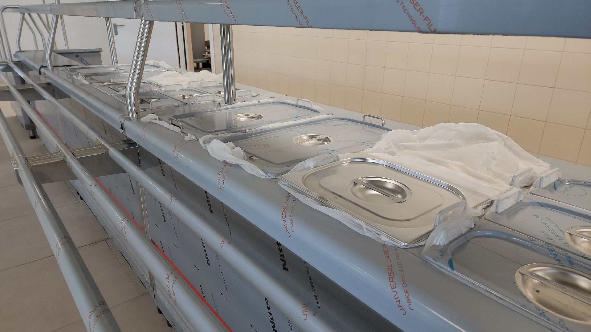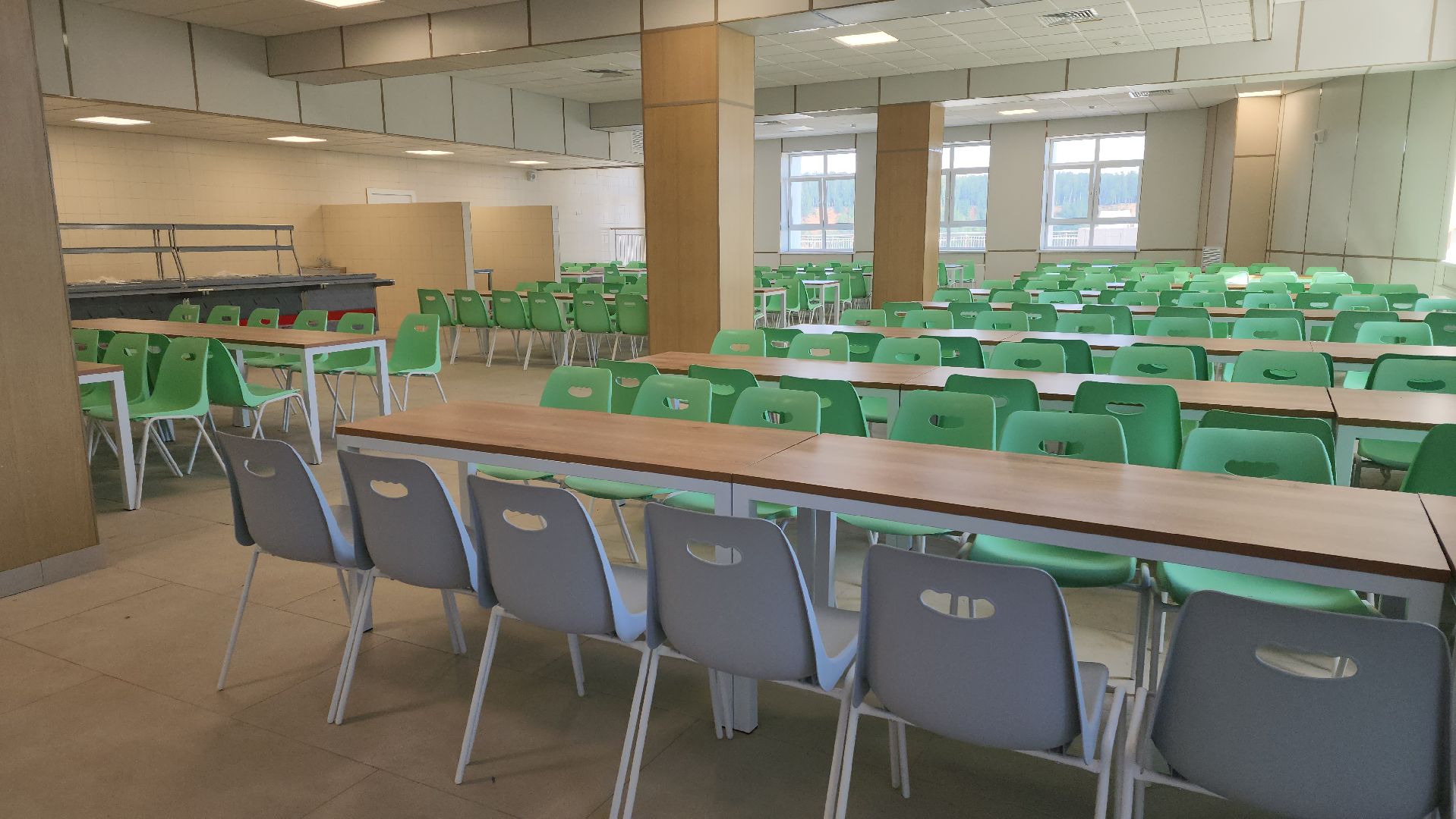 В школе будут специализированные кабинеты, оборудованные для занятий по физике, химии, биологии, библиотека, столовая на 550 посадочных мест. Пищеблок полного цикла, здесь будут готовить и для школьников, и для дошкольников. Оборудование для него: вытяжки, холодильники, плиты, слайсеры, а также посуду – привезли, специалисты занимаются установкой.