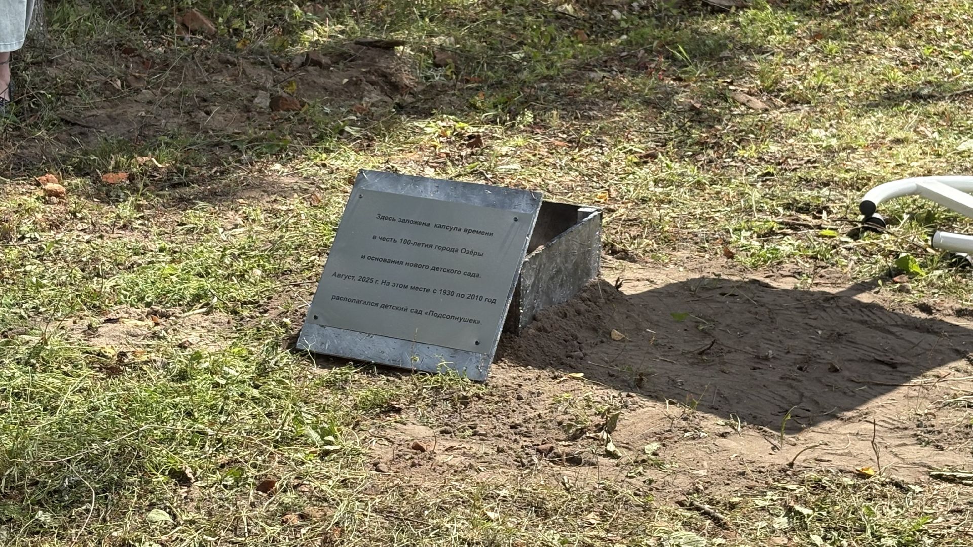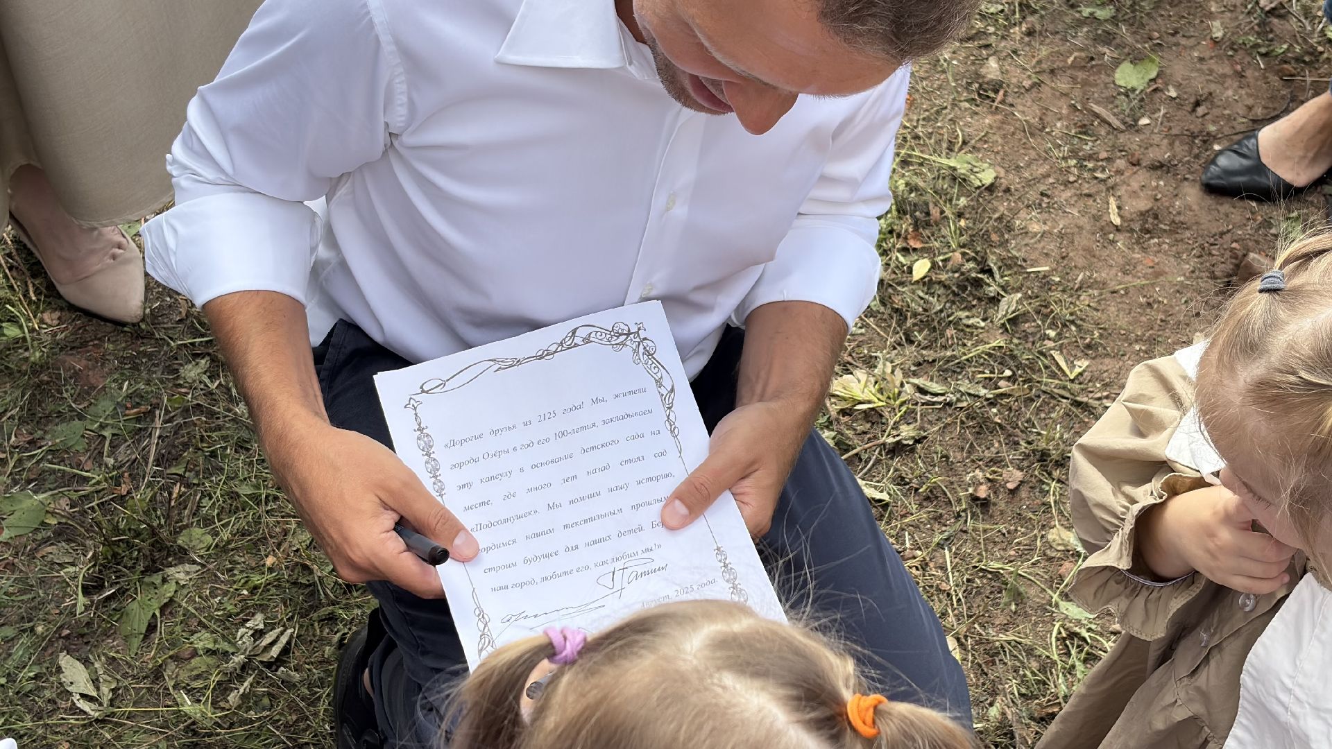 15 августа на стройплощадке прошла особая церемония. В фундамент будущего сада заложили капсулу времени. Вместе с главой г. о. Коломна Александром Гречищевым и депутатом Государственной думы Никитой Чаплиным в ней участвовали дети. В металлический тубус они поместили письмо жителям 2125 года и свои рисунки.