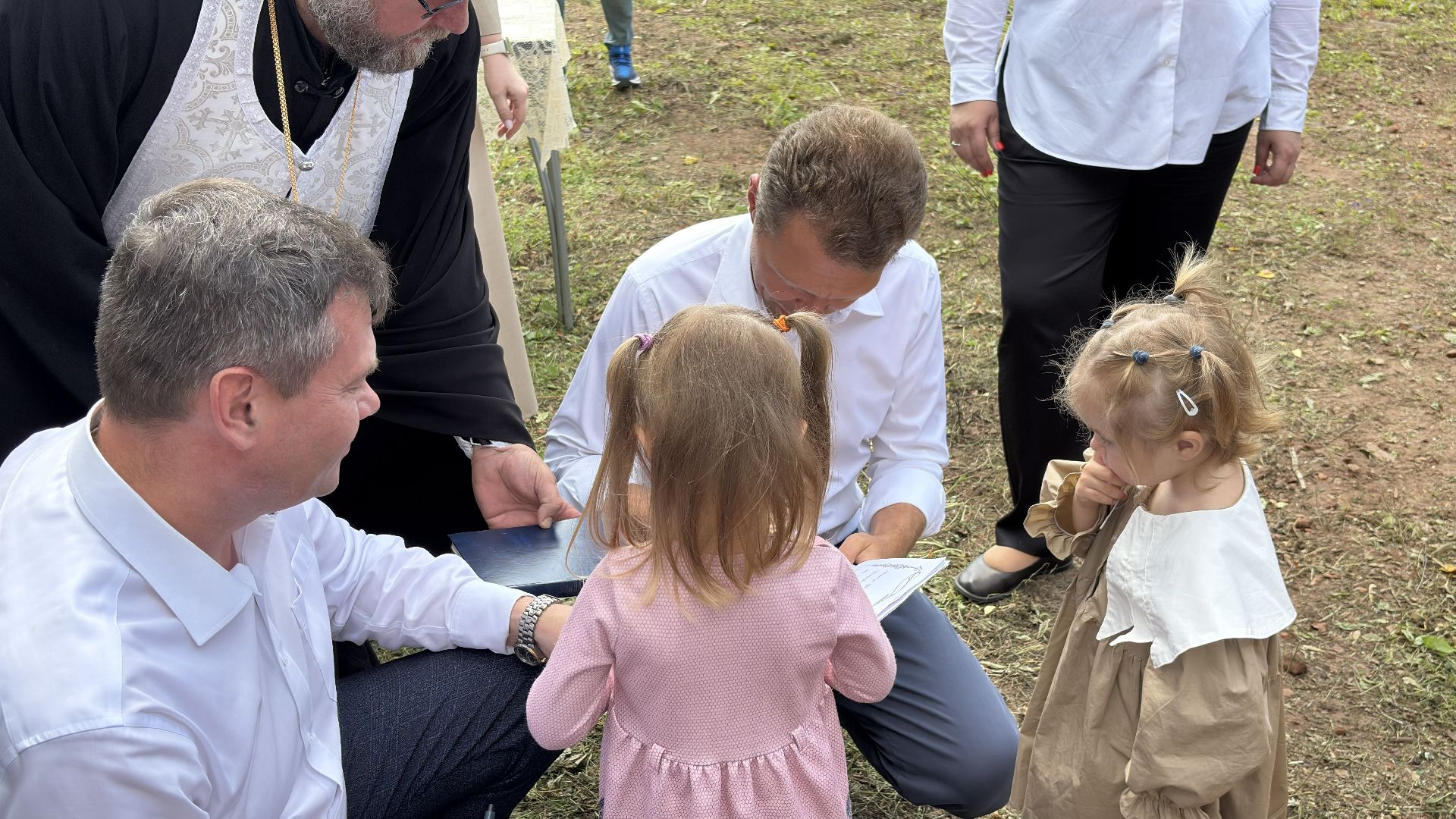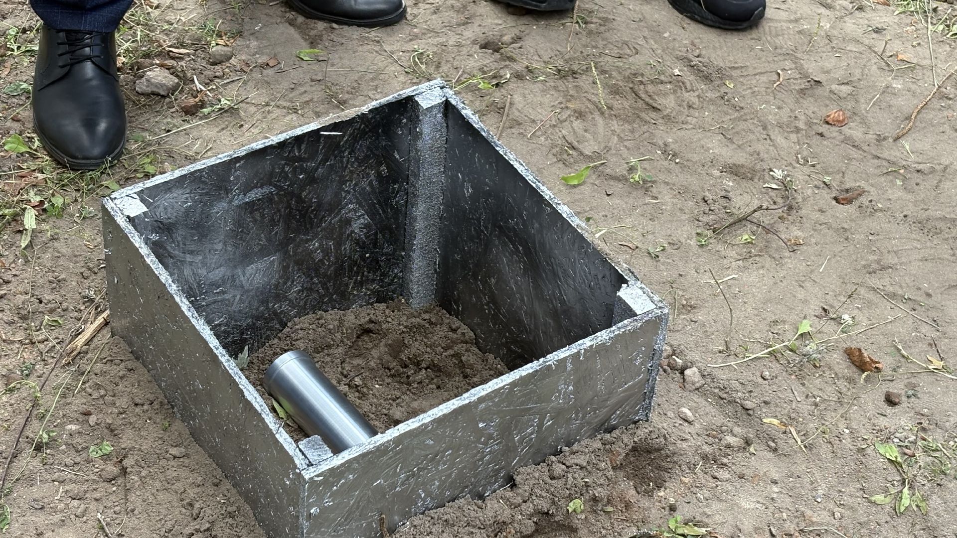 Ребята вместе с почётными гостями аккуратно перенесли капсулу к месту установки и закрыли памятной плитой, закрепив её так, чтобы открыть можно было только через сто лет.