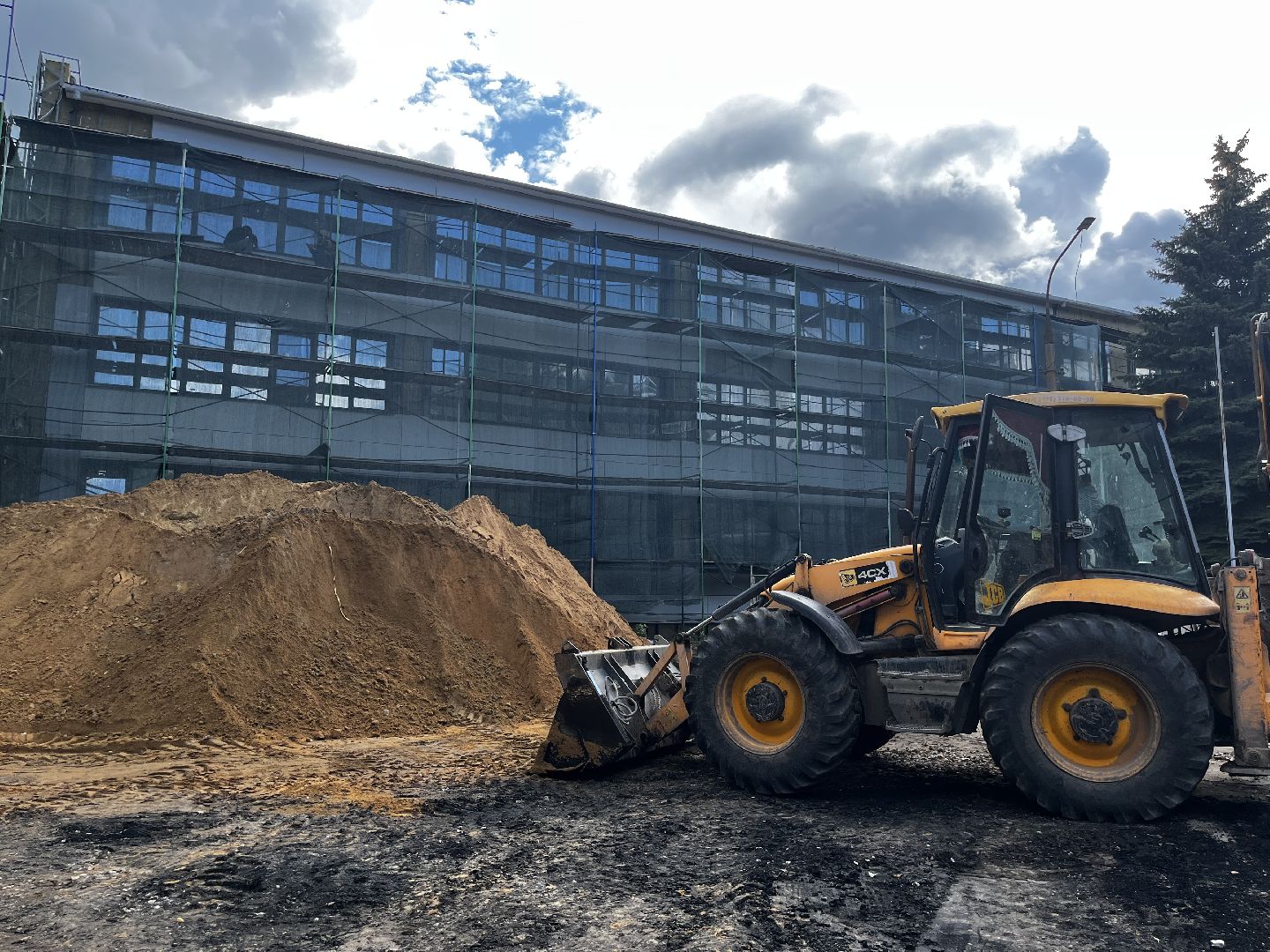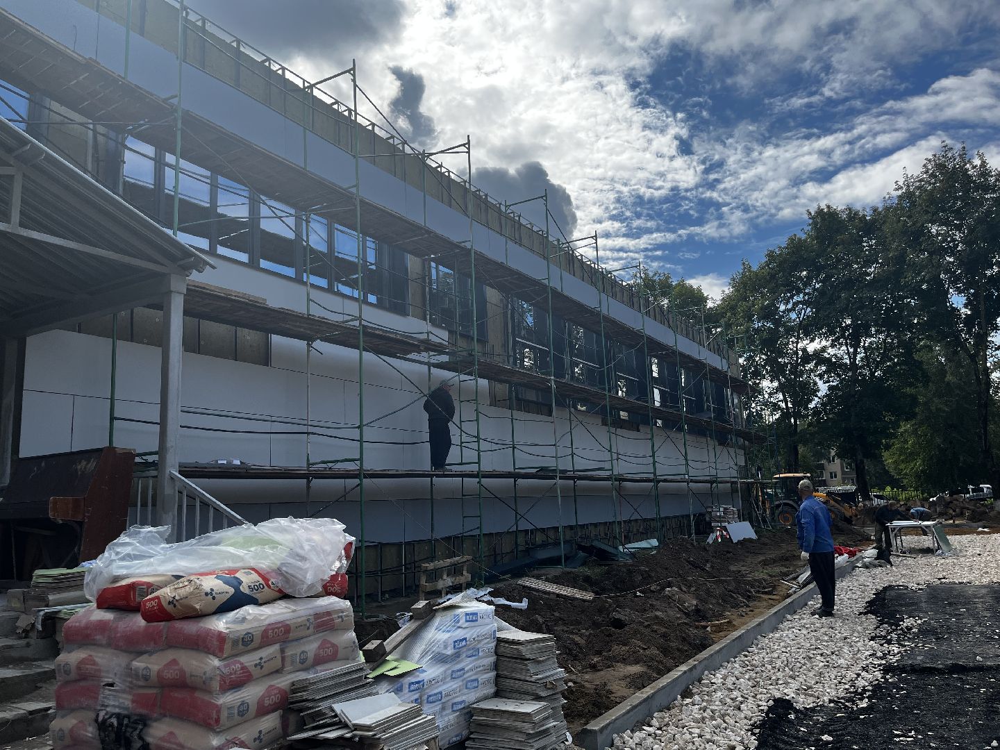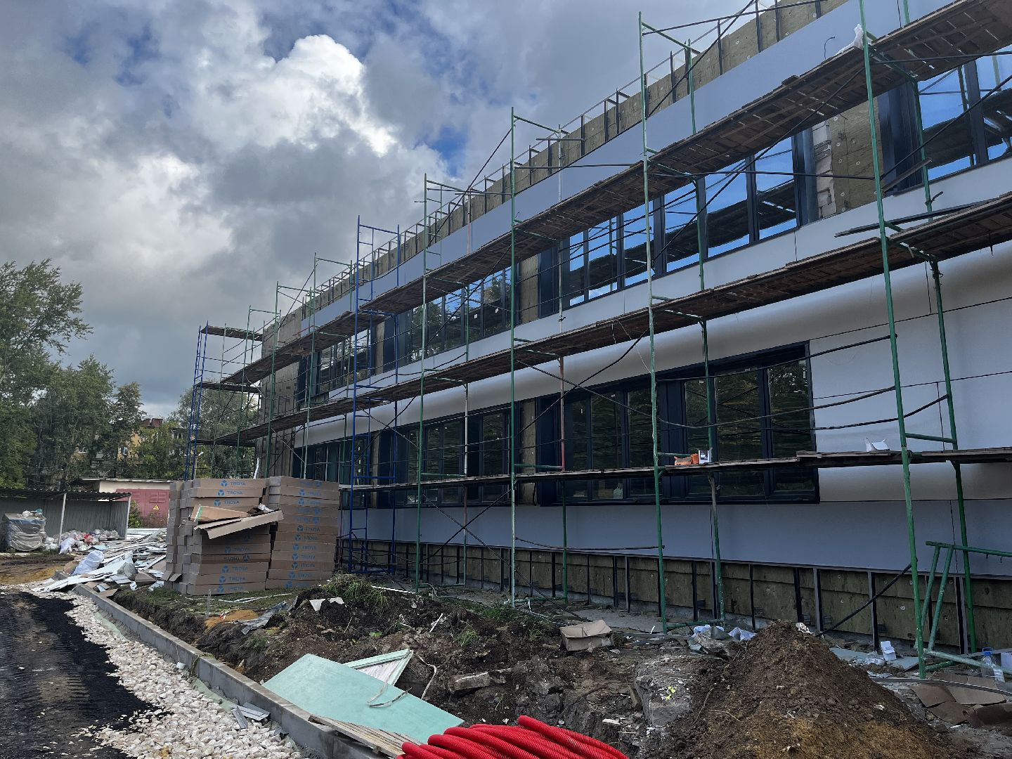 Значительные работы ведутся снаружи здания. Отделка фасада современными фиброцементными плитами выполнена на 80%. Одновременно идёт благоустройство прилегающей территории: началась укладка асфальта.