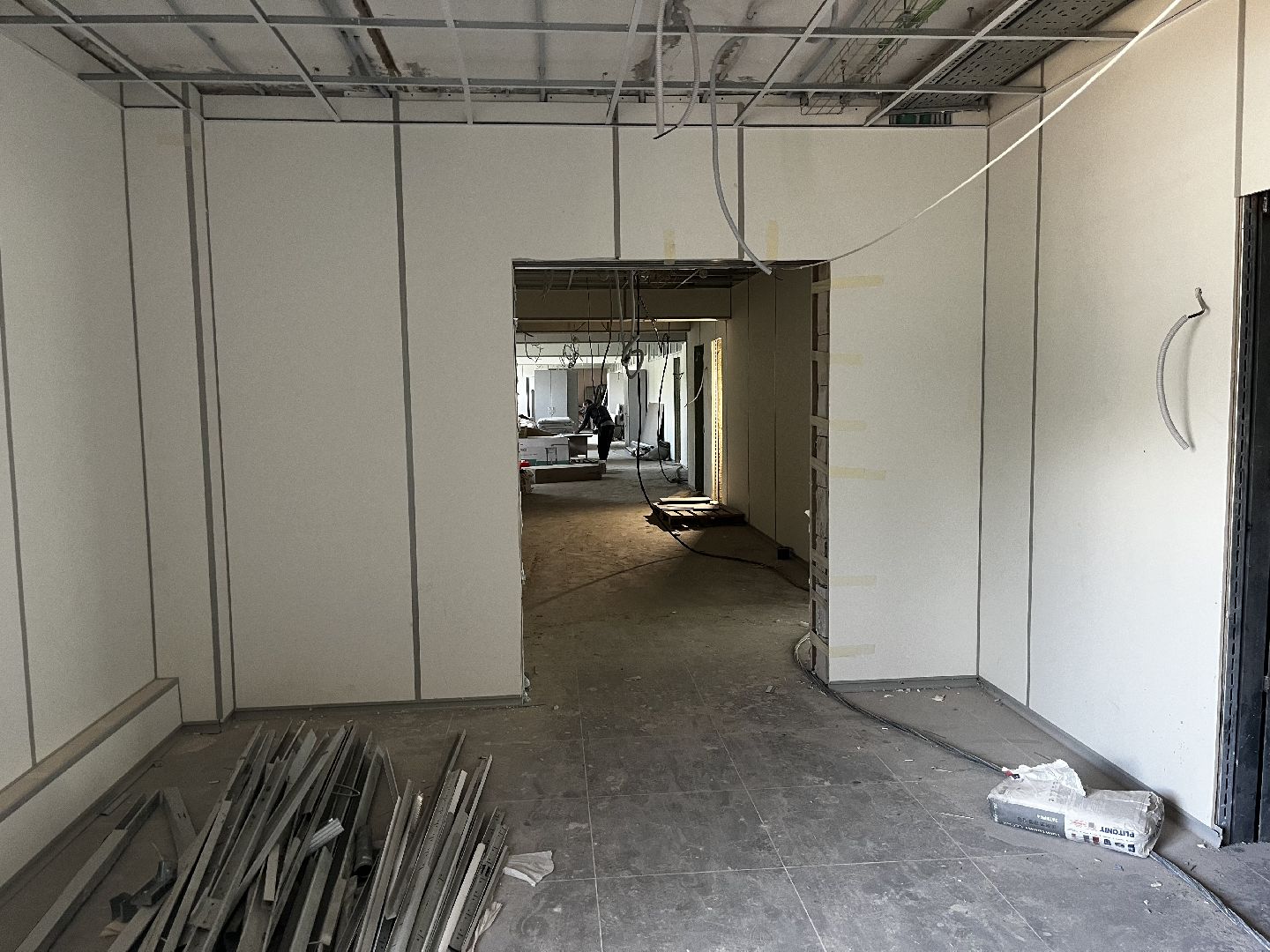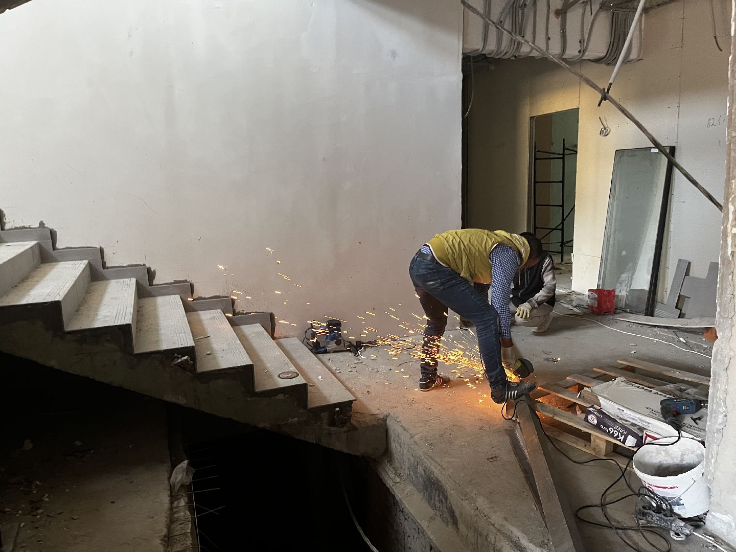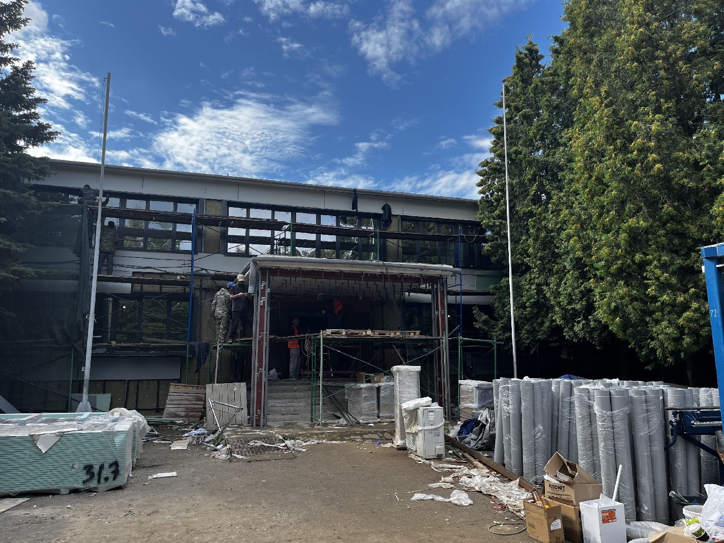 Значительные работы ведутся снаружи здания. Отделка фасада современными фиброцементными плитами выполнена на 80%. Одновременно идёт благоустройство прилегающей территории: началась укладка асфальта.