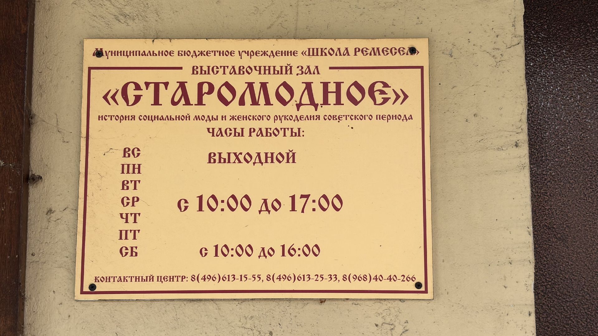 Посещение выставочного зала «Старомодное» возможно по предварительной записи. Пространство работает с 10:00 до 18:00 ежедневно. Записаться можно по телефону: +7 (4966) 13-15-55. Возрастные ограничения: 6+.