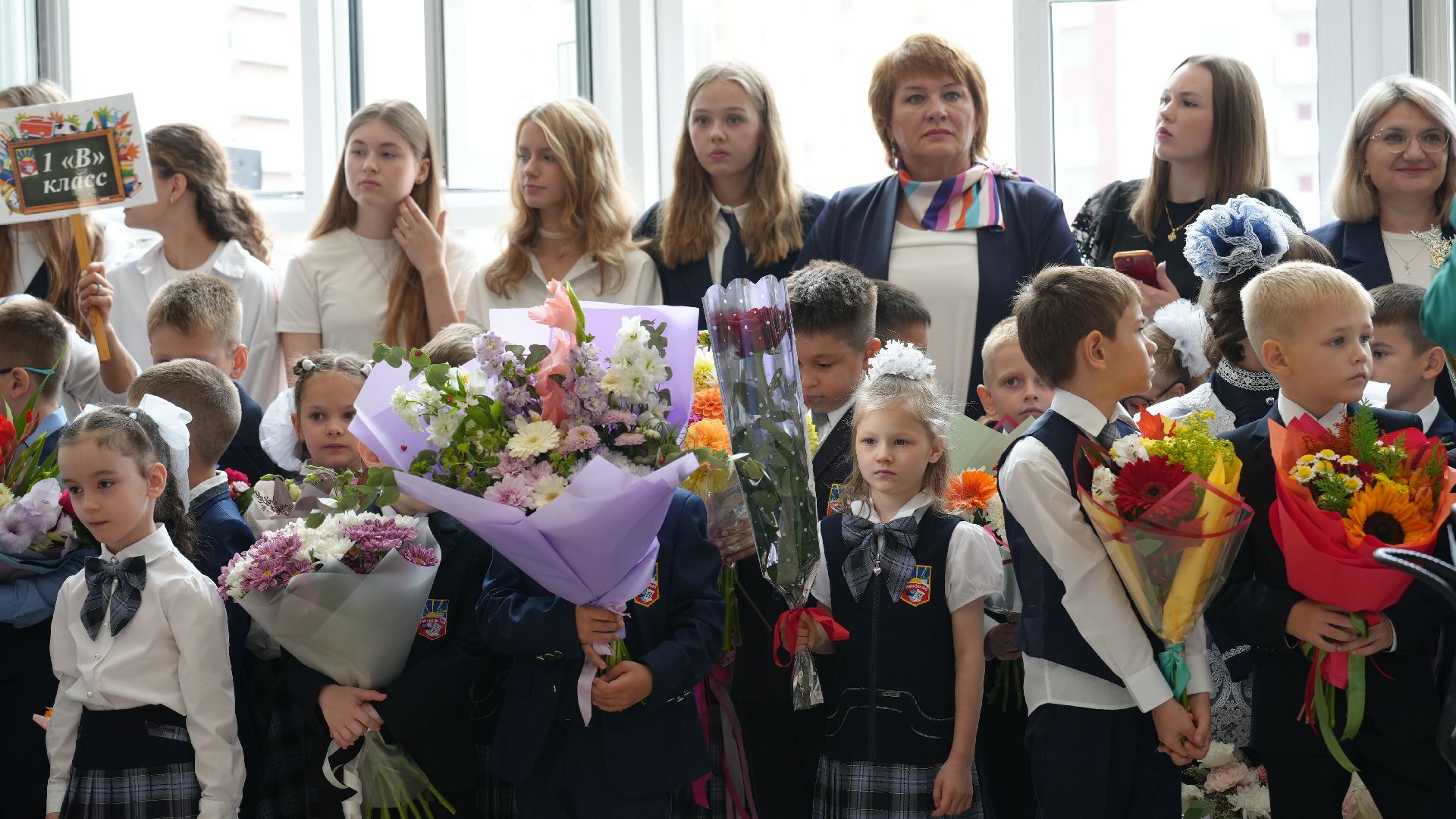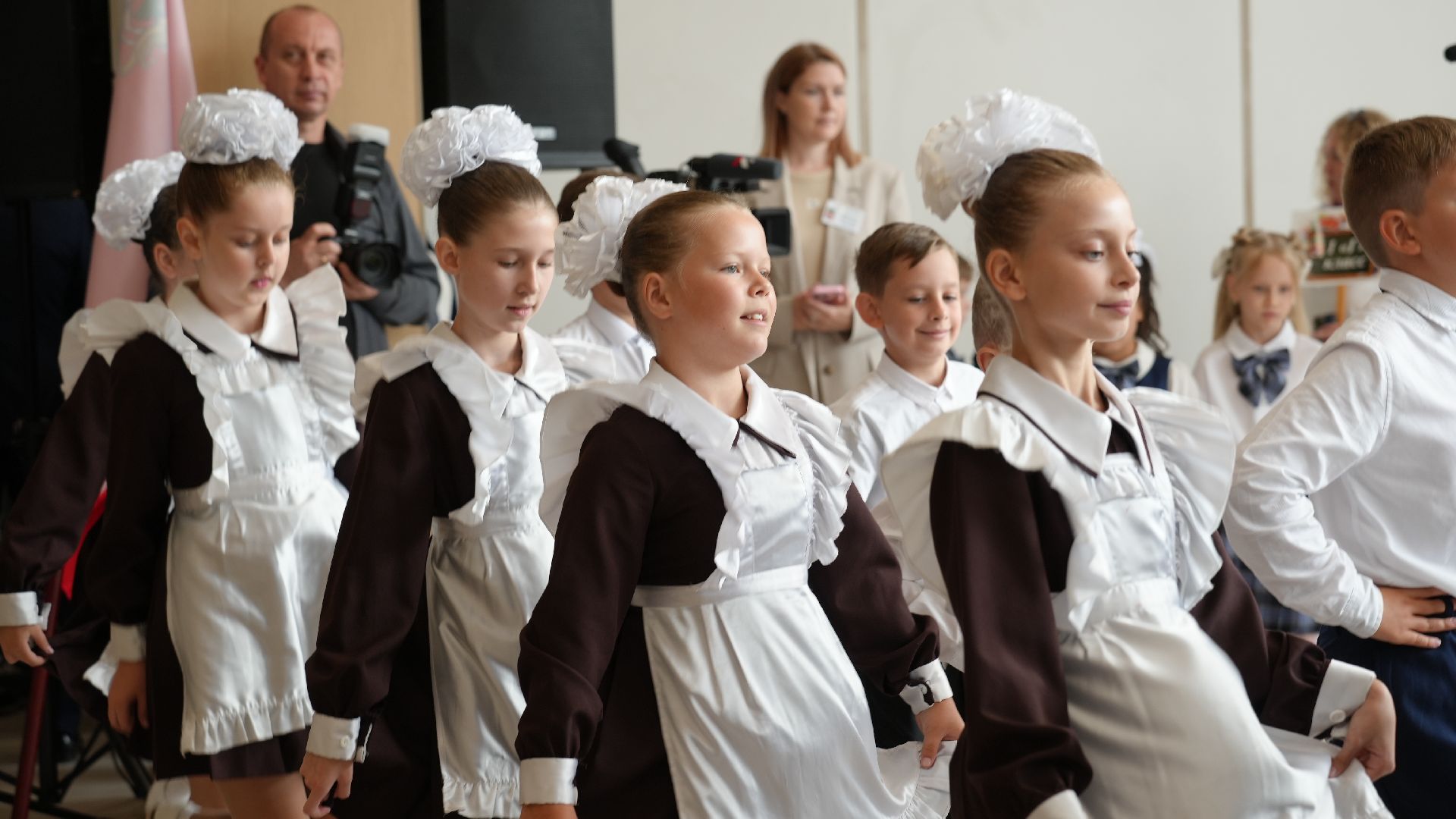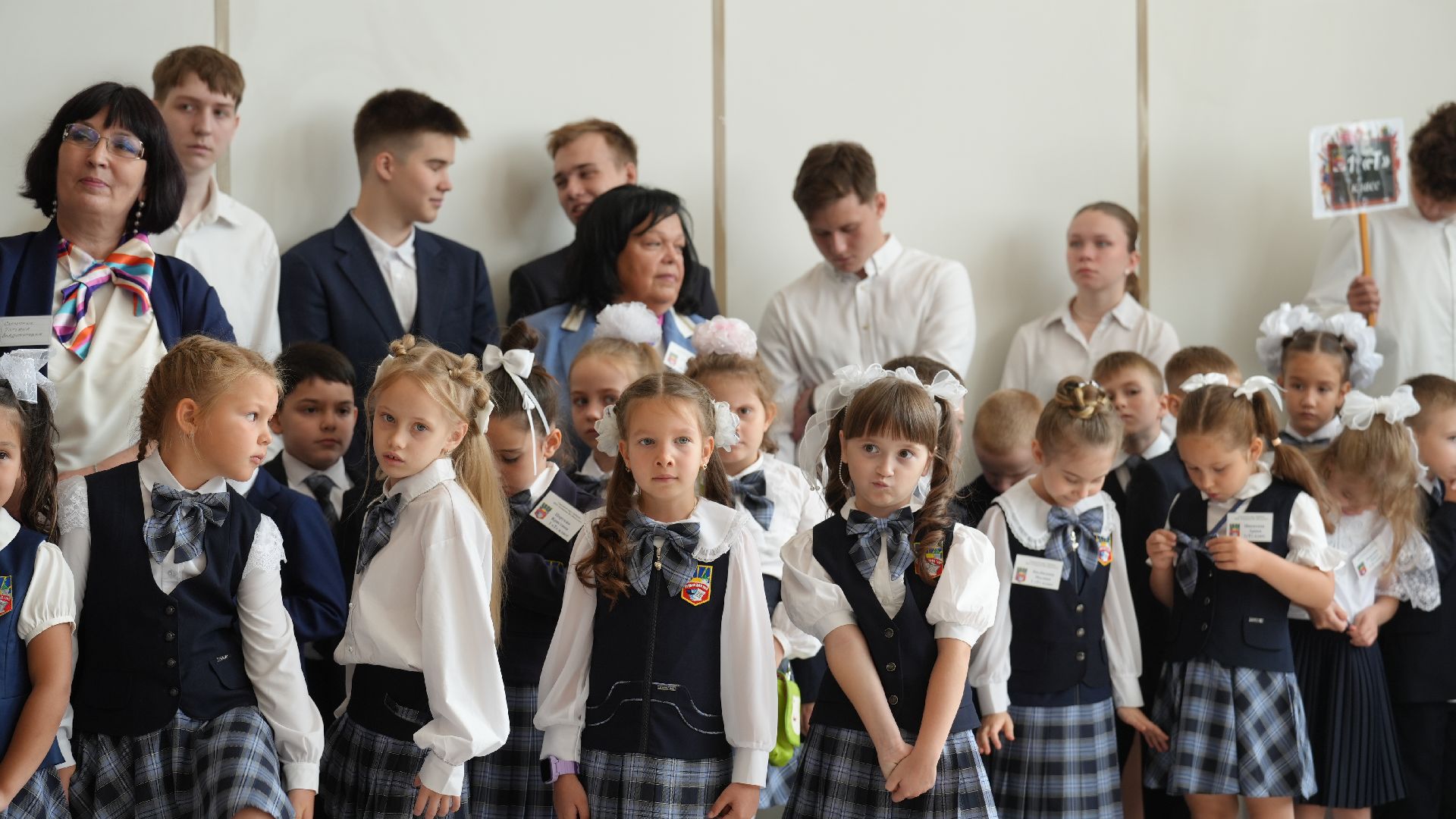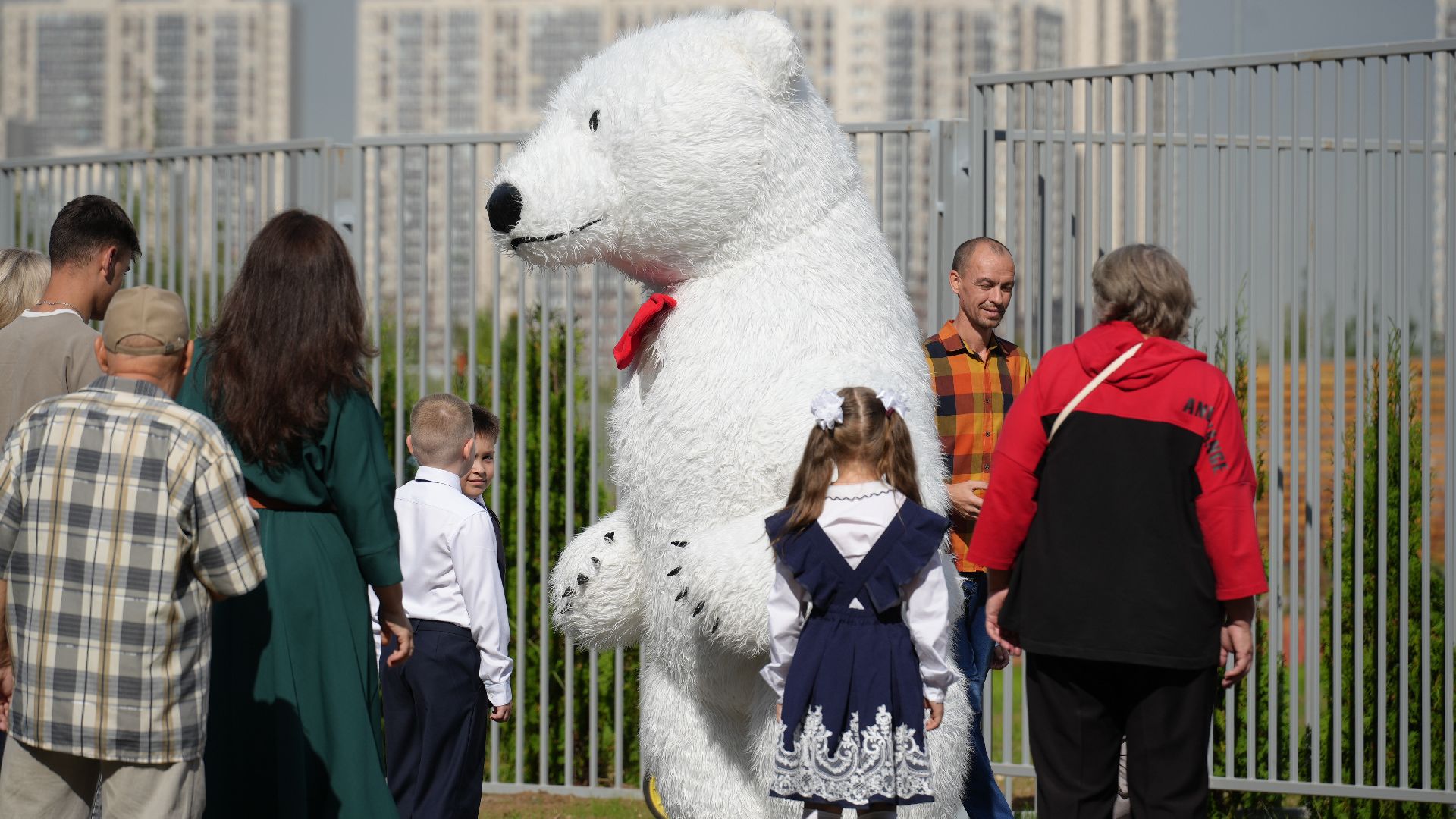 Гости стали собираться задолго до торжественной линейки. Первоклассников встречал весёлый белый медведь. Он поздравлял малышей и, конечно, был не против сделать с каждым желающим памятное фото. У дверей школы нарядных школьников ждали их первые учителя.