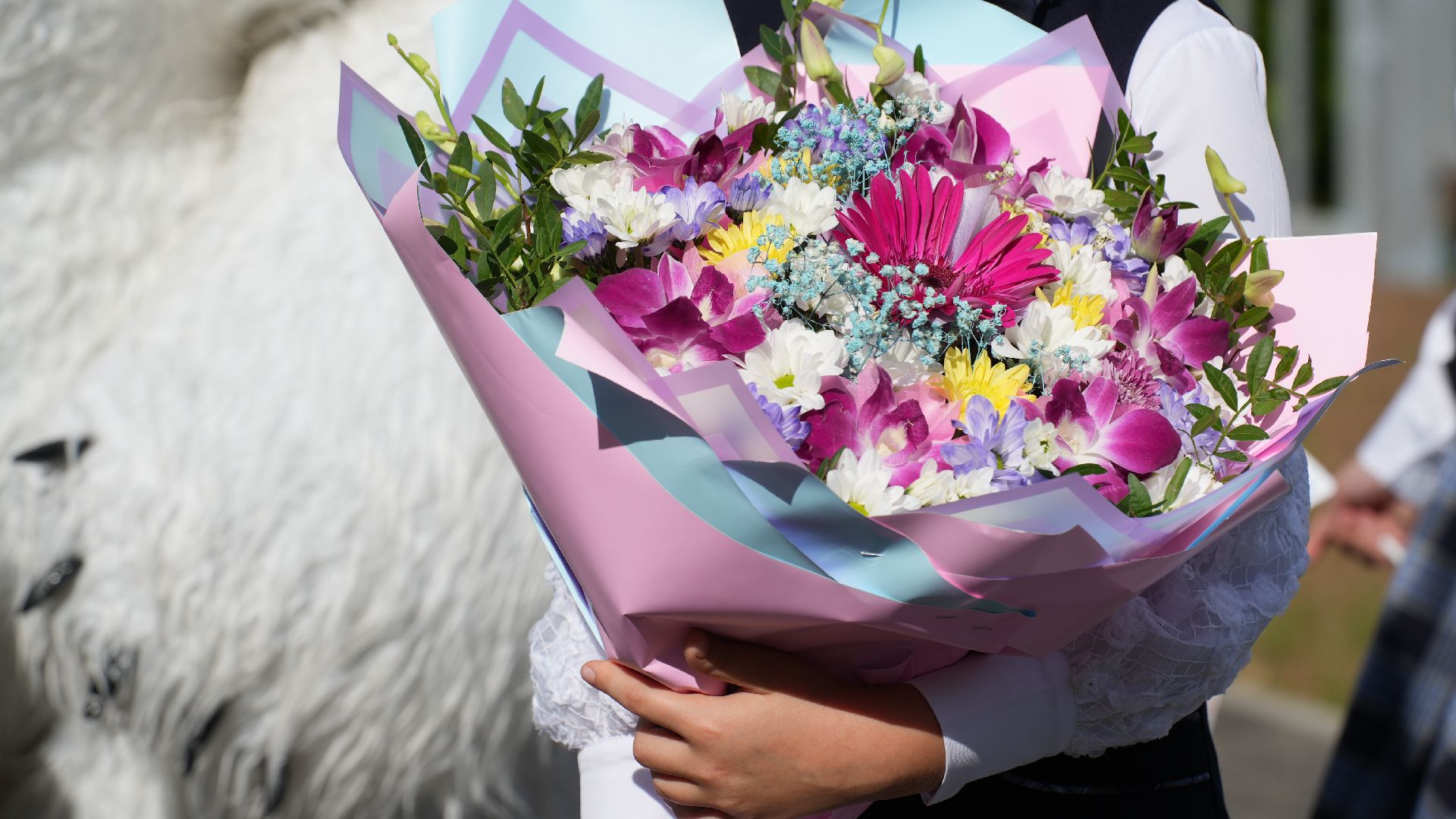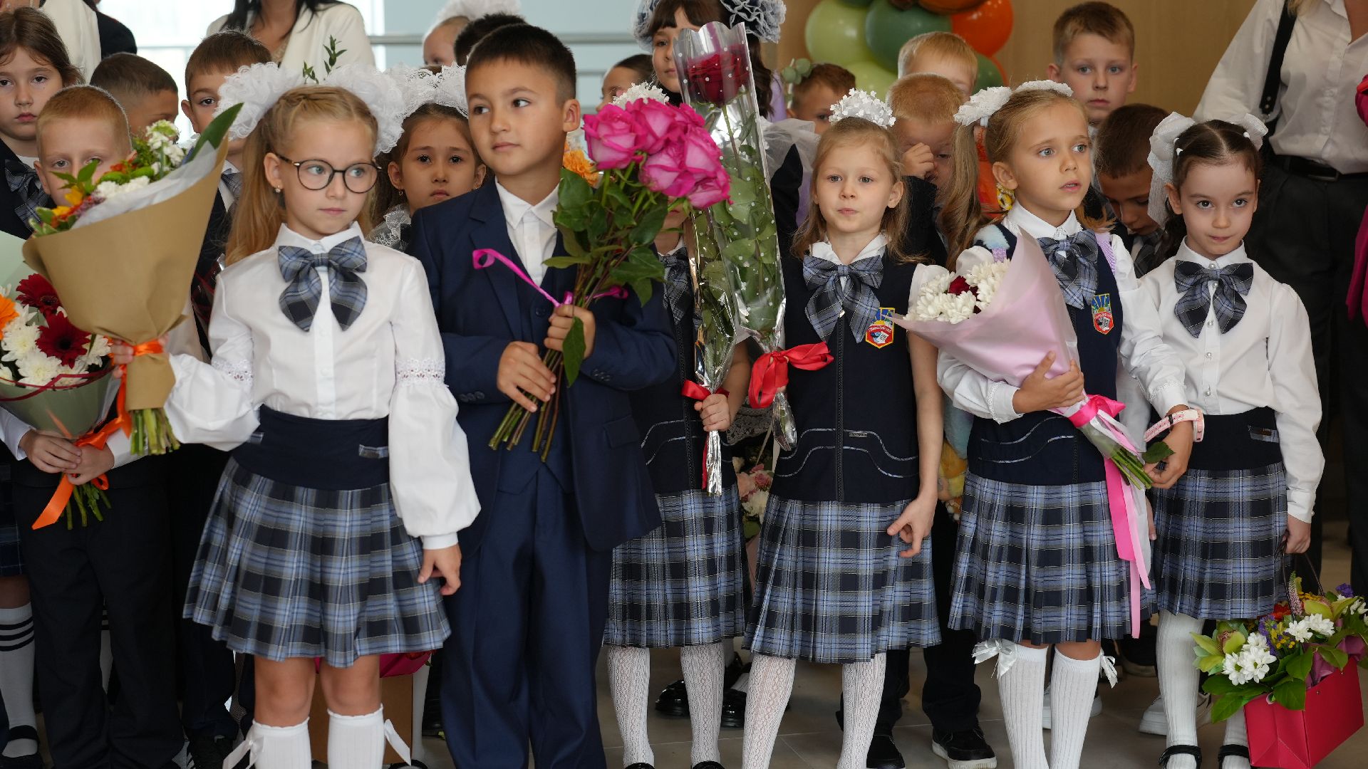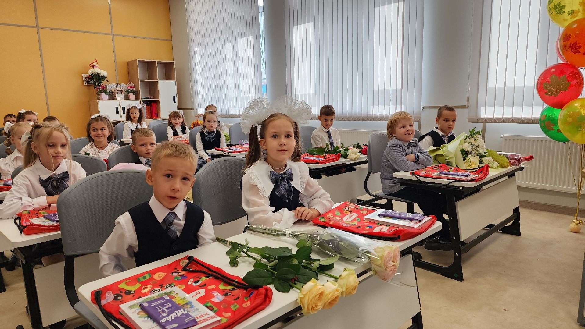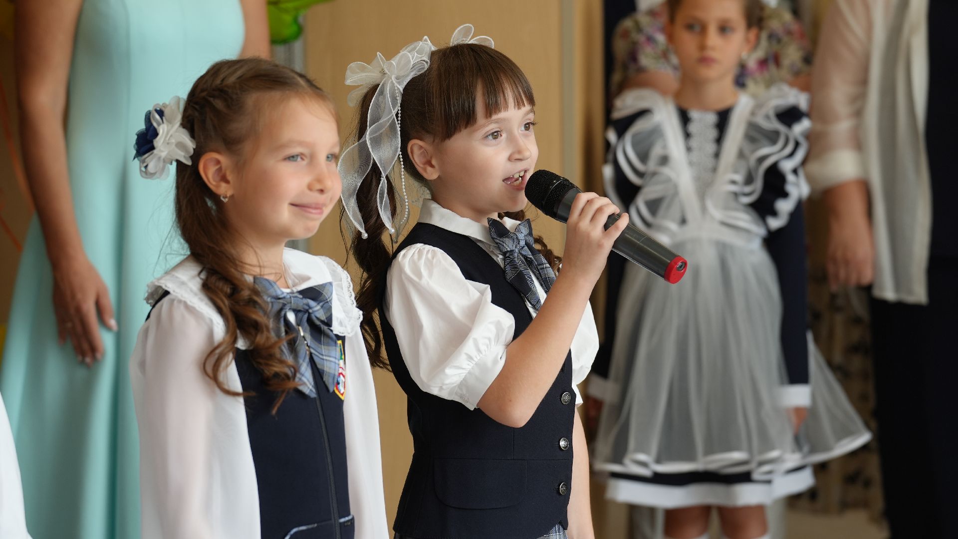 Гости стали собираться задолго до торжественной линейки. Первоклассников встречал весёлый белый медведь. Он поздравлял малышей и, конечно, был не против сделать с каждым желающим памятное фото. У дверей школы нарядных школьников ждали их первые учителя.