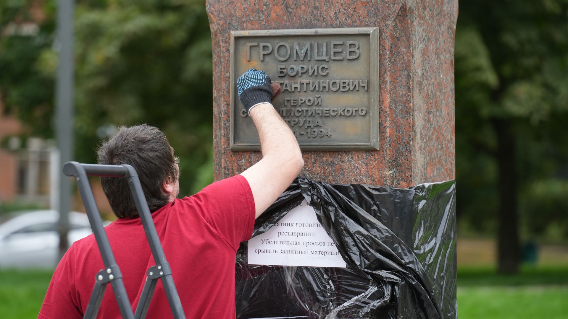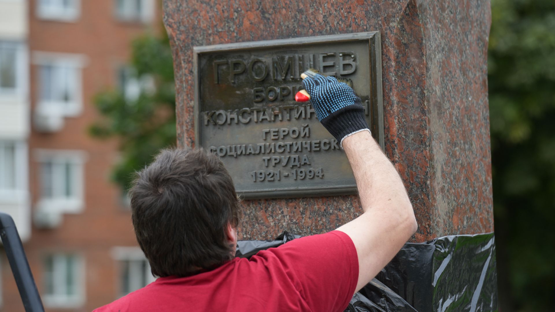 Как пояснила депутат Люберецкого совета депутатов Екатерина Исаева, по завершению черновых работ при реконструкции сквера Громцева памятник вернули на прежнее место. Внешний вид памятника тоже нужно было обновить, поэтому инициативная депутатская группа обратилась к скульптору Александру Рожникову за консультацией. Тот отметил, что изменения характерны для бронзы, и они легко поддаются реставрации.