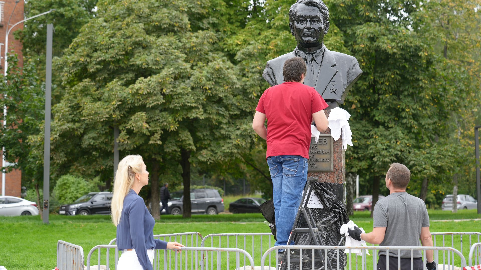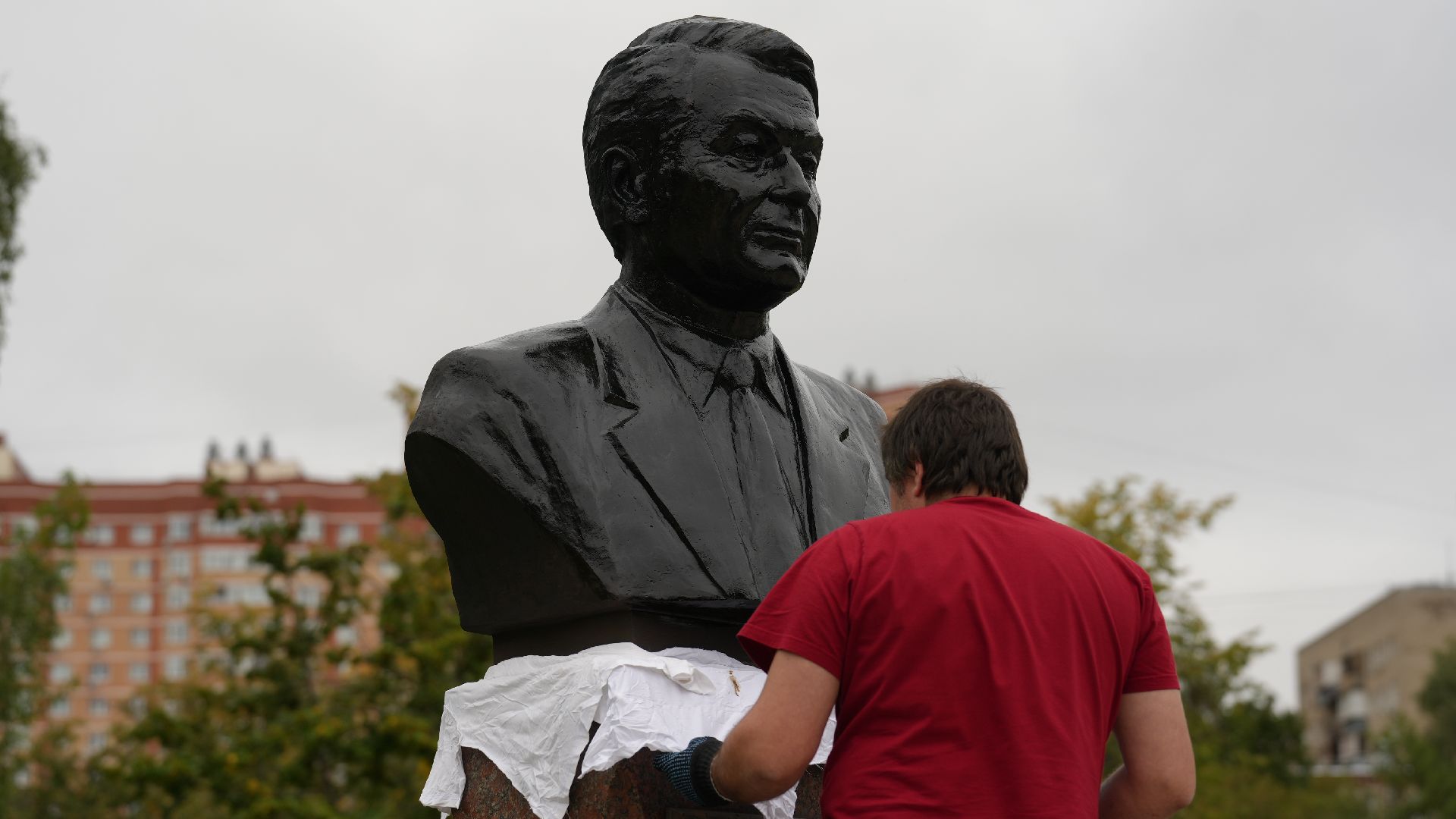 Сейчас памятник уже стоит на своём месте, работа идёт параллельно и над реконструкцией бюста, и постамента. После предварительного нагрева специалисты-реставраторы покрывают скульптуру защитными химическими составами. Финишный слой — смесь пчелиного воска и скипидара. Именно он придаст памятнику обновлённый вид.