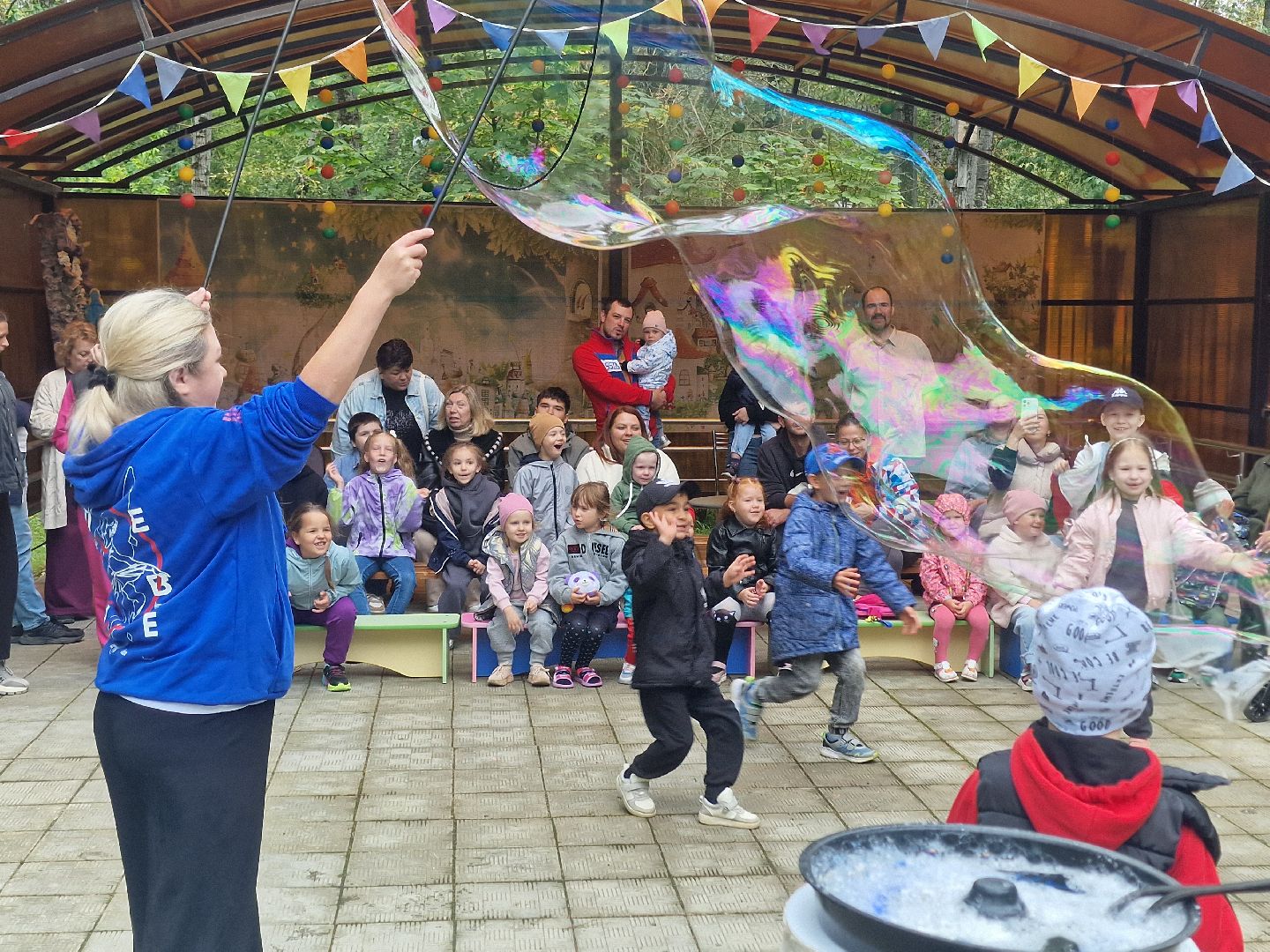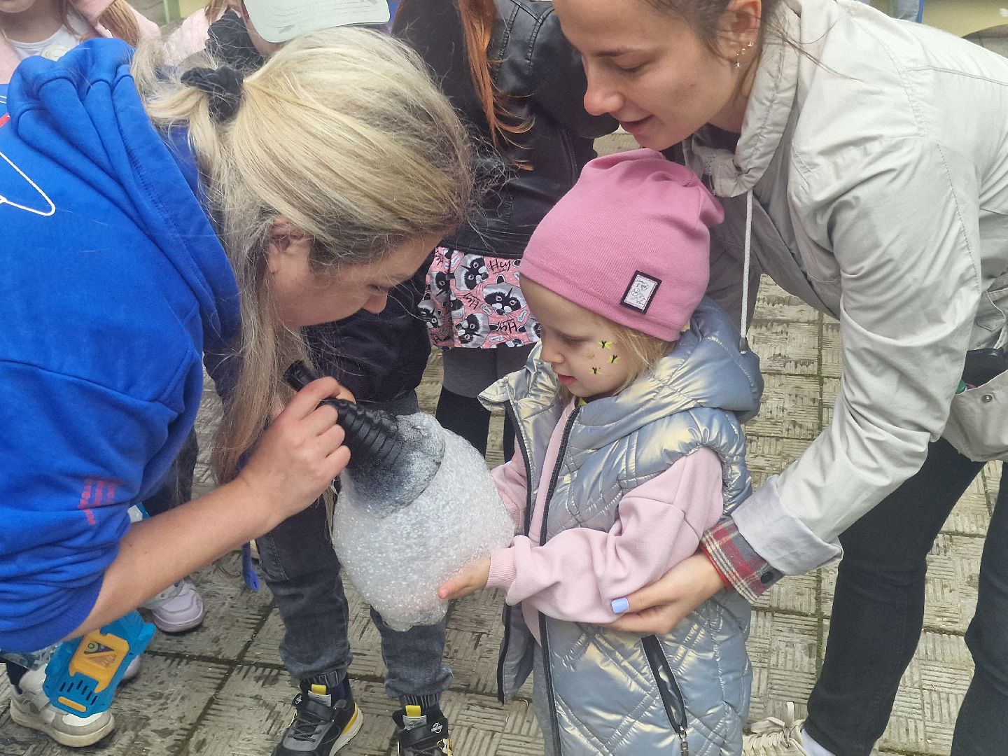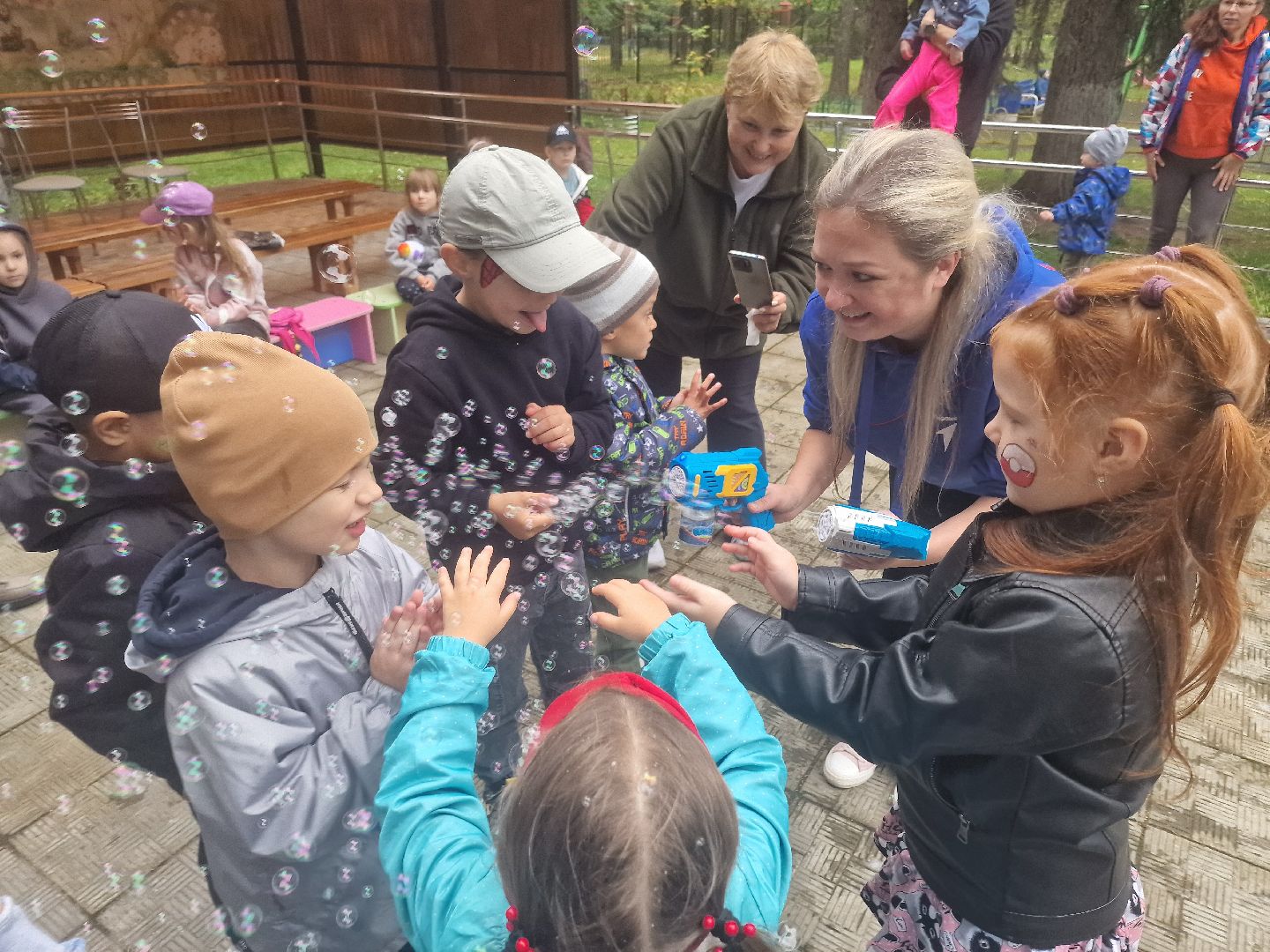 Главной волшебницей праздника стала организатор благотворительного проекта «Дари тепло» Кира Крылова, которая предстала перед детьми в образе феи мыльных пузырей. Она показала шоу, наполнившее двор переливающимся чудом. Её юные помощницы из школьного волонтёрского отряда «Вместе мы сила» рисовали детям аквагрим.