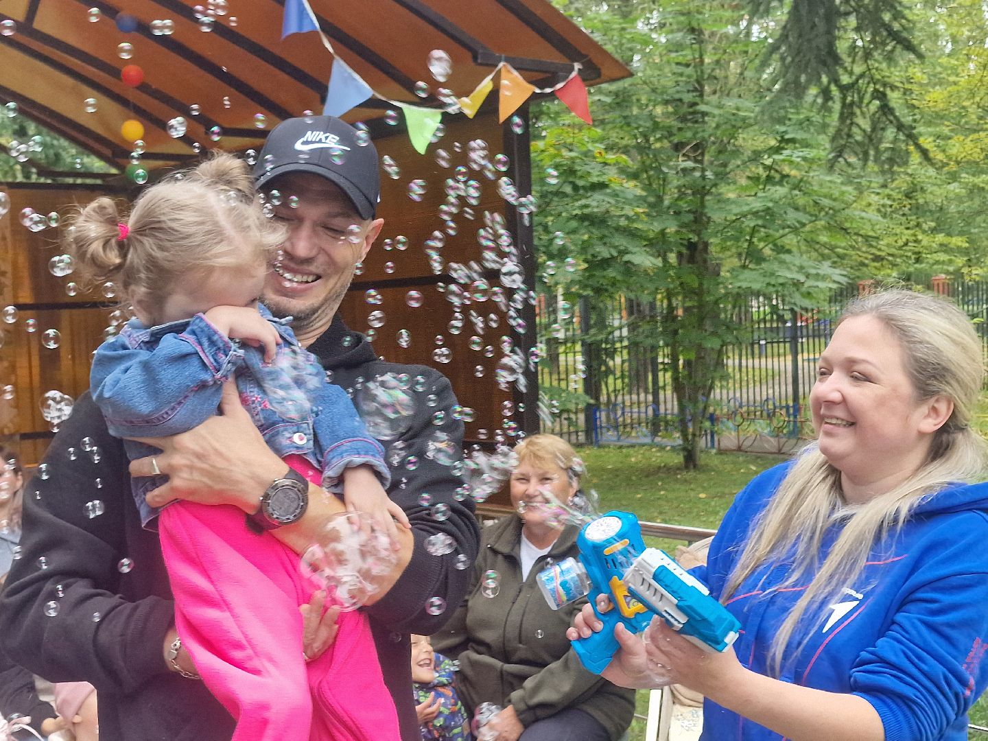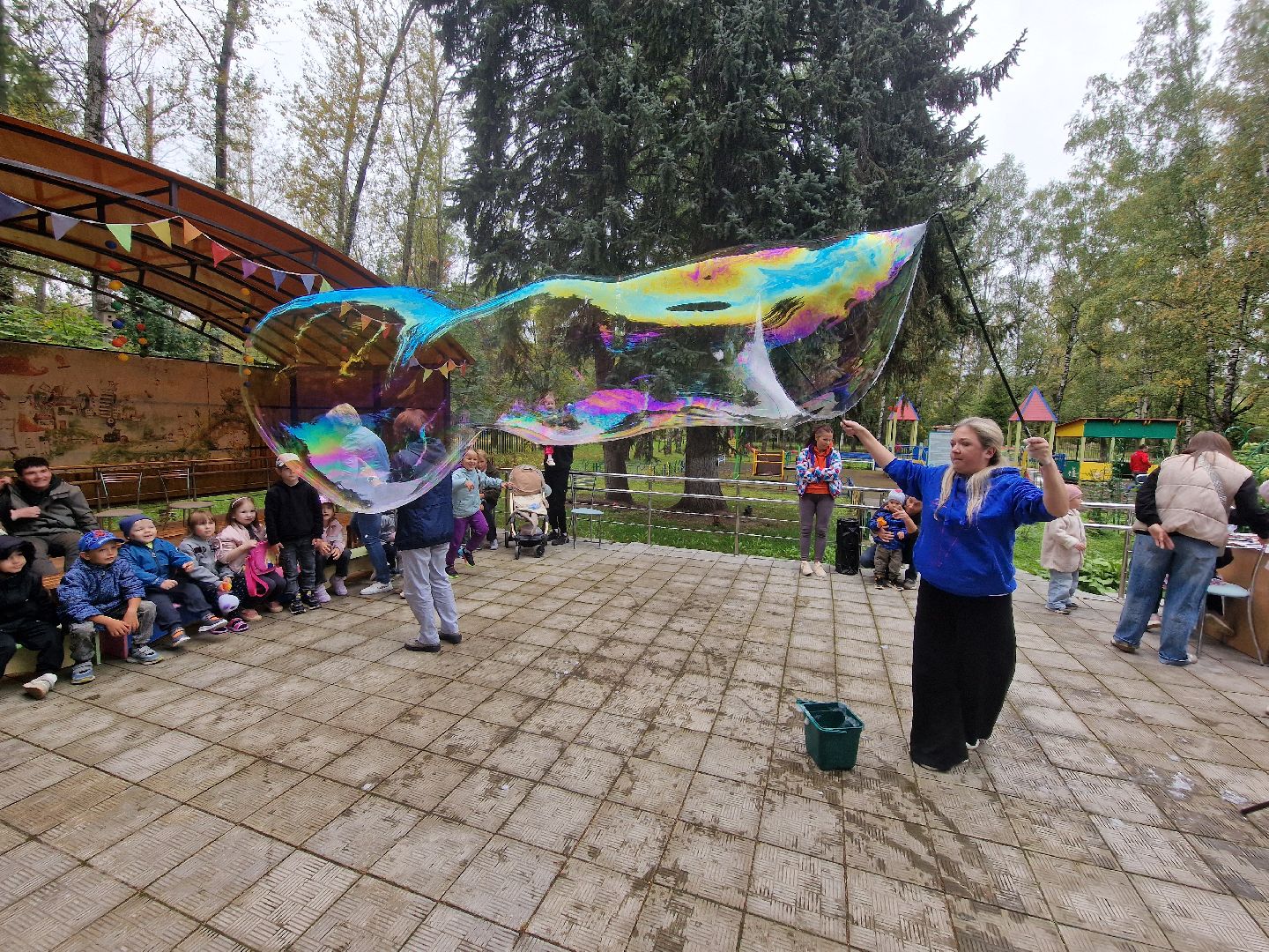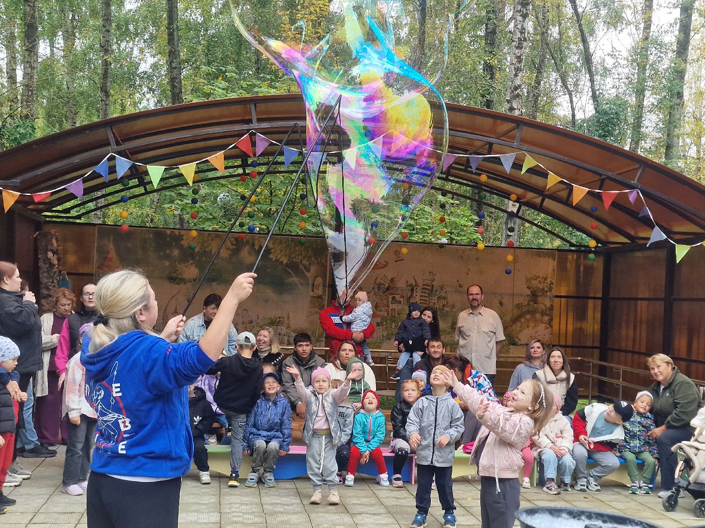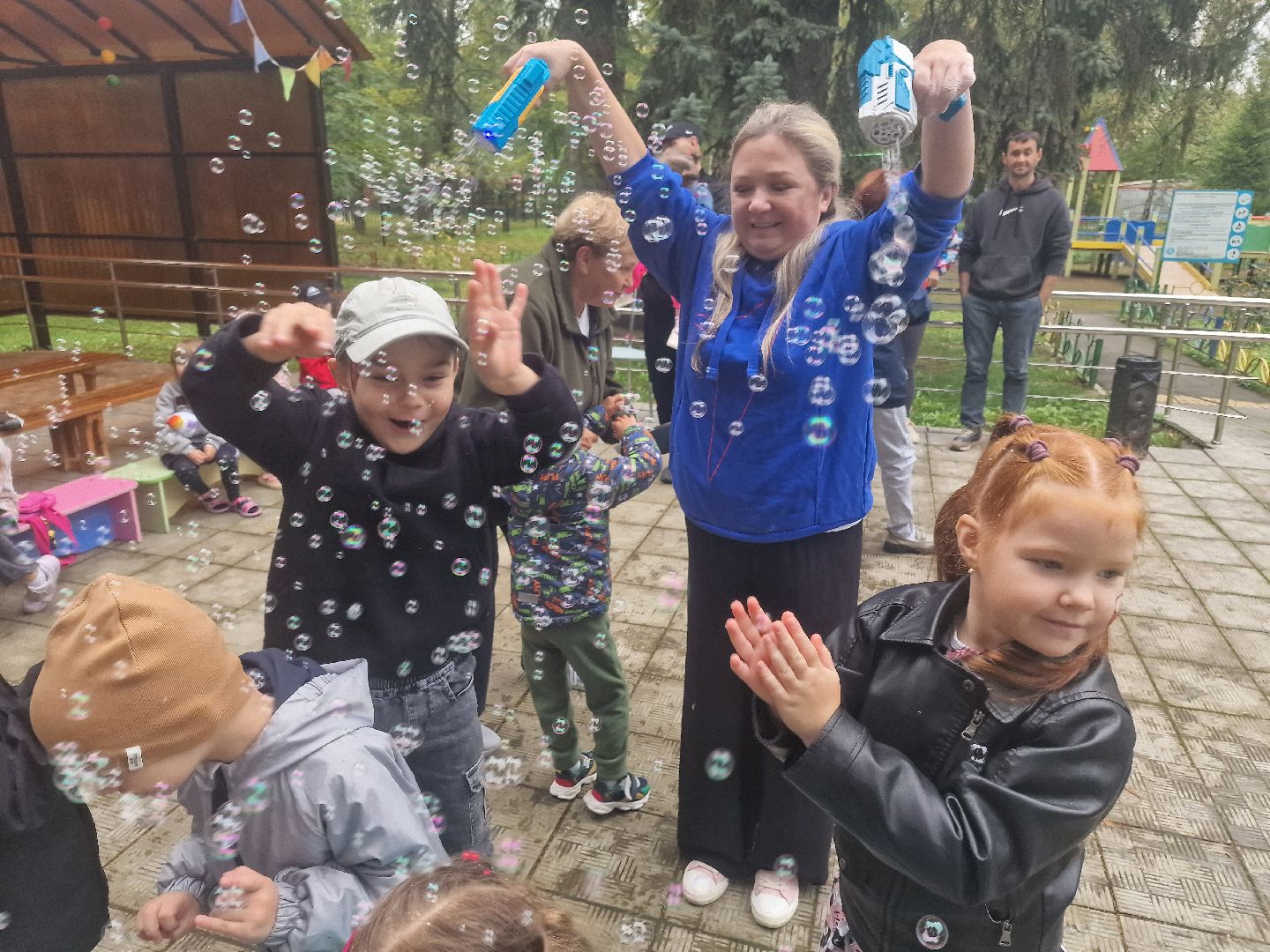 Главной волшебницей праздника стала организатор благотворительного проекта «Дари тепло» Кира Крылова, которая предстала перед детьми в образе феи мыльных пузырей. Она показала шоу, наполнившее двор переливающимся чудом. Её юные помощницы из школьного волонтёрского отряда «Вместе мы сила» рисовали детям аквагрим.