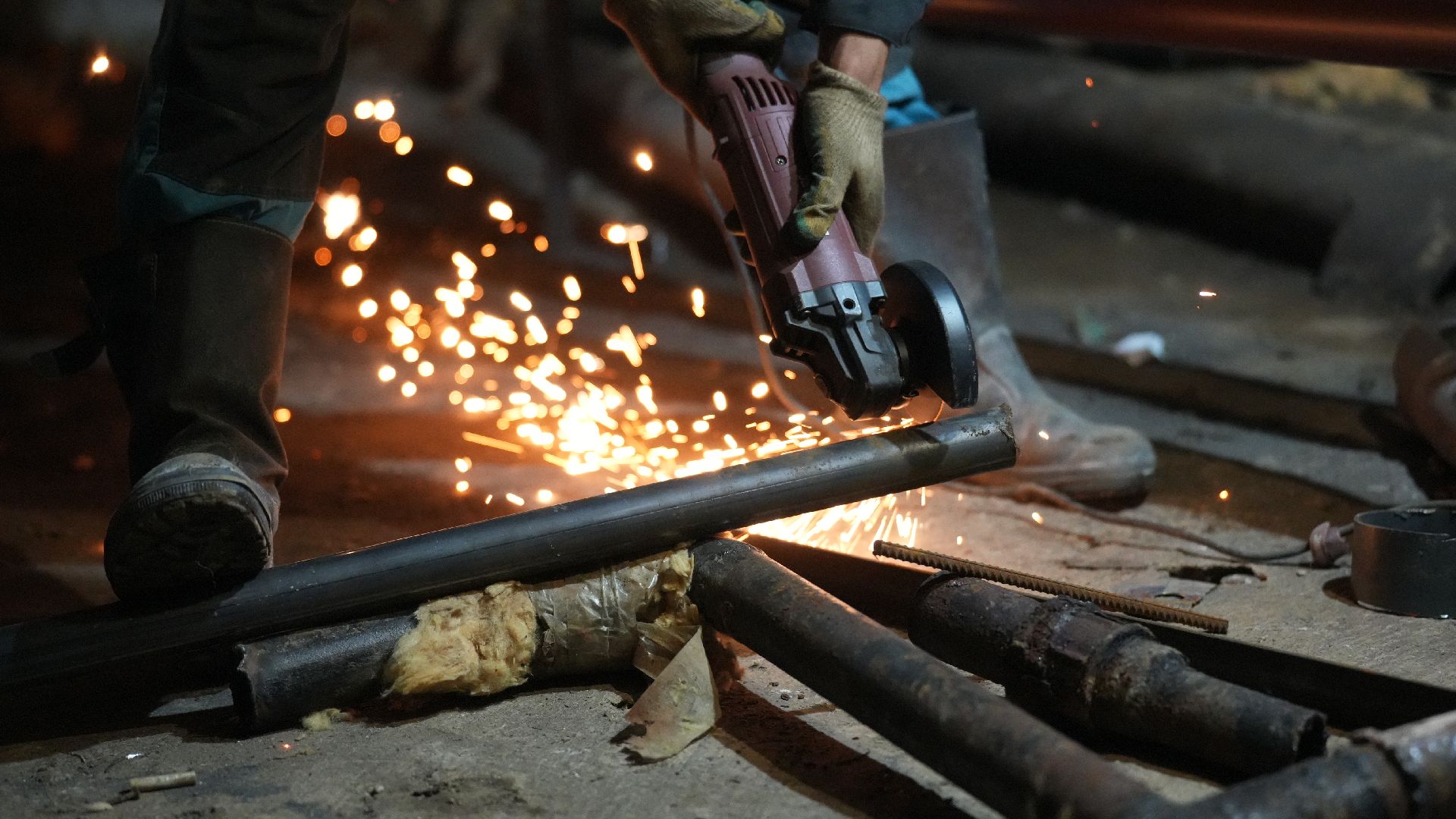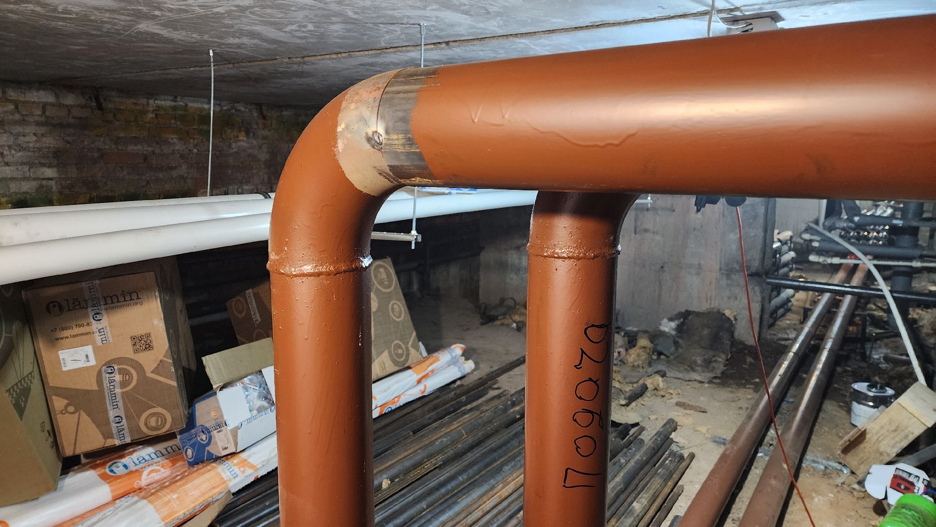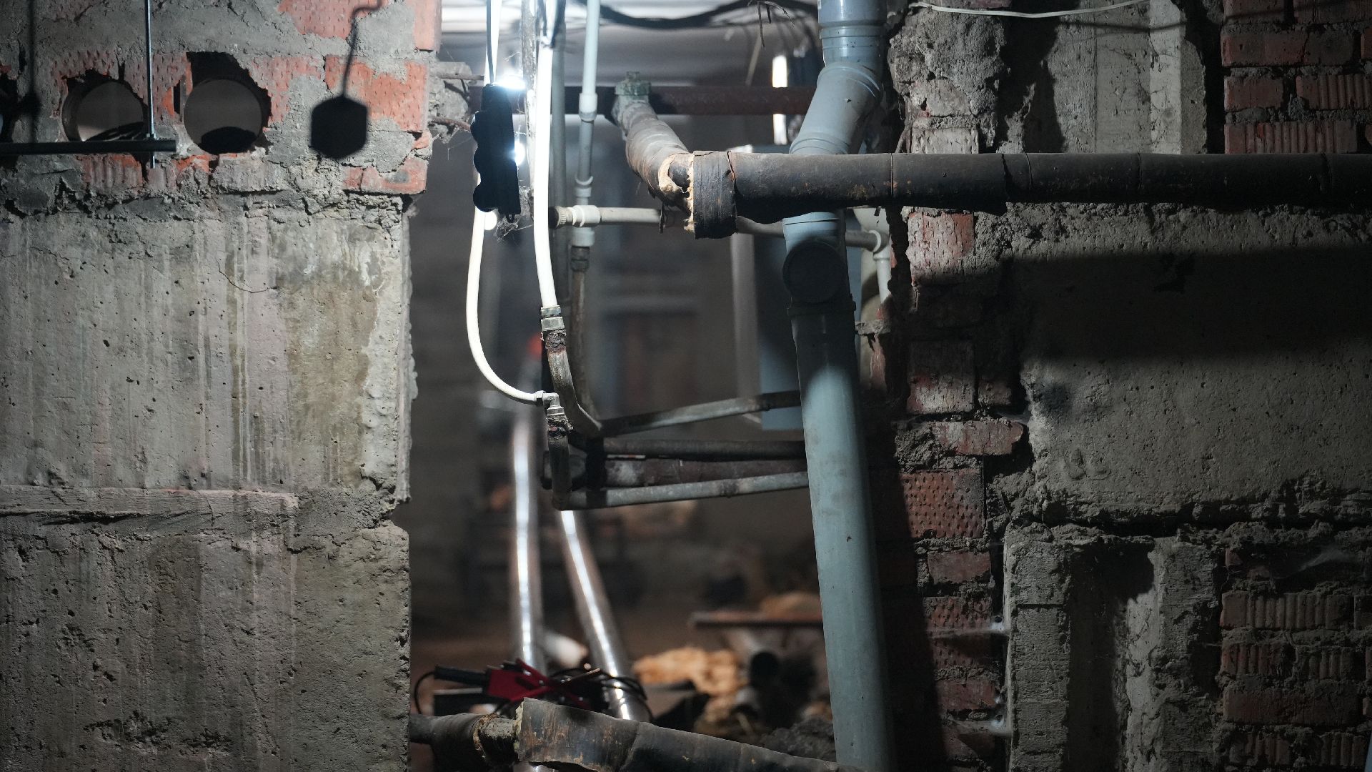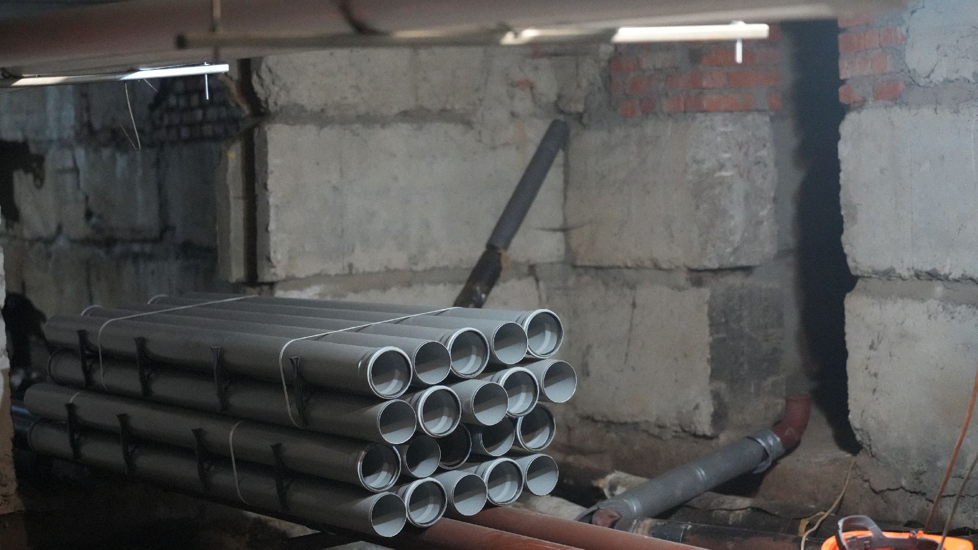 Сейчас рабочие заняты в подвале, здесь они демонтируют старые трубопроводы системы центрального отопления и параллельно монтируют магистрали отопления, холодного и горячего водоснабжения.