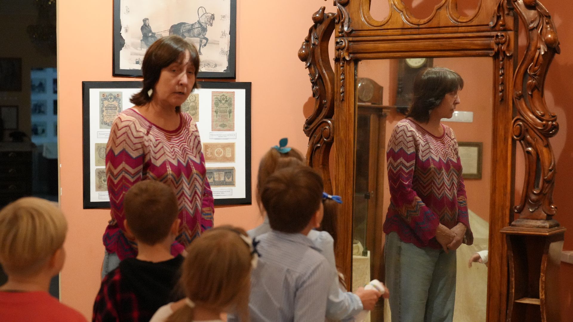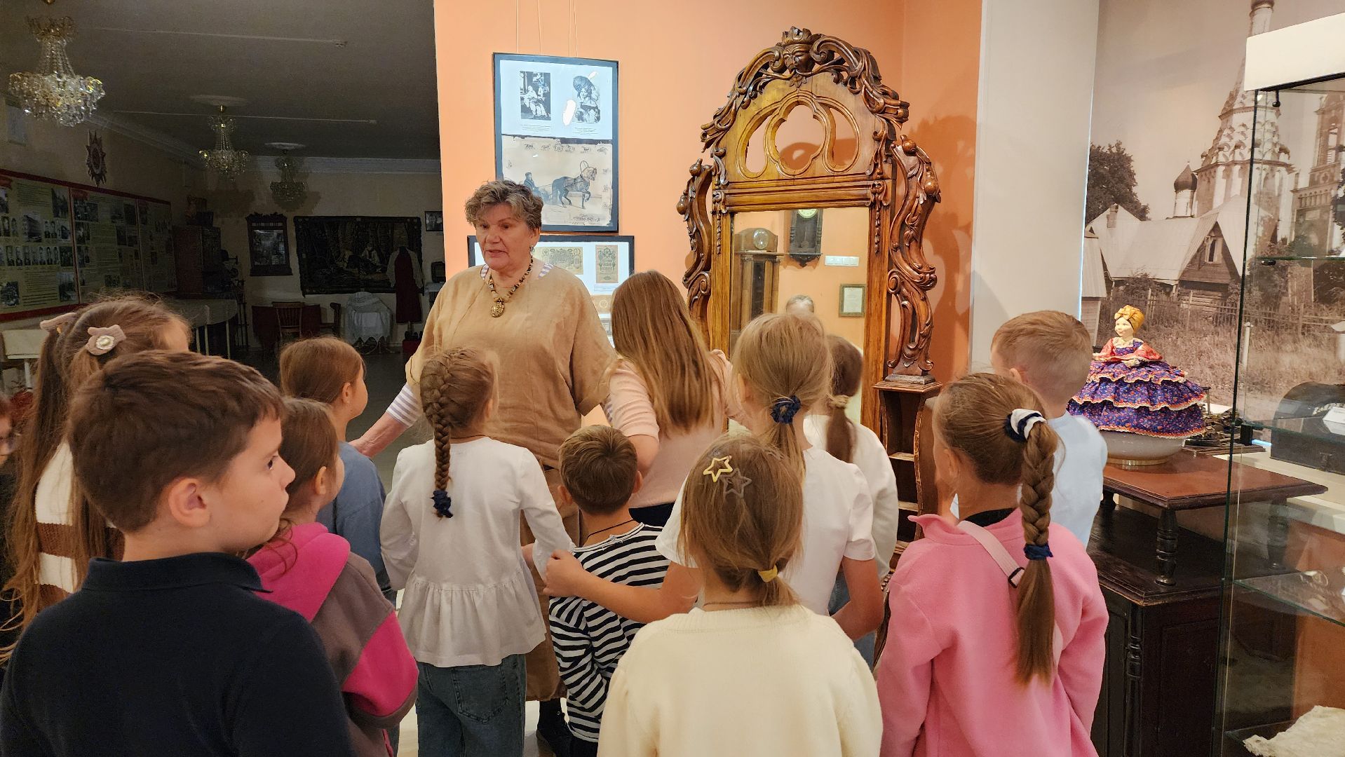 Ещё одним экспонатом, заворожившим ребят, стало старинное зеркало, изготовленное во Франции. Оно принадлежало семье графа Алексея Орлова и когда-то стояло в его усадьбе в селе Остров.