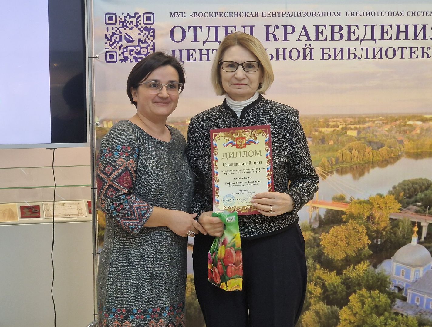 В отделе краеведения центральной библиотеки им. Инны Гофф 16 октября прошло награждение победителей второго окружного конкурса краеведческих работ «Прогулки по Воскресенску». В этом году в нём участвовали 16 человек.