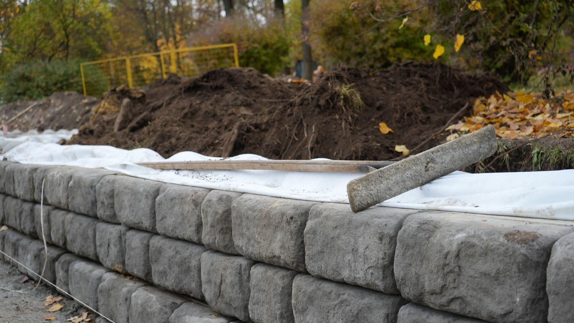 Отдельного внимания заслуживает новая подпорная стена. Строители делают её из прочных бетонных блоков, рассчитанных на долгие годы службы. Чтобы конструкция не пострадала от влаги и подвижек грунта, фундамент углубили в землю. А за счёт увеличенной высоты стены дождь больше не будет размывать почву и пачкать тротуары грязью.