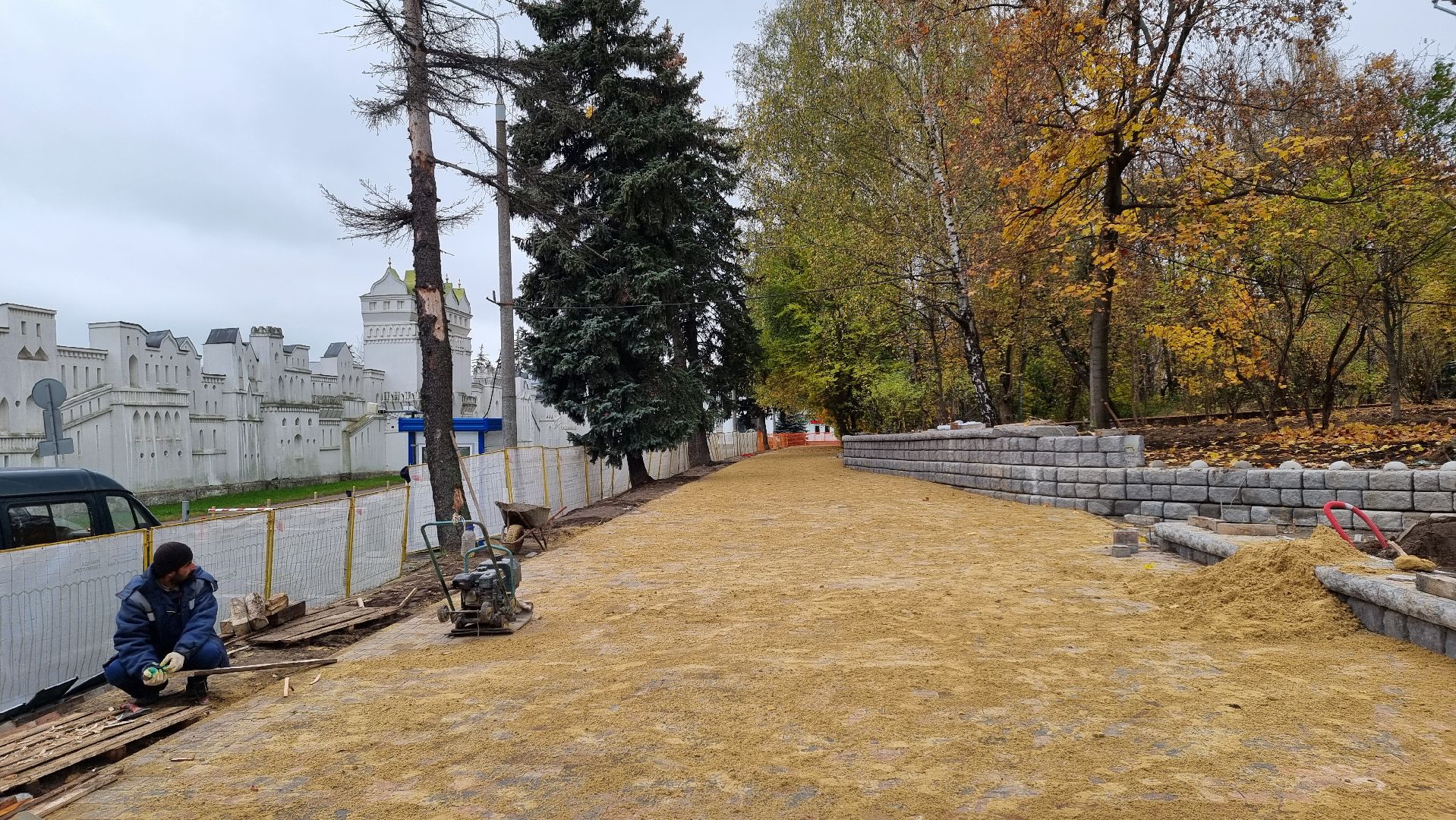 Старая опорная стена и тротуар полностью разобраны. Рабочие проложили около 45 кв. м дорожек, которые соединят сквер с соседним МФЦ в Дзержинском г. о. Люберцы. Сейчас они обустраивают больше 1000 кв. м пространства возле памятника Святителю Николаю и 220 кв. м тропинок, ведущих к проходной Федерального центра двойных технологий «Союз».