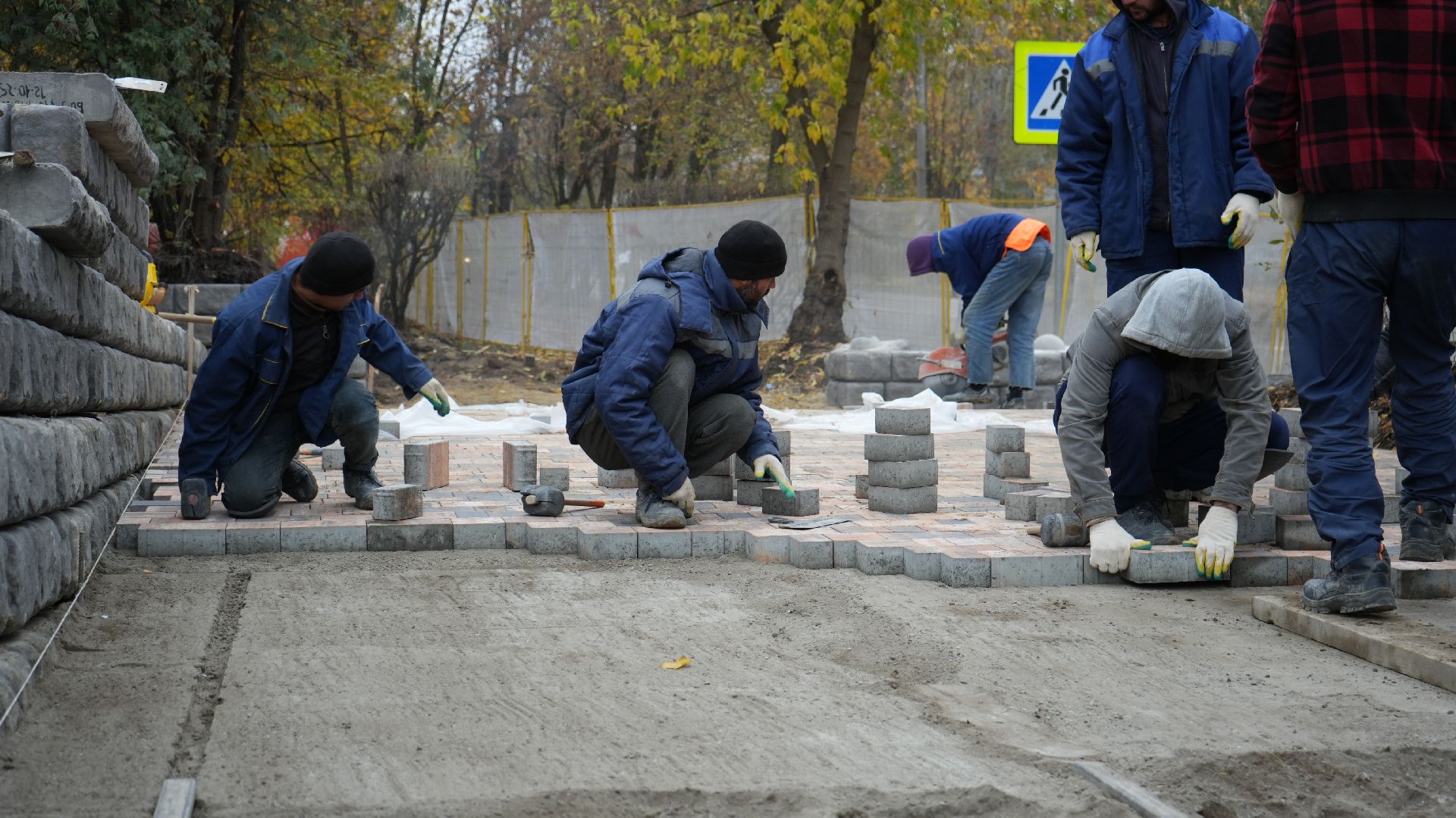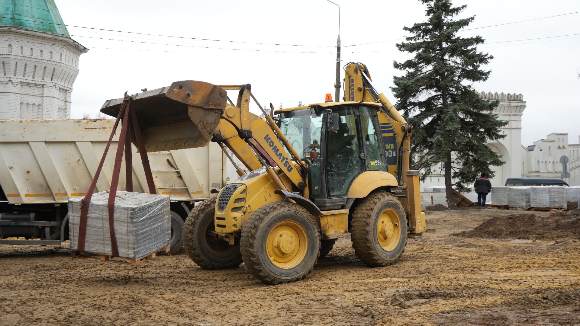 На стройке сейчас заняты больше 20 человек. Они выкладывают плитку, монтируют подпорные стенки и занимаются отделкой. Работу облегчают три погрузочные машины и КамАЗы — они регулярно подвозят материалы и оборудование.