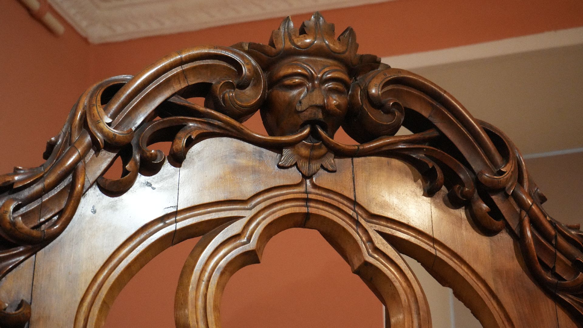 Габариты зеркала весомые: высота — 2,3 метра, ширина — 1,15. Тонкая резьба изображает груши, листья и загадочную маску из растительных мотивов. Но главное — его конструкция: зеркало поворотное, а в нижних нишах рамы, вероятно, когда‑то размещались резные дверцы, закрывающие маленькие полочки, а в верхних были дополнительные зеркала — они отражали свет канделябров, создавая причудливую игру бликов.