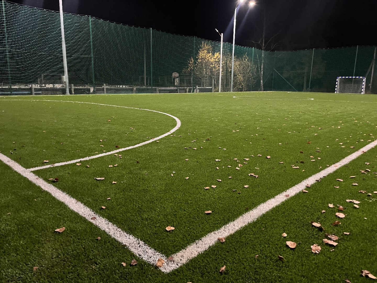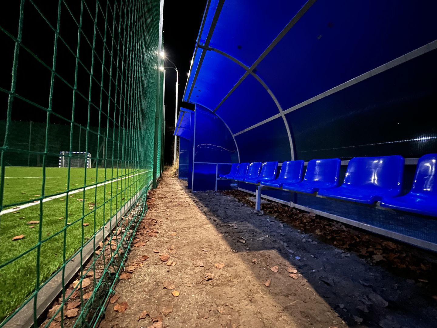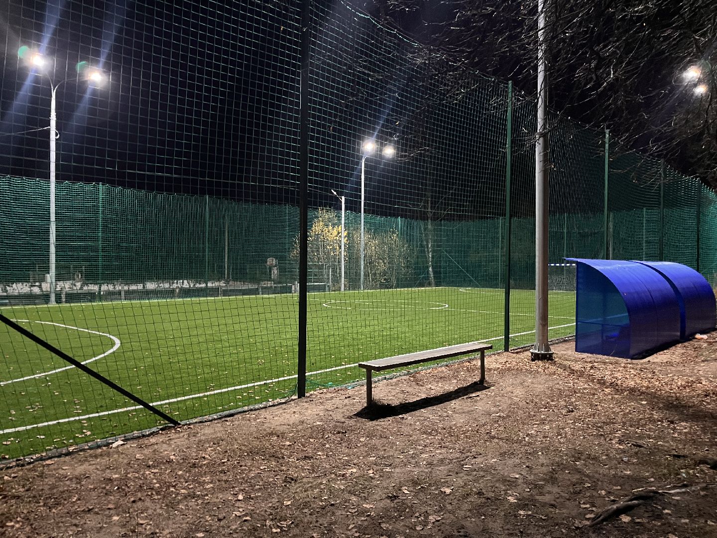 На площадке создали качественную основу, на которую уложили искусственный газон, установили осветительные опоры с защитной сеткой и футбольные ворота. Также предусмотрели скамьи для запасных игроков с навесом.