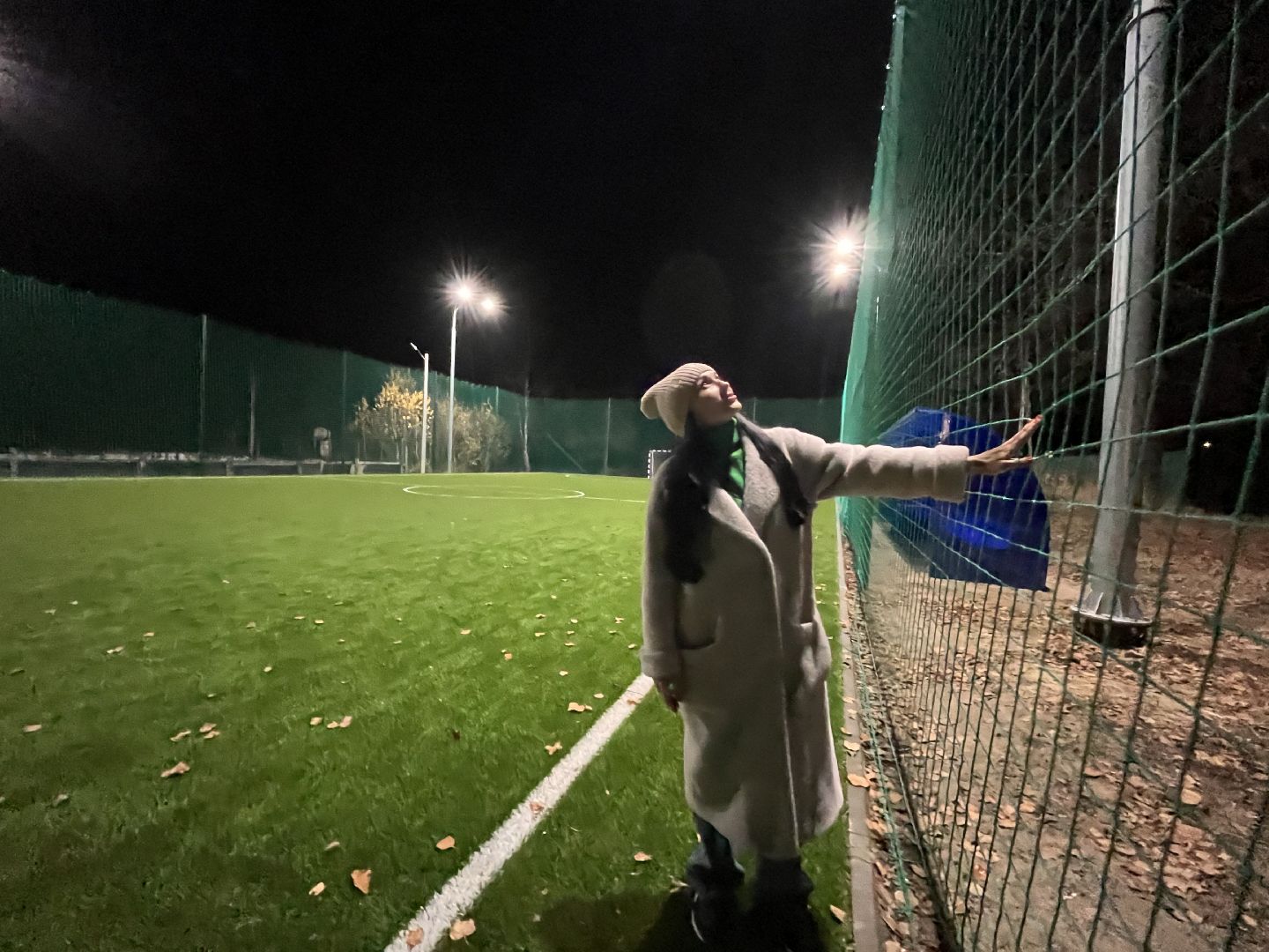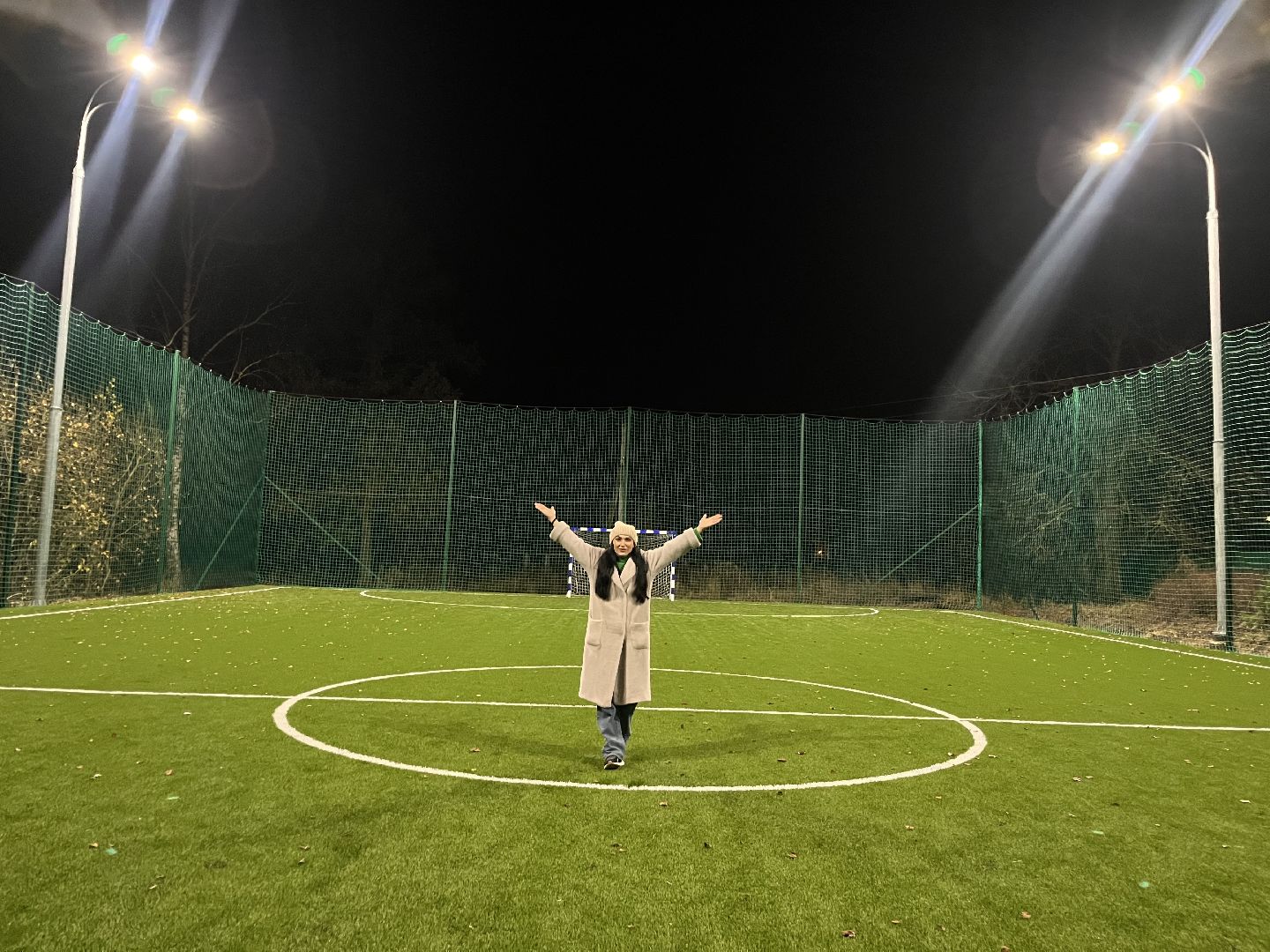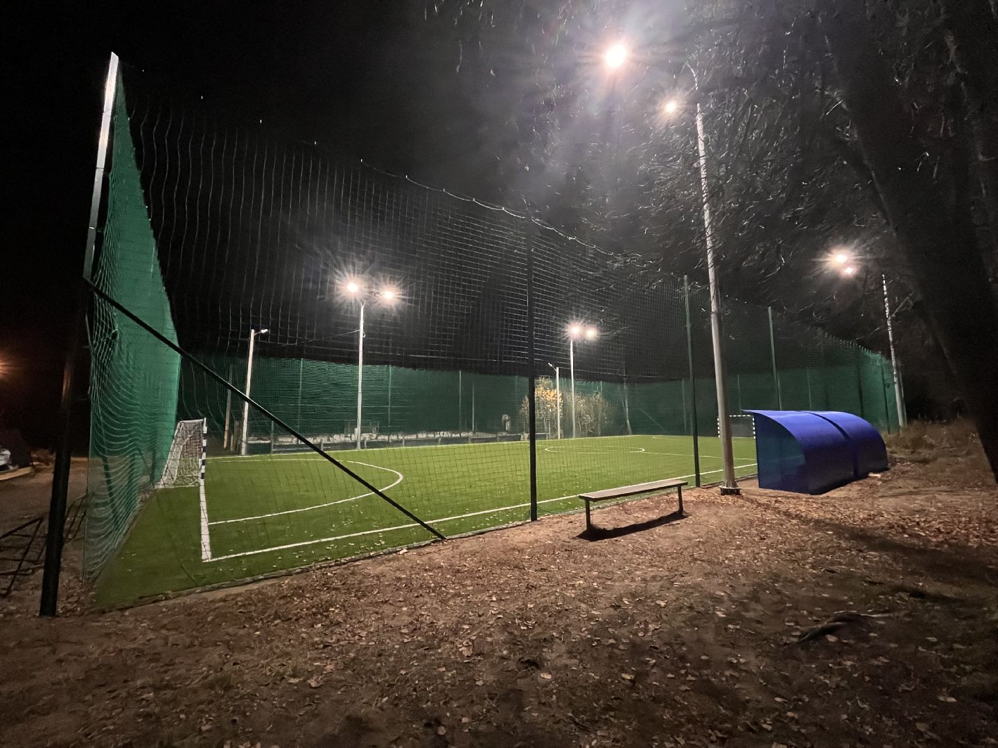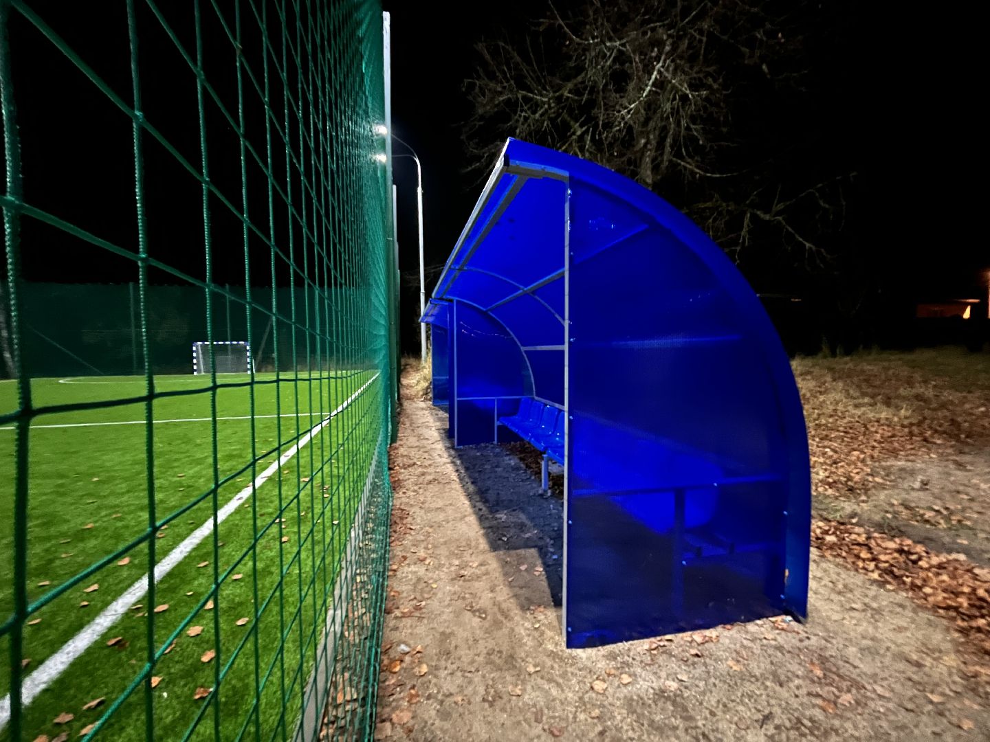На площадке создали качественную основу, на которую уложили искусственный газон, установили осветительные опоры с защитной сеткой и футбольные ворота. Также предусмотрели скамьи для запасных игроков с навесом.