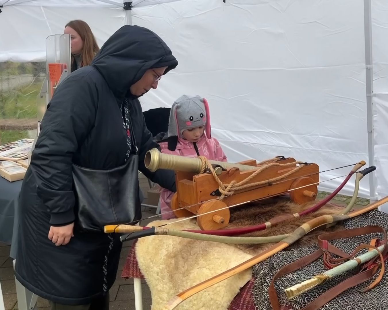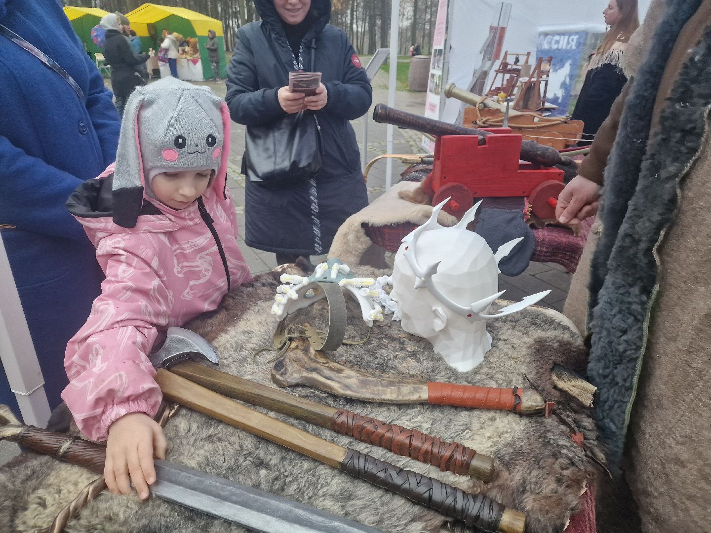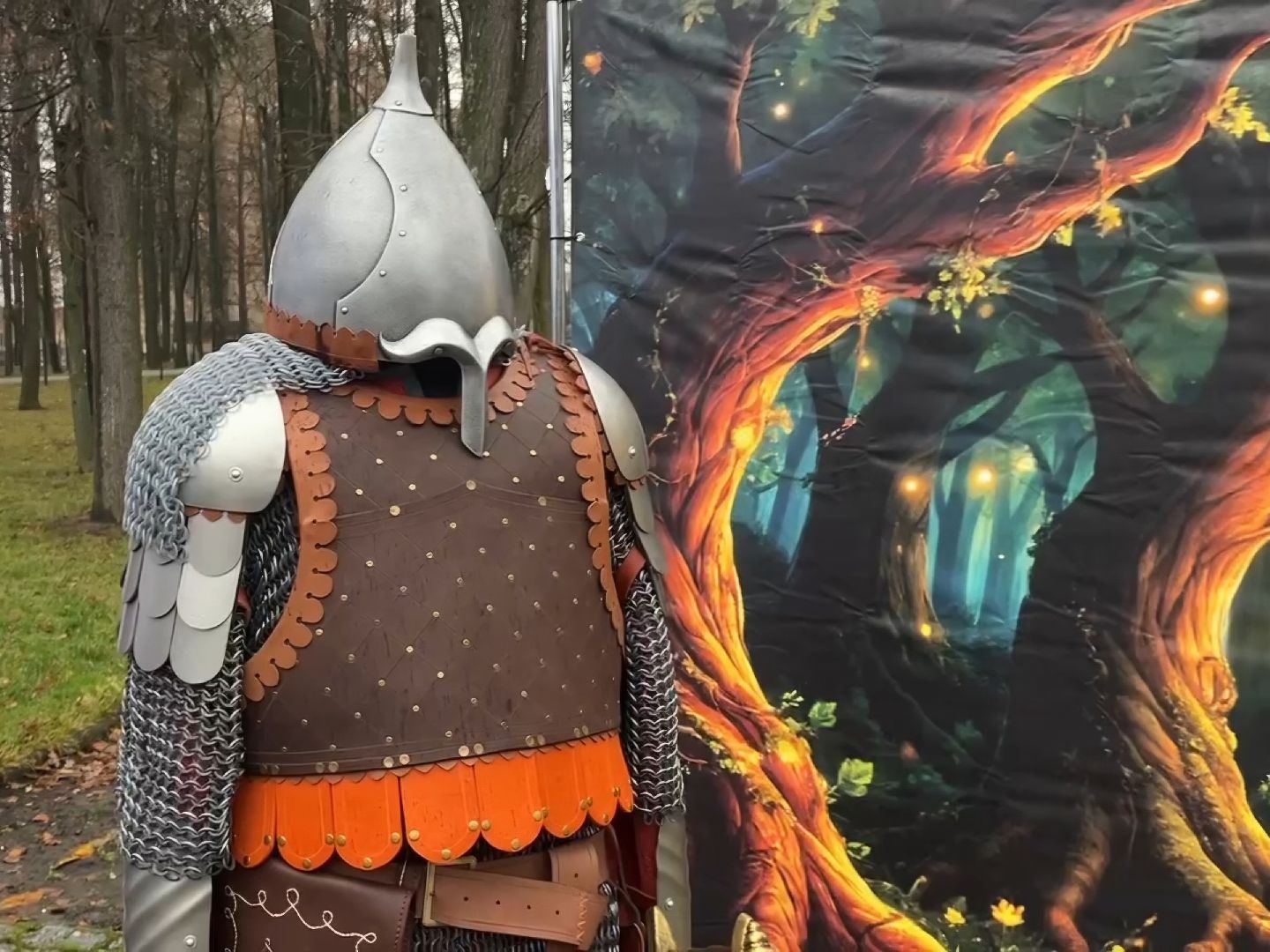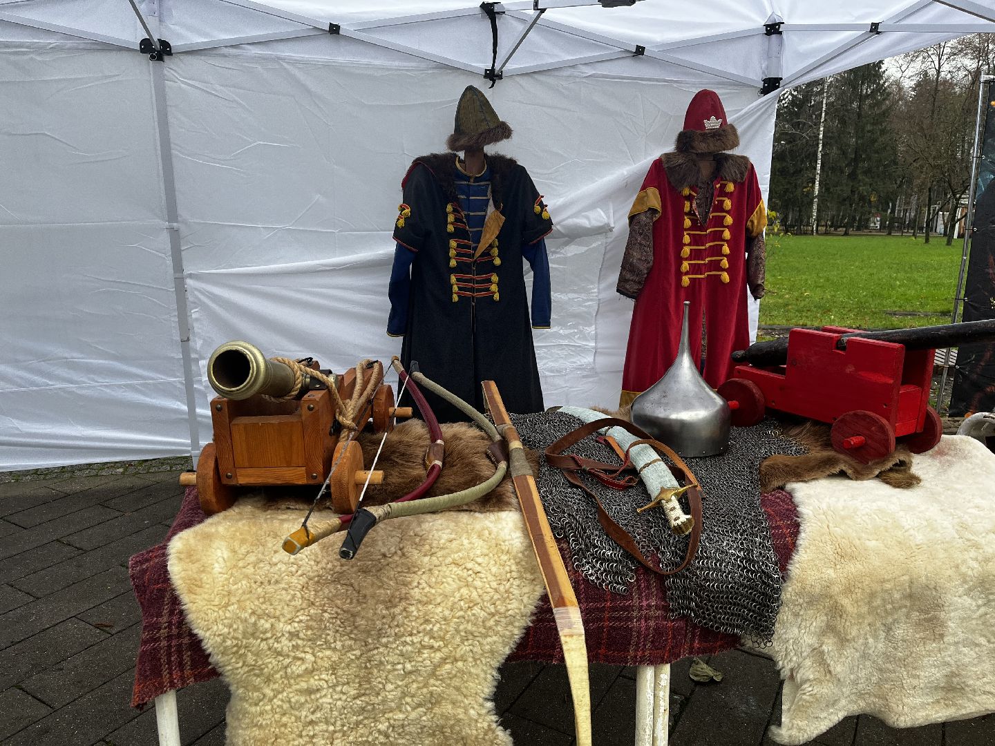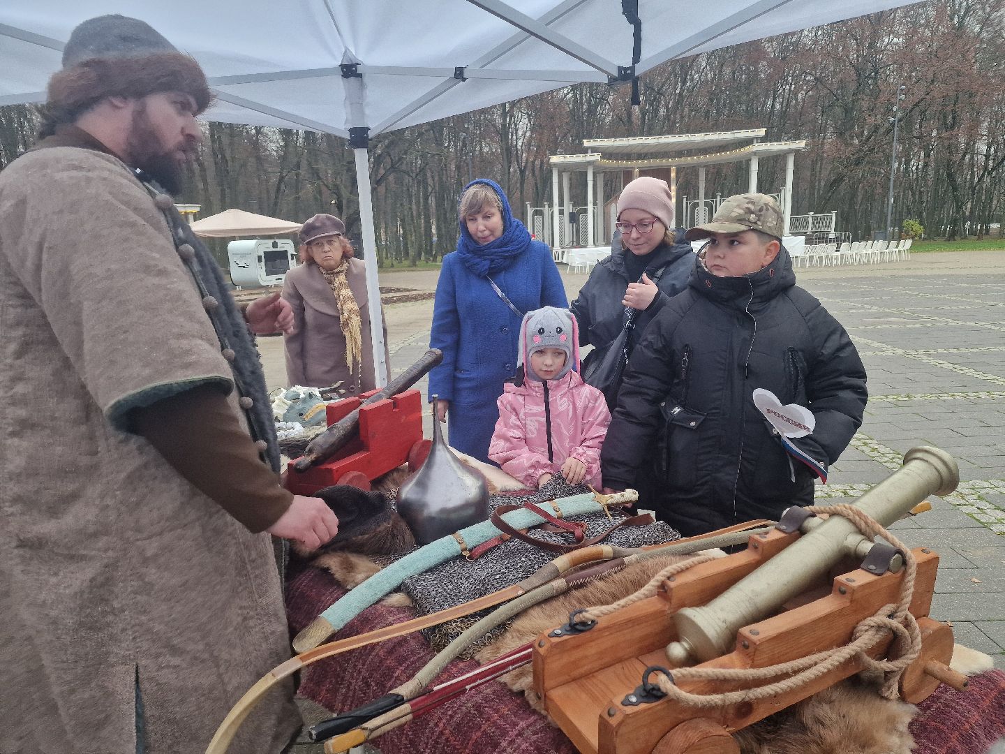 Гости парка могли в деталях рассмотреть доспехи и вооружение воинов X-XVII веков. Центральными экспонатами стали боярский костюм и обмундирование стрелецкого сотника, представленные на манекенах. Особый интерес вызвали копия старинной пушки-пищали, защитный головной убор — шелом, а также кольчуга, сабли и лук.