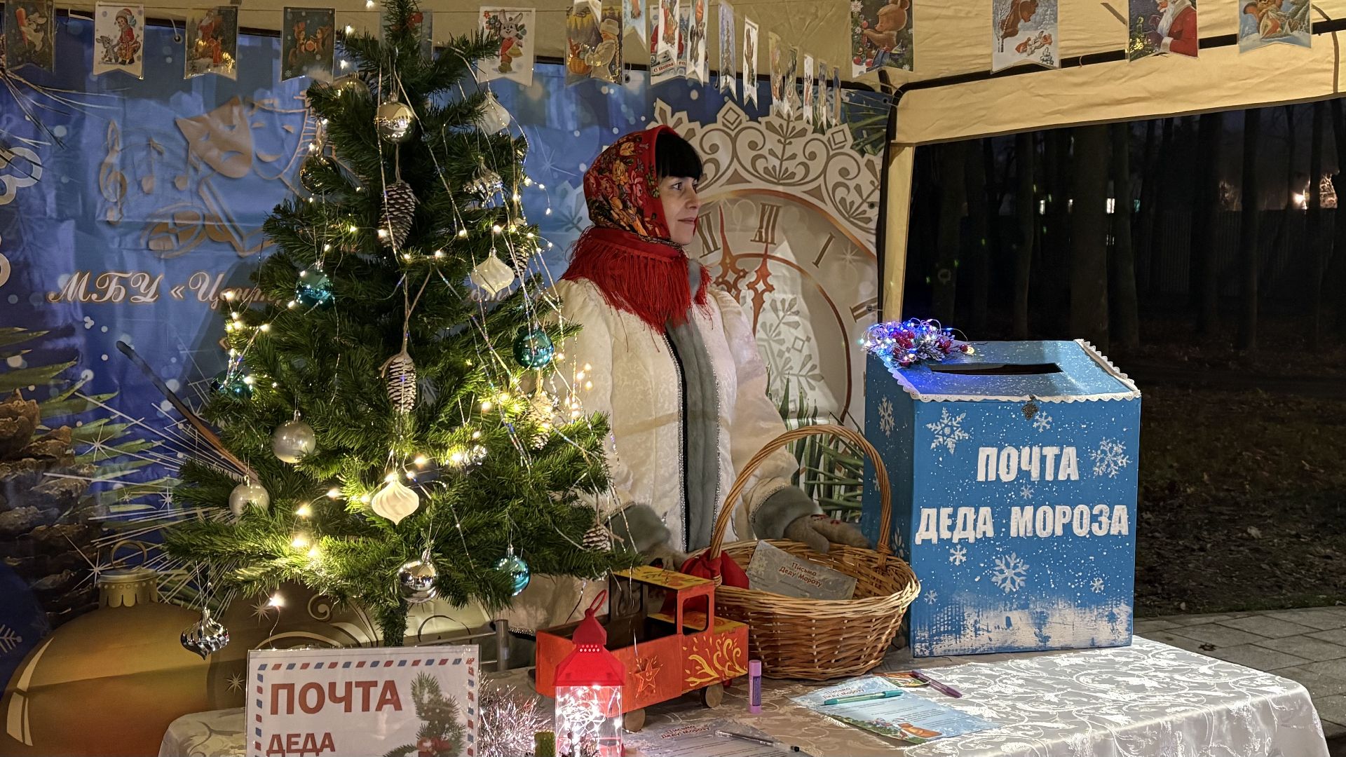 Одновременно заработала и почта Деда Мороза. В украшенном шатре детей ожидал стол со специальной бумагой и карандашами, а рядом — почтовый ящик, куда каждый мог отправить своё письмо с пожеланиями. Родители помогали сформулировать мечту, красиво оформить послание и объясняли, как письма попадают к волшебнику. Почта работала без остановки. Дети подходили снова и снова, отбоя от желающих не было.