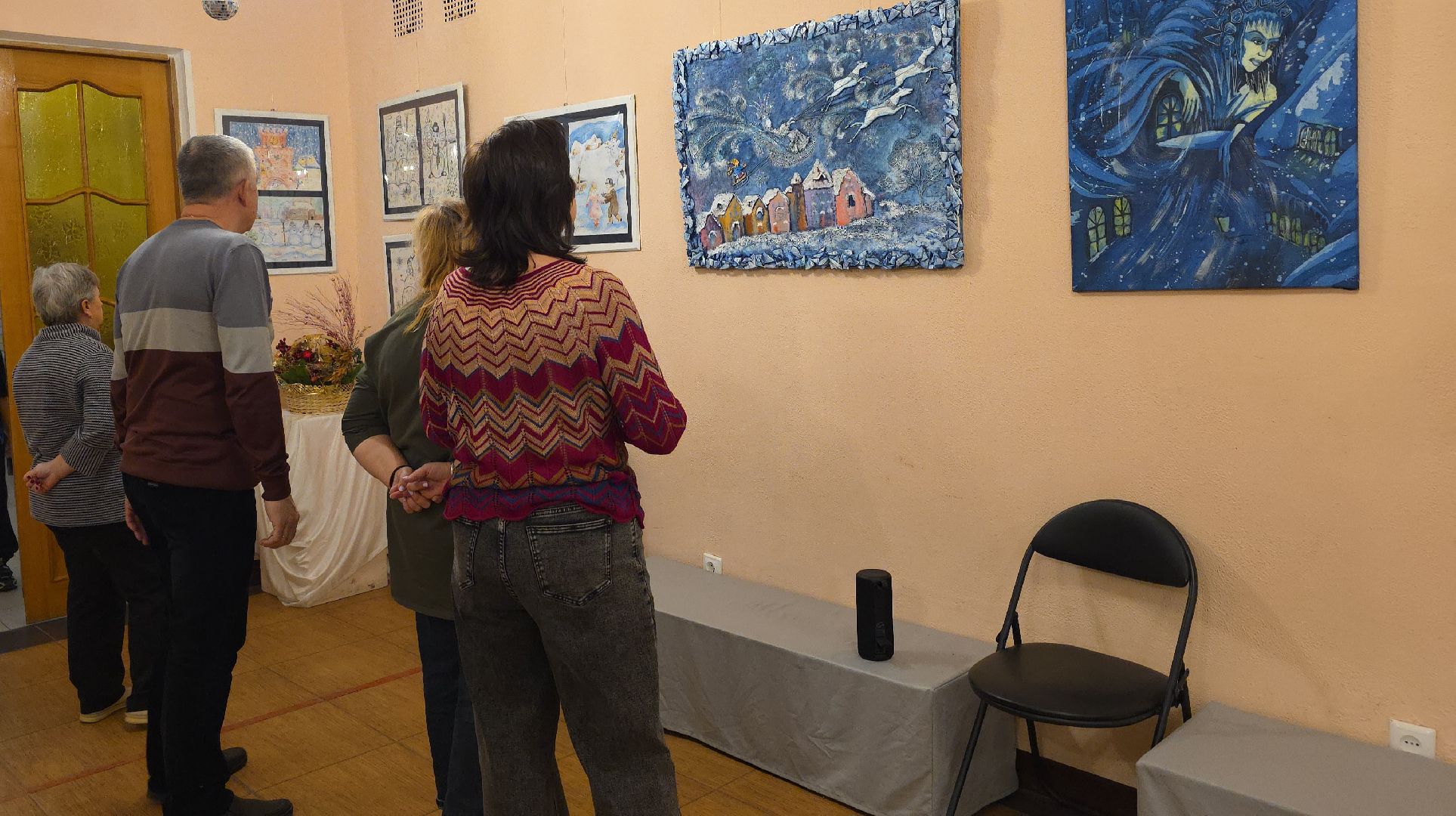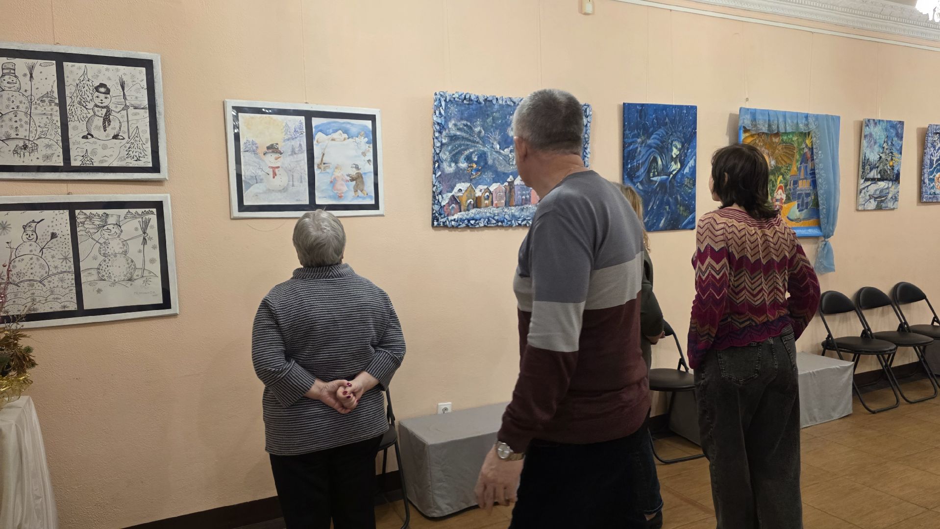 В Культурно-эстетическом центре Дзержинского городского округа Люберцы зажглись ёлочные гирлянды, а выставочные залы превратились в страну сказок. На стенах — «Снежная королева» юных мастеров: тонкие линии горячего батика, превратившие шёлк в ледяной сюжет. Рядом «Щелкунчик» — холодный батик, дополненный куклой Машей в сшитом вручную платье и крошечной шторкой, прикрывающей раму картины, словно кадр из спектакля. А чуть дальше — лунная ночь в технике пуантилизма, собранная из тысячи цветных точек, как пазл, который складывал автор картины.
